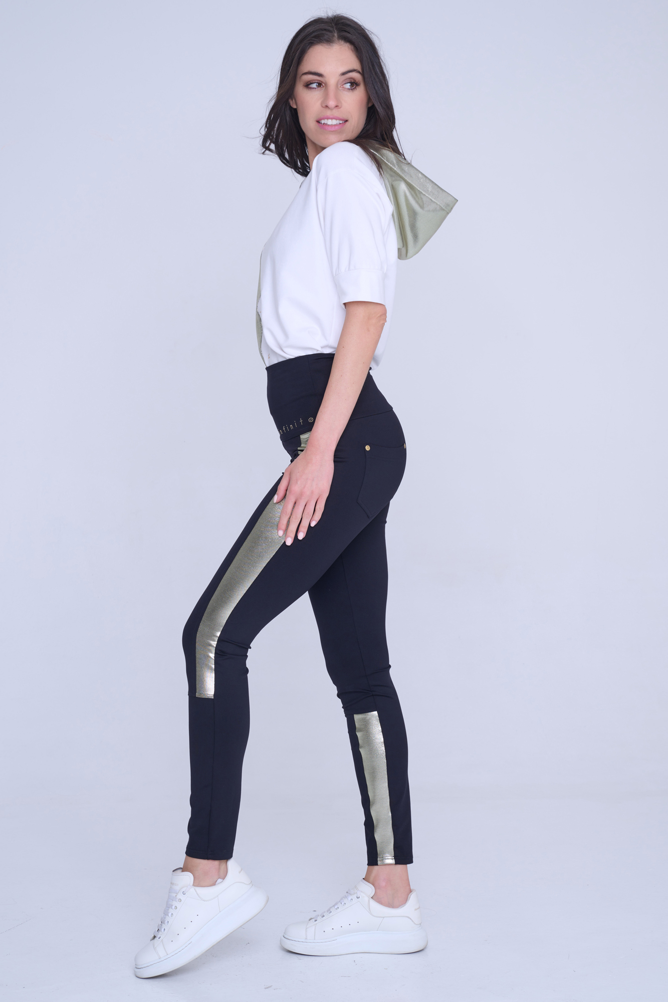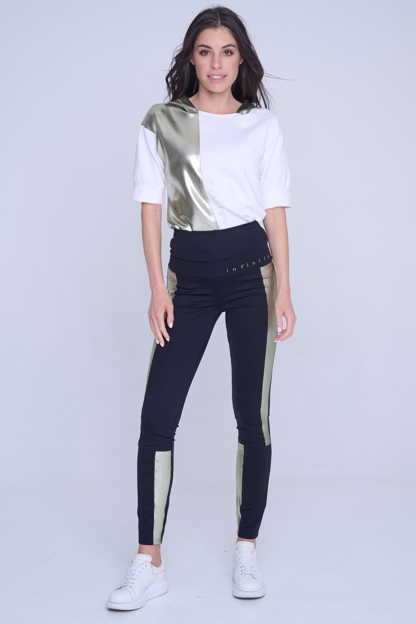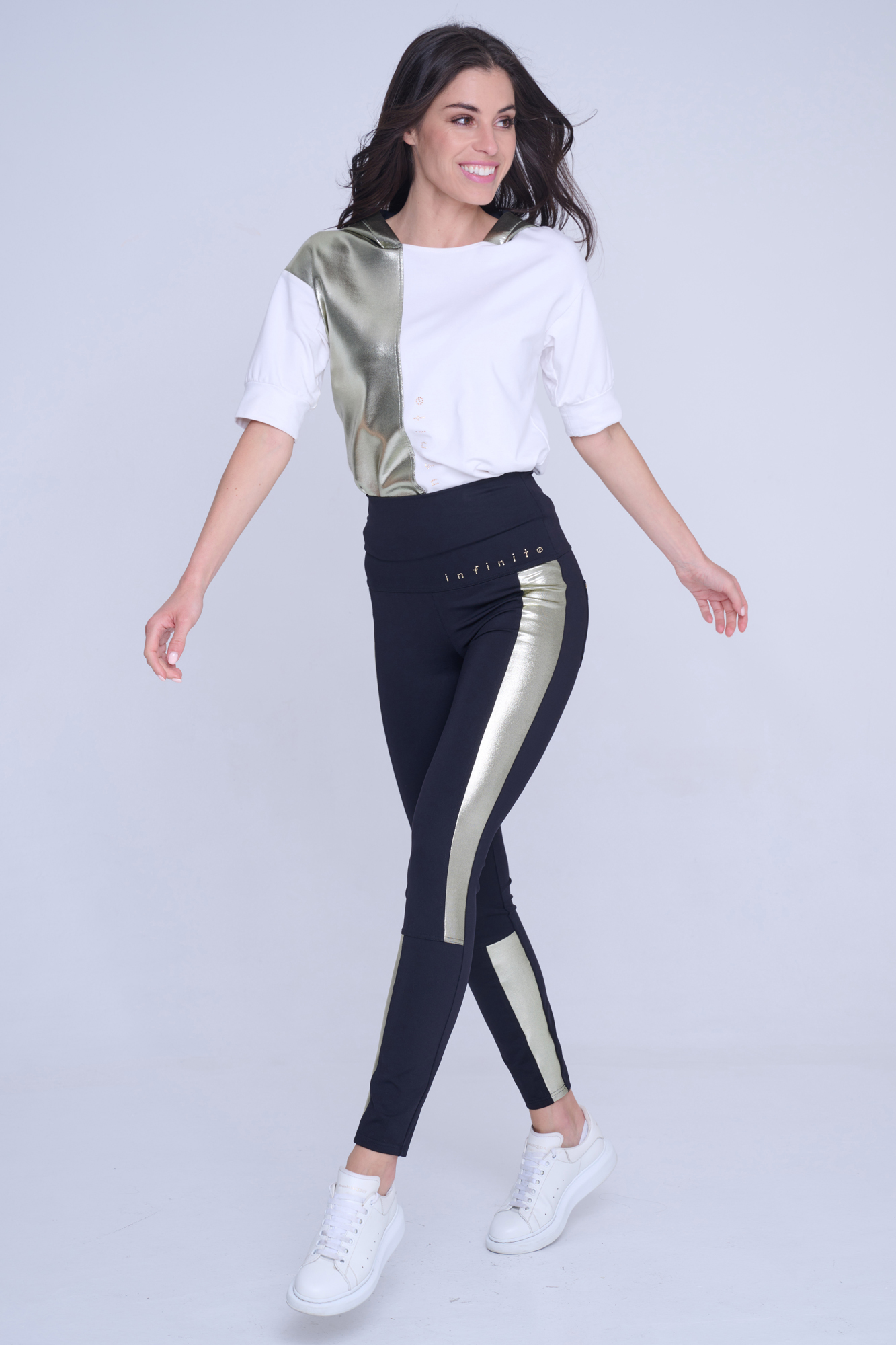 Kalhotové legíny s kapsami na zadním díle. Na předním díle nápis Infinite ze zlatých krystalů Preciosa. V kombinaci se zlatým efektním materiálem.