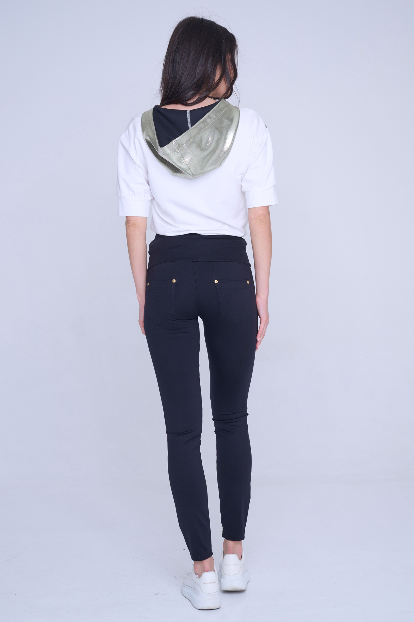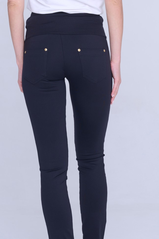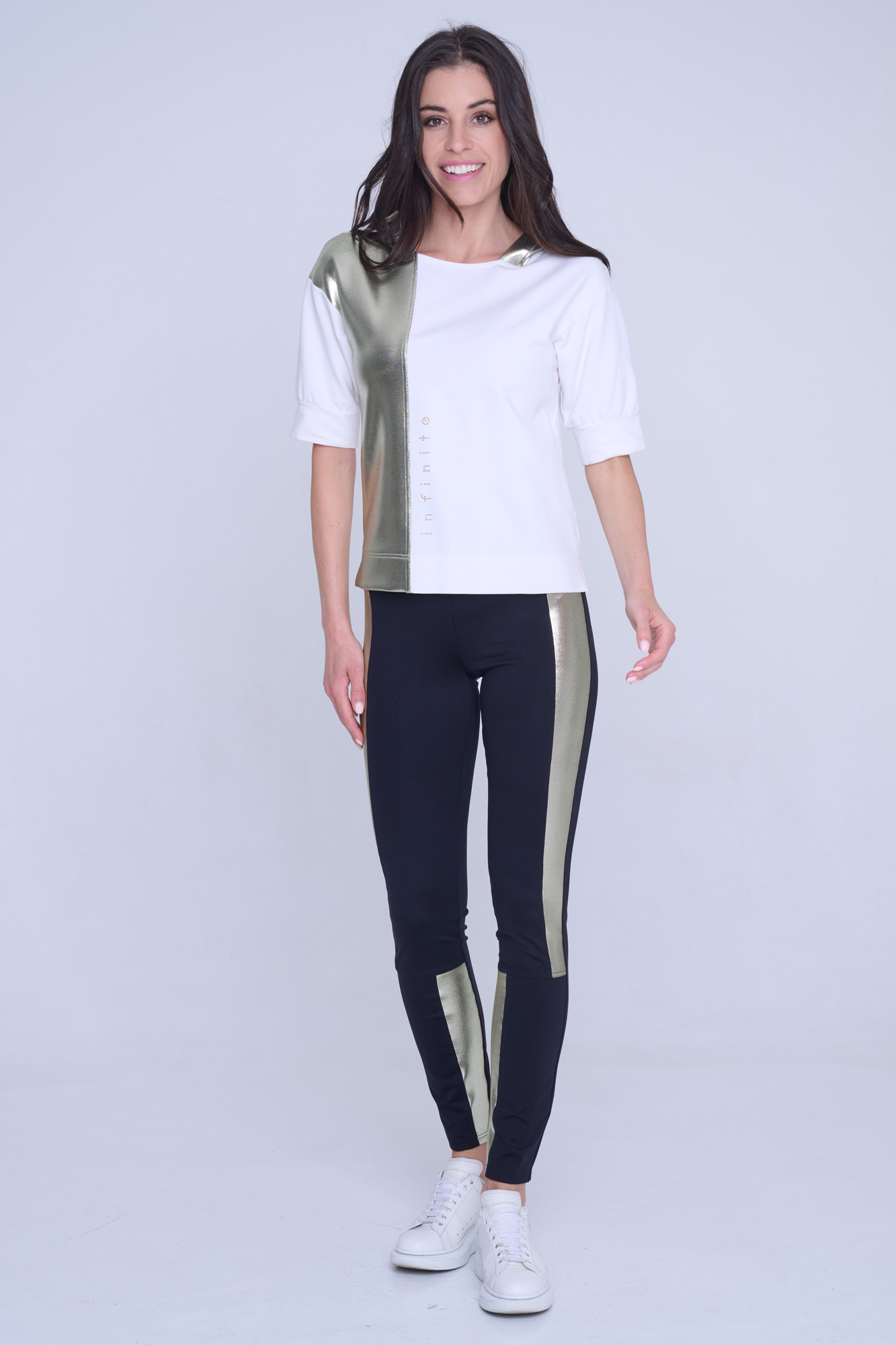 Kalhotové legíny s kapsami na zadním díle. Na předním díle nápis Infinite ze zlatých krystalů Preciosa. V kombinaci se zlatým efektním materiálem.