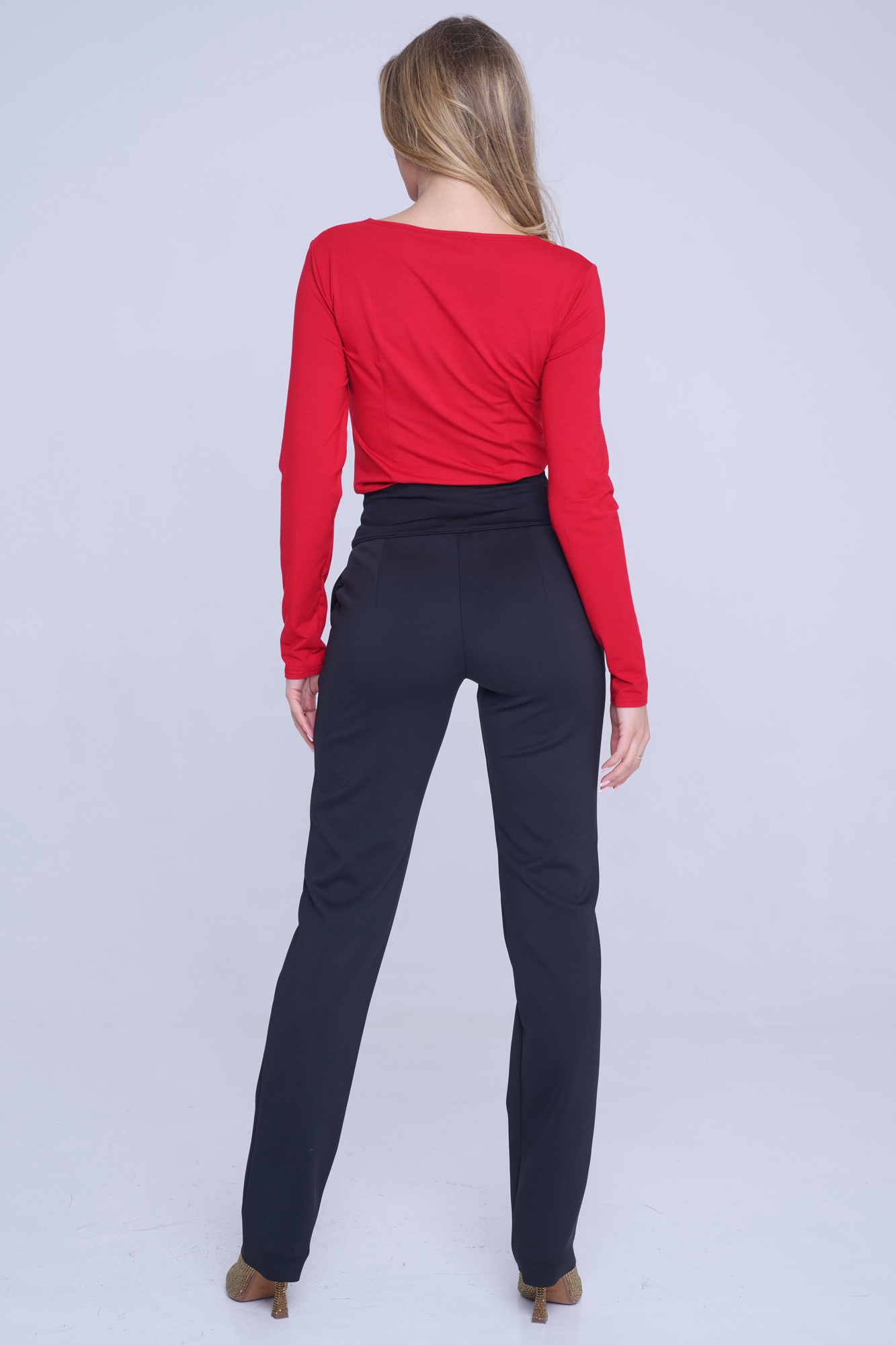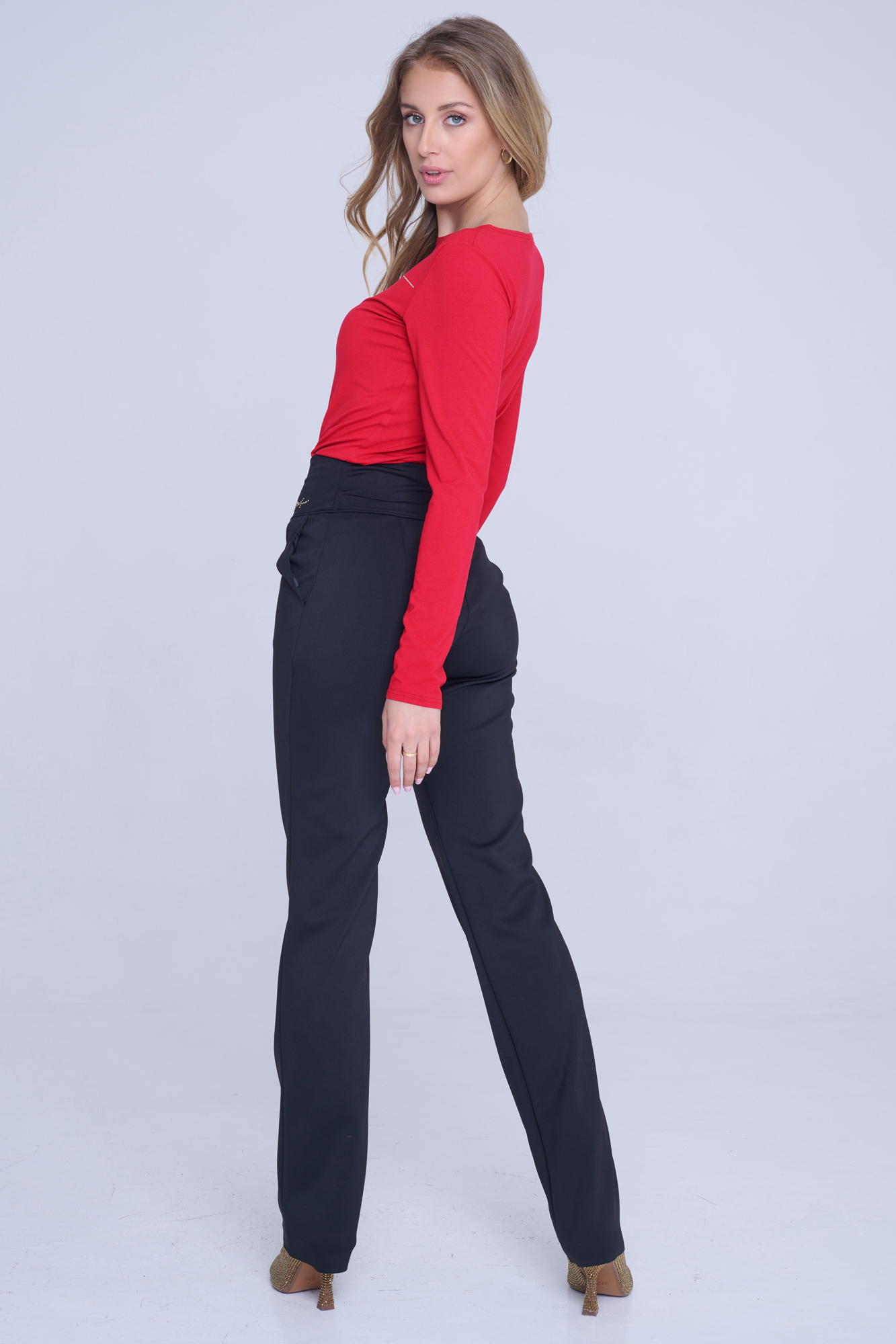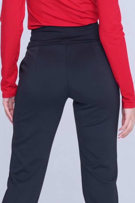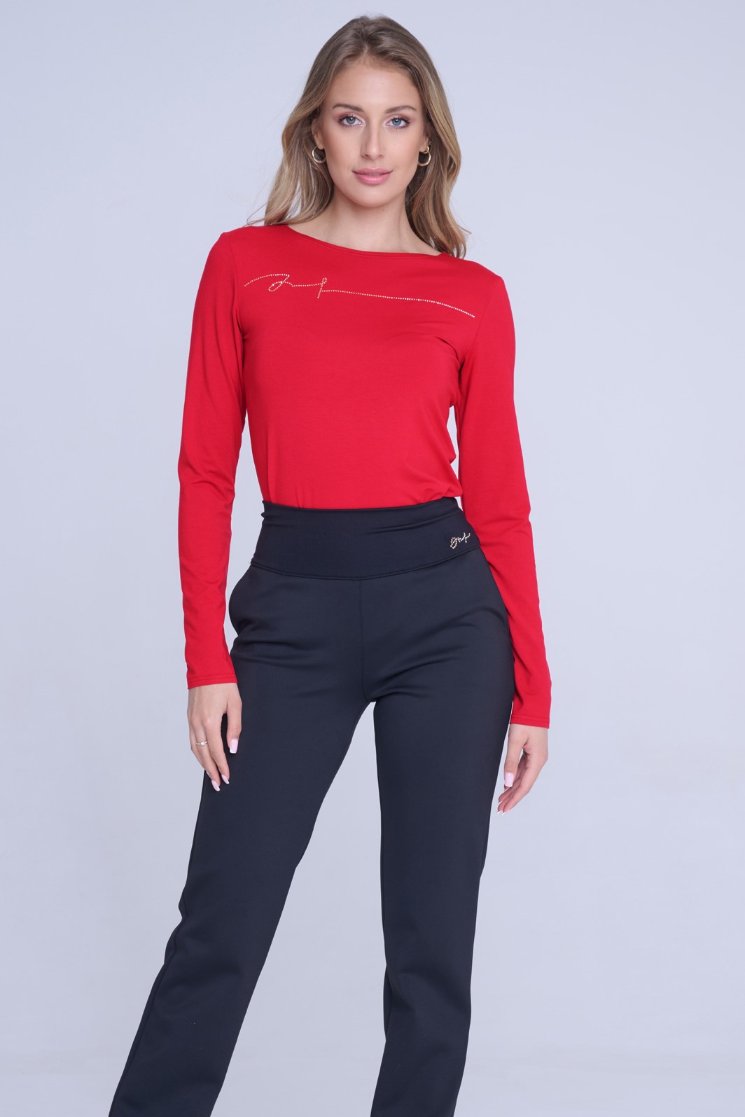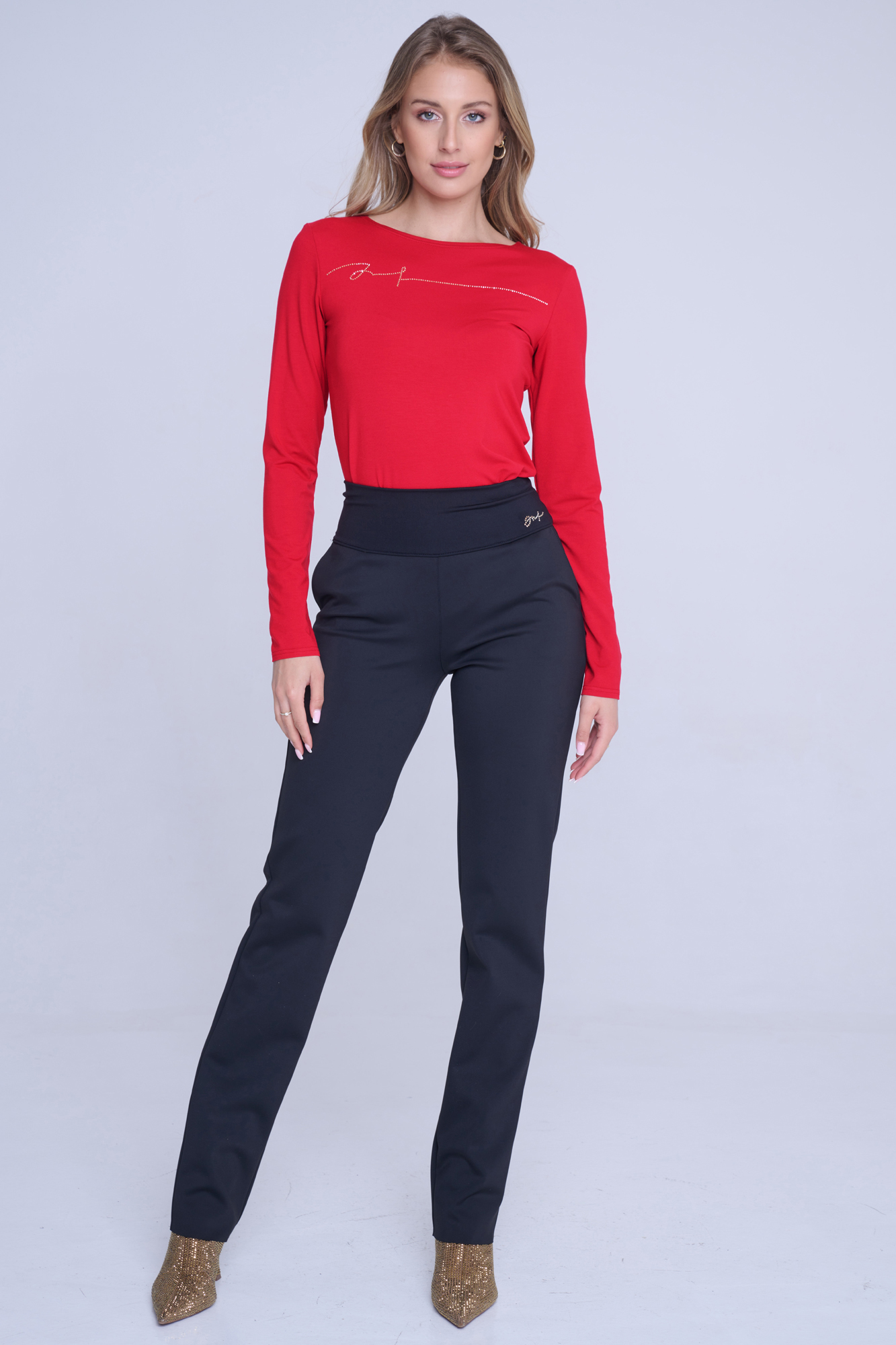 Klasické kalhoty z módního materiálu Scuba. Na předním díle minimalistický zlatý krystalový motiv Inf.