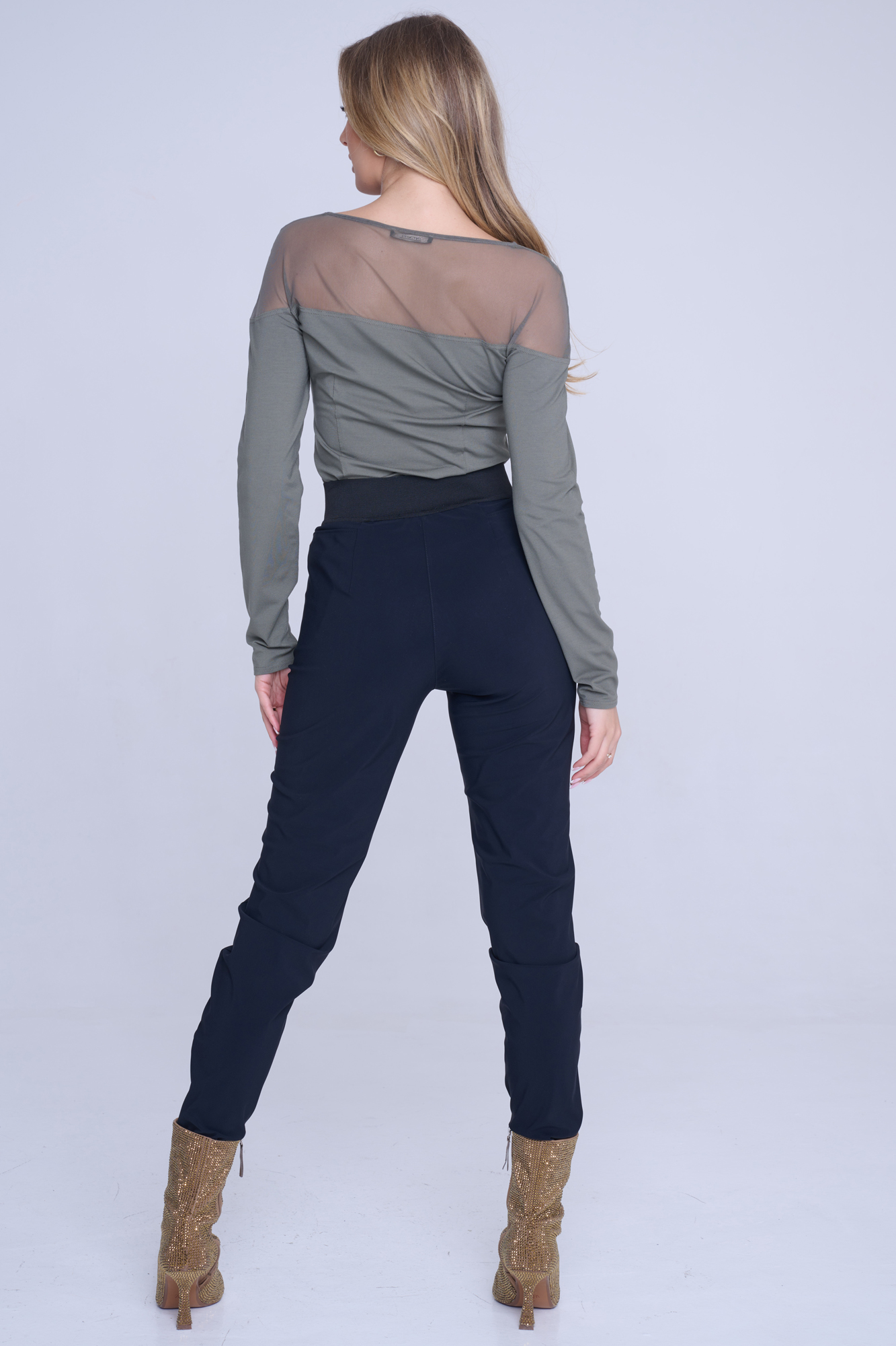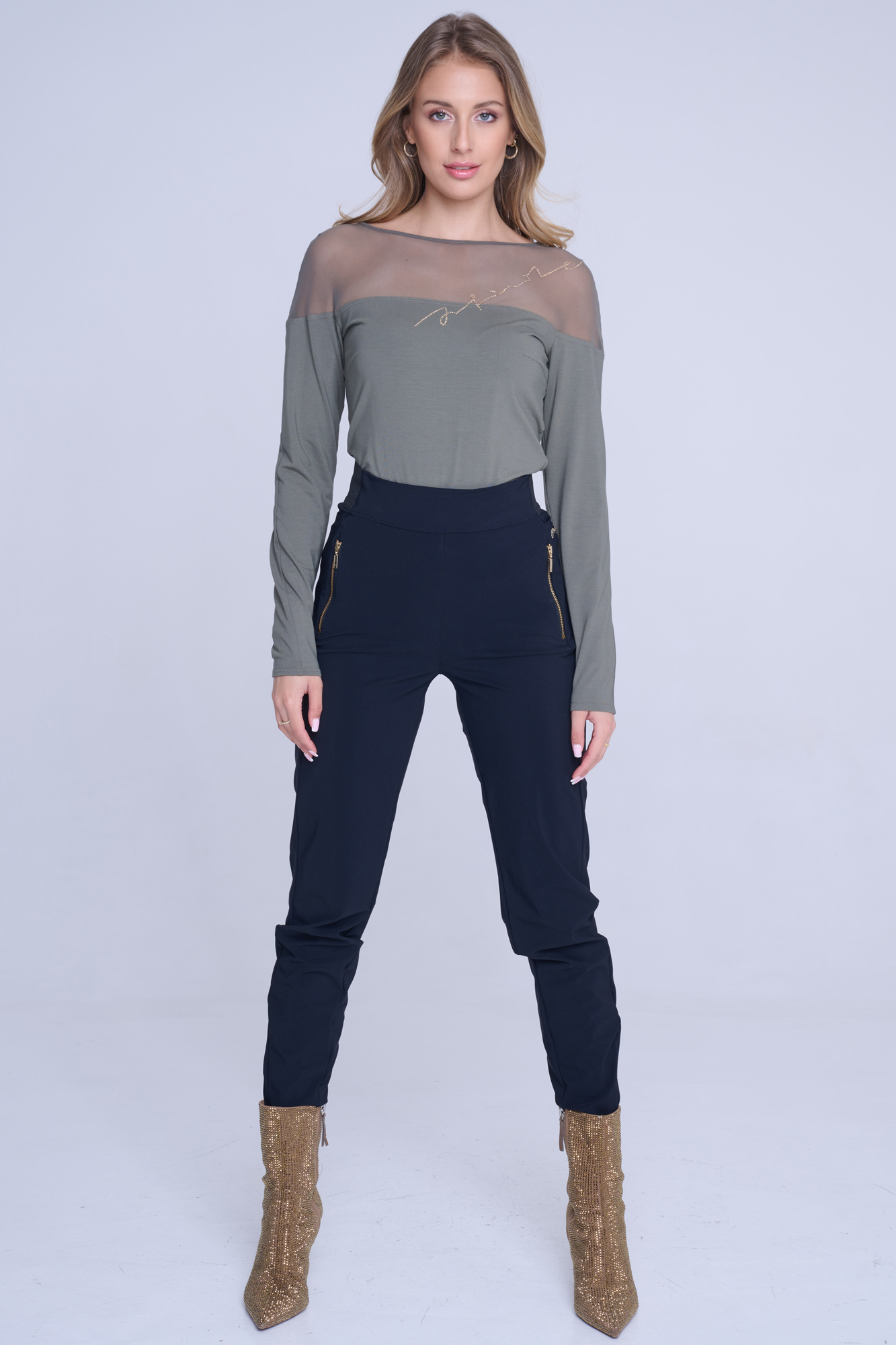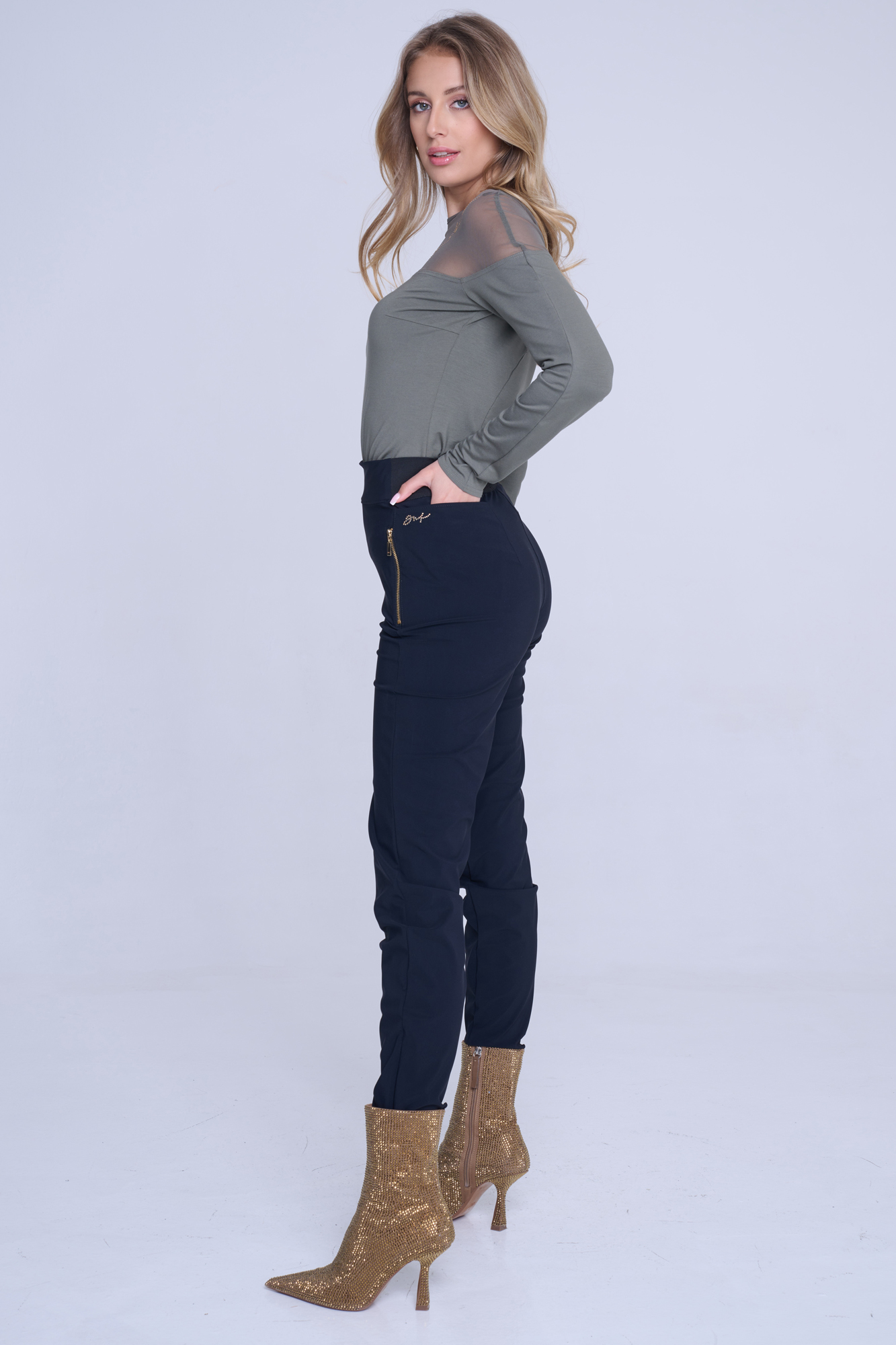 Kalhoty Infinite se strečovým pasem. Zlaté doplňky.