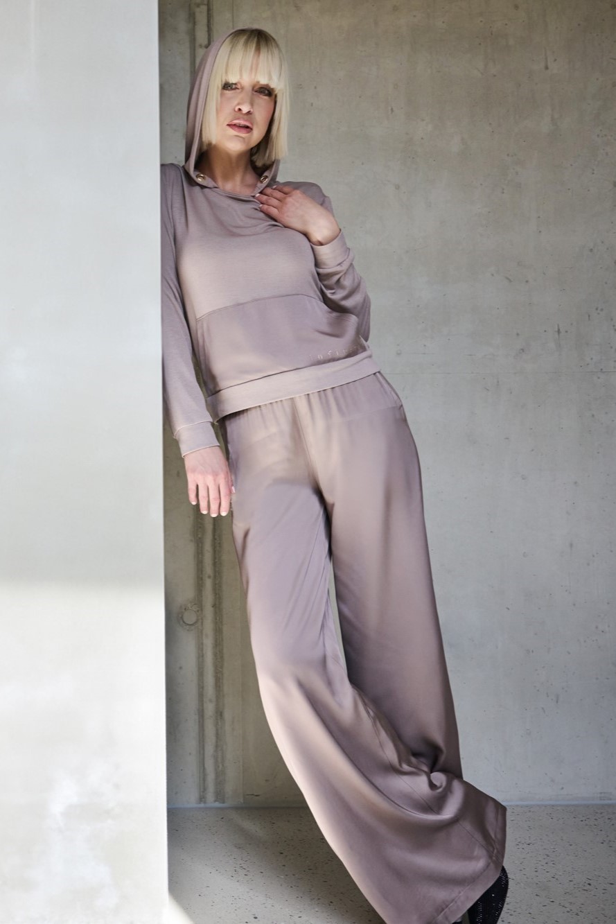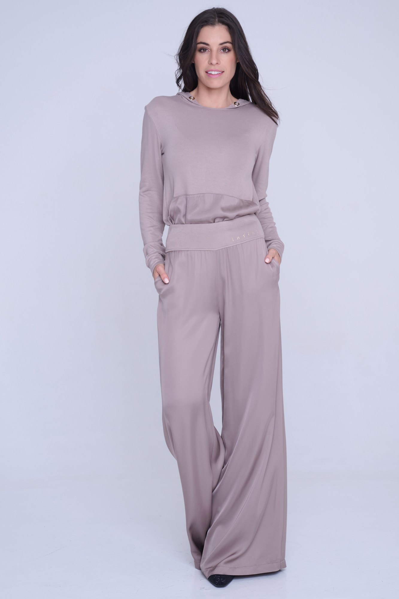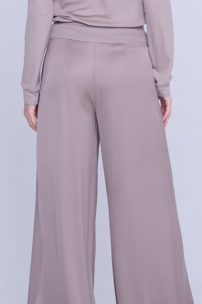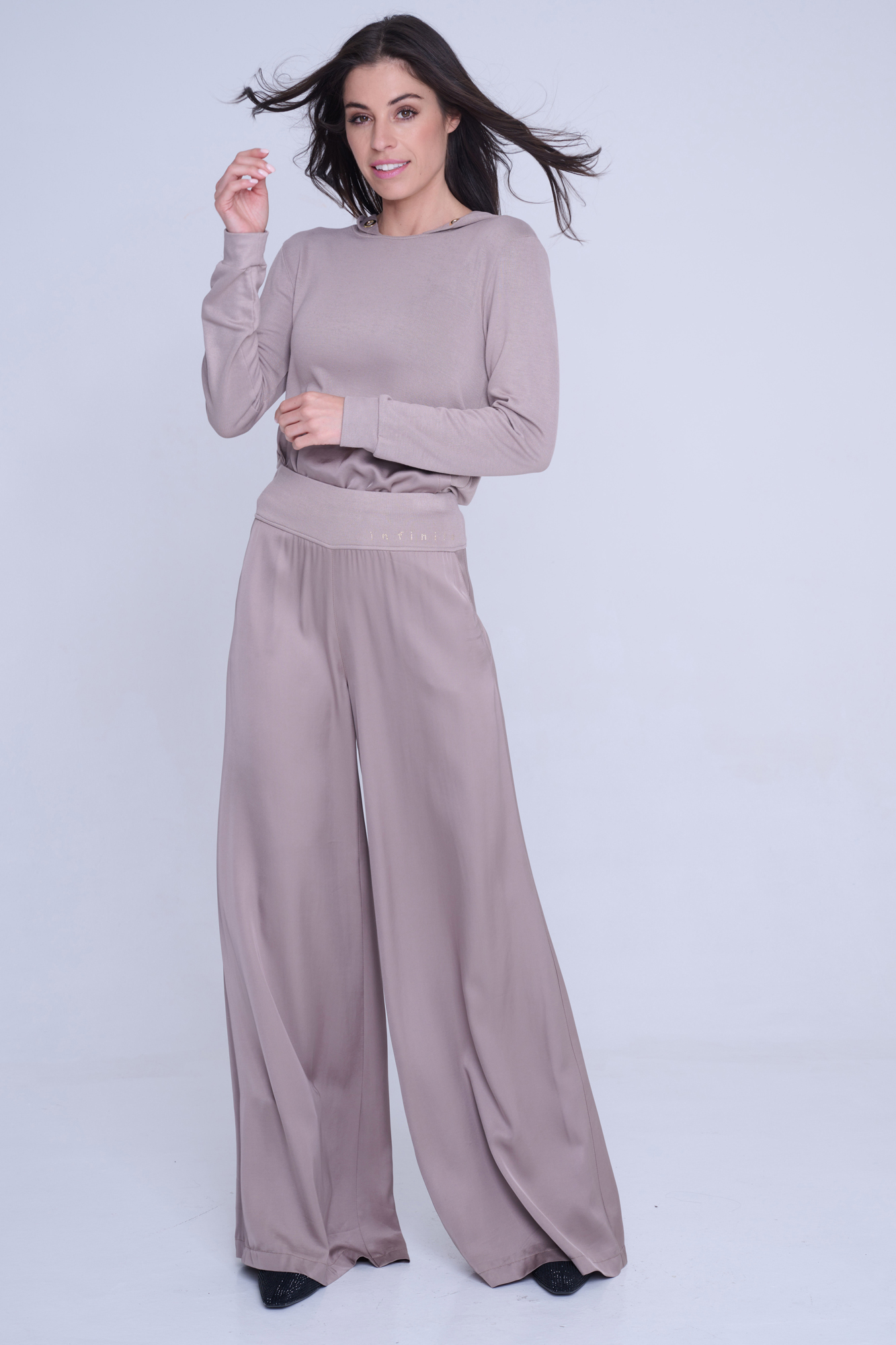 Široké saténové kalhoty z přírodního materiálu. V pase strečový úplet s nápisem Infinite ze zlatých krystalů Preciosa.