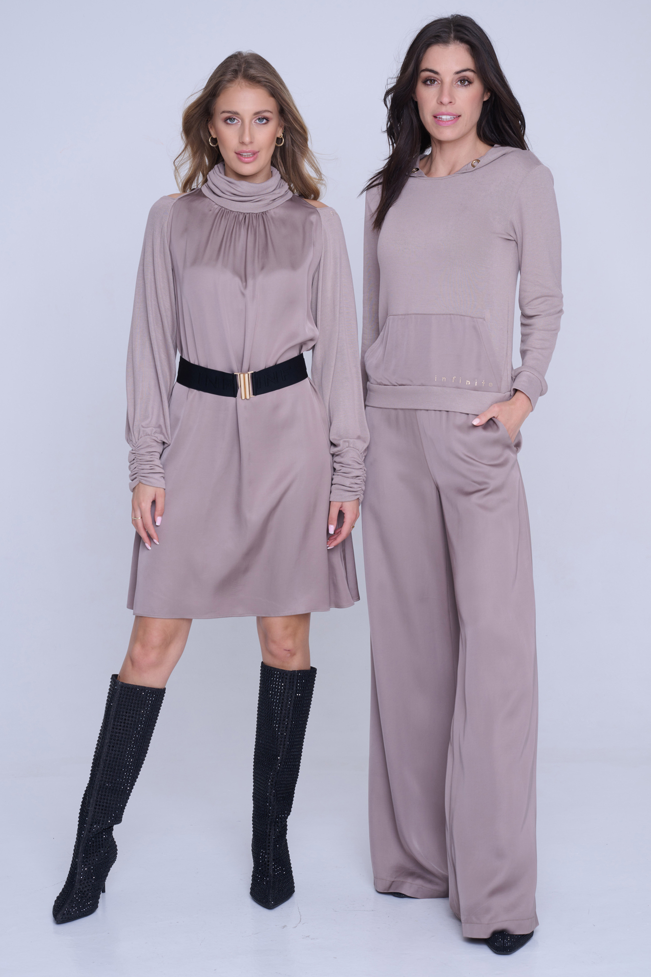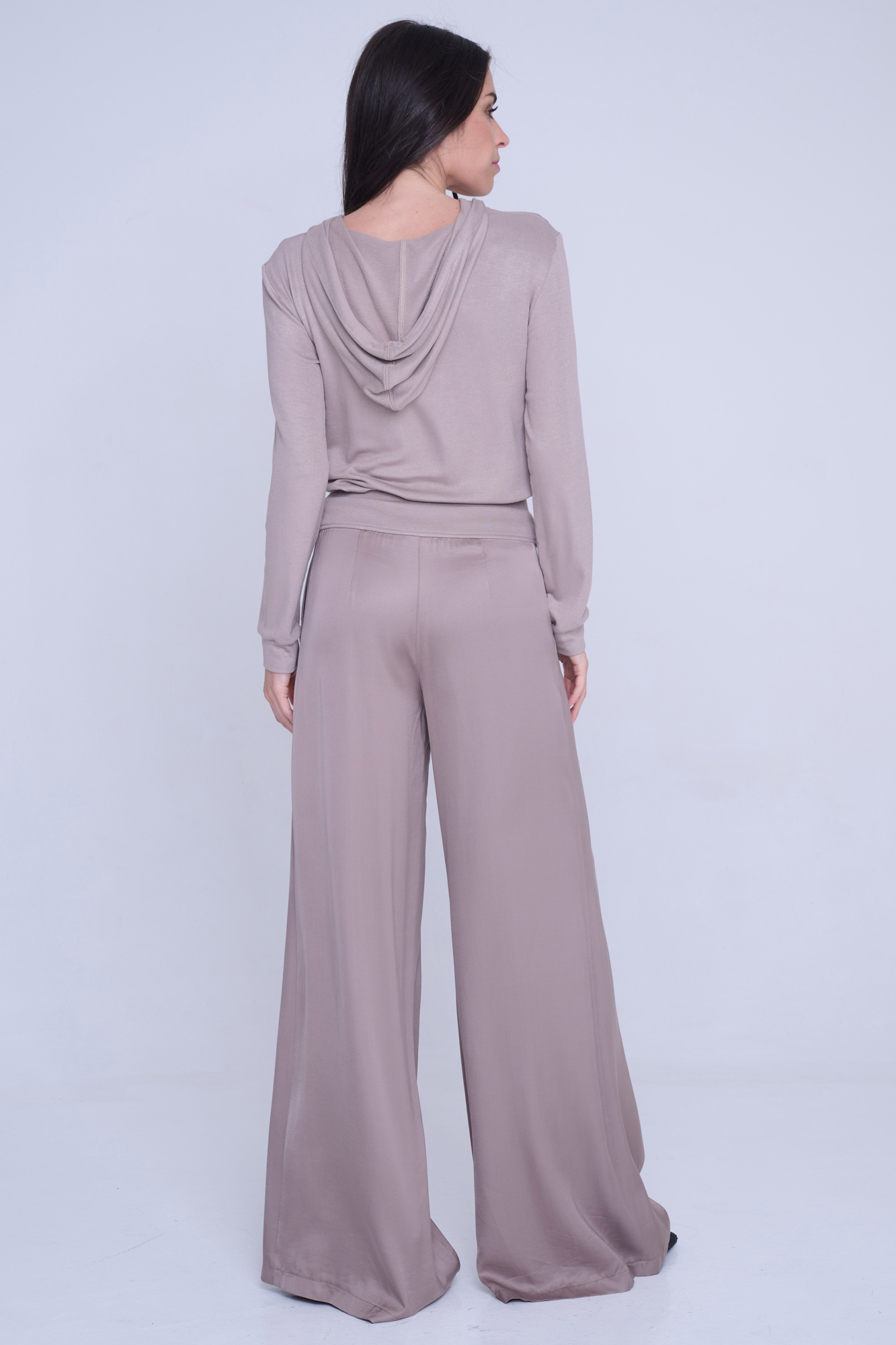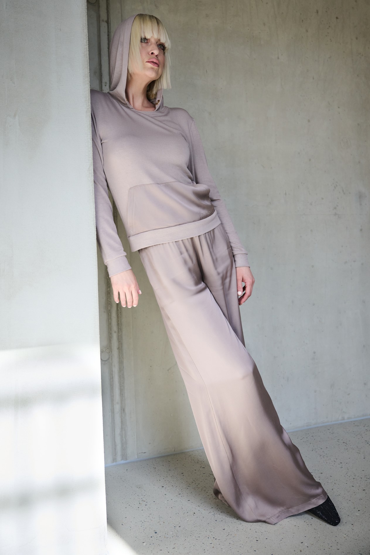 Široké saténové kalhoty z přírodního materiálu. V pase strečový úplet s nápisem Infinite ze zlatých krystalů Preciosa.