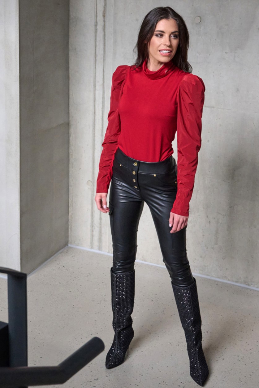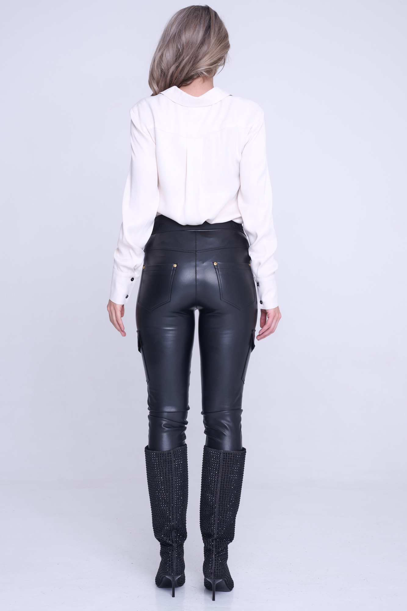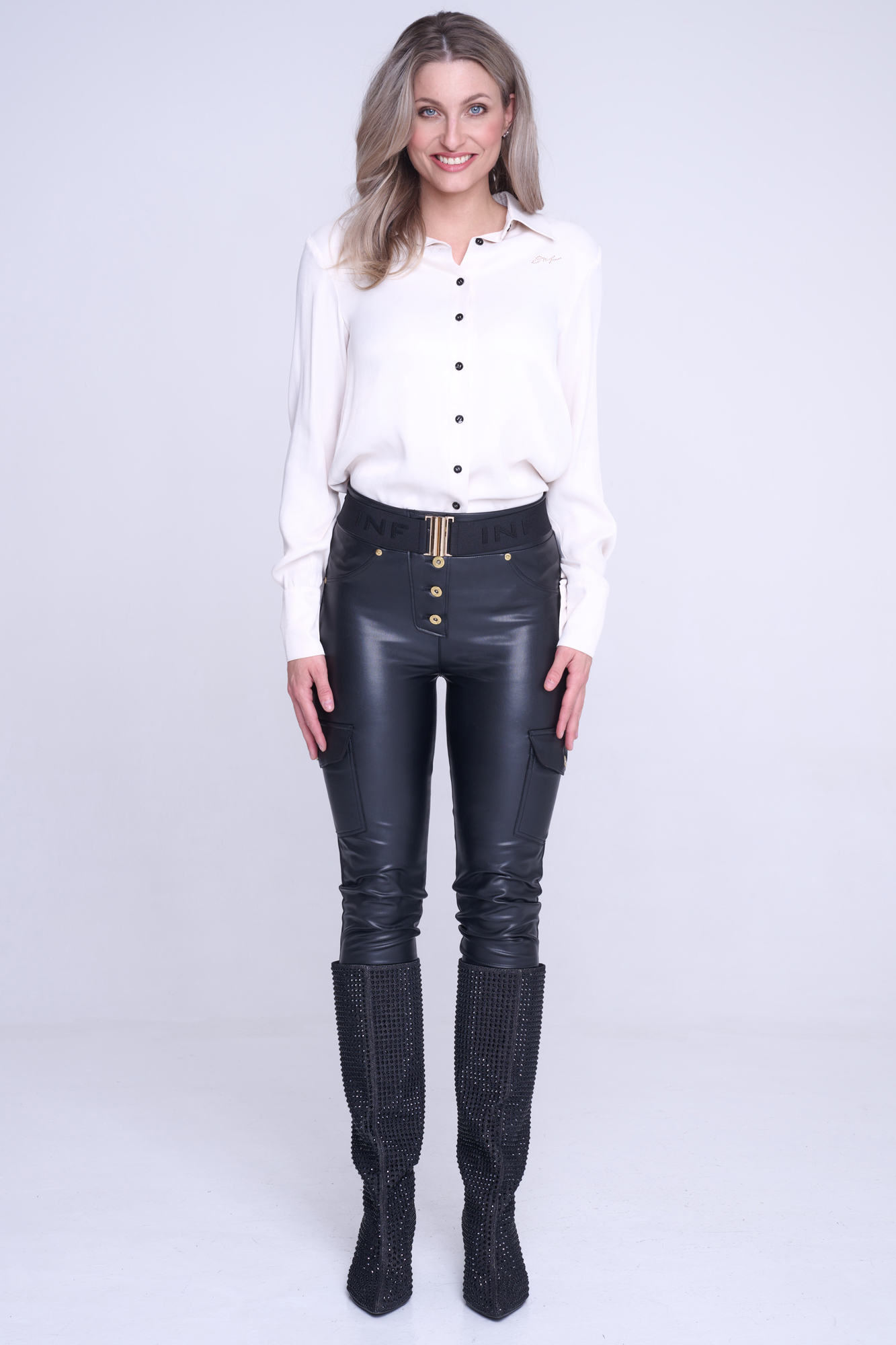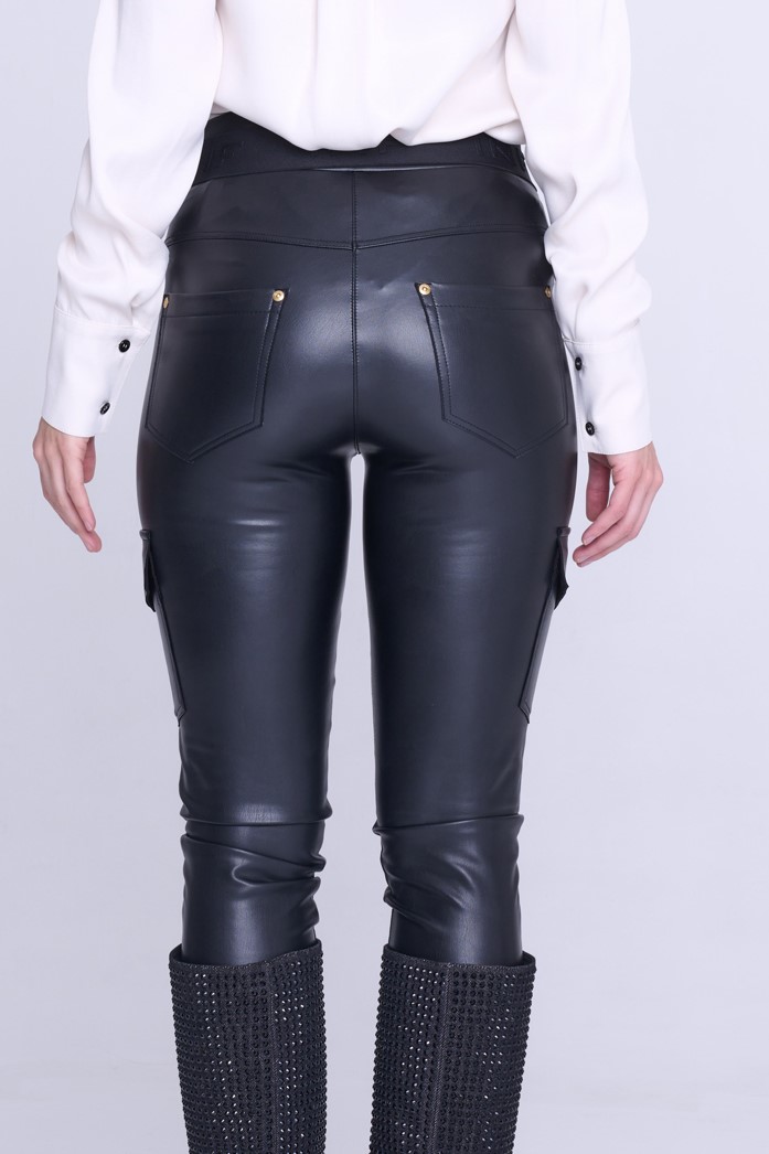 Slim kalhoty s kapsami na zadním díle. Na bocích cargo kapsy. Zlaté doplňky.