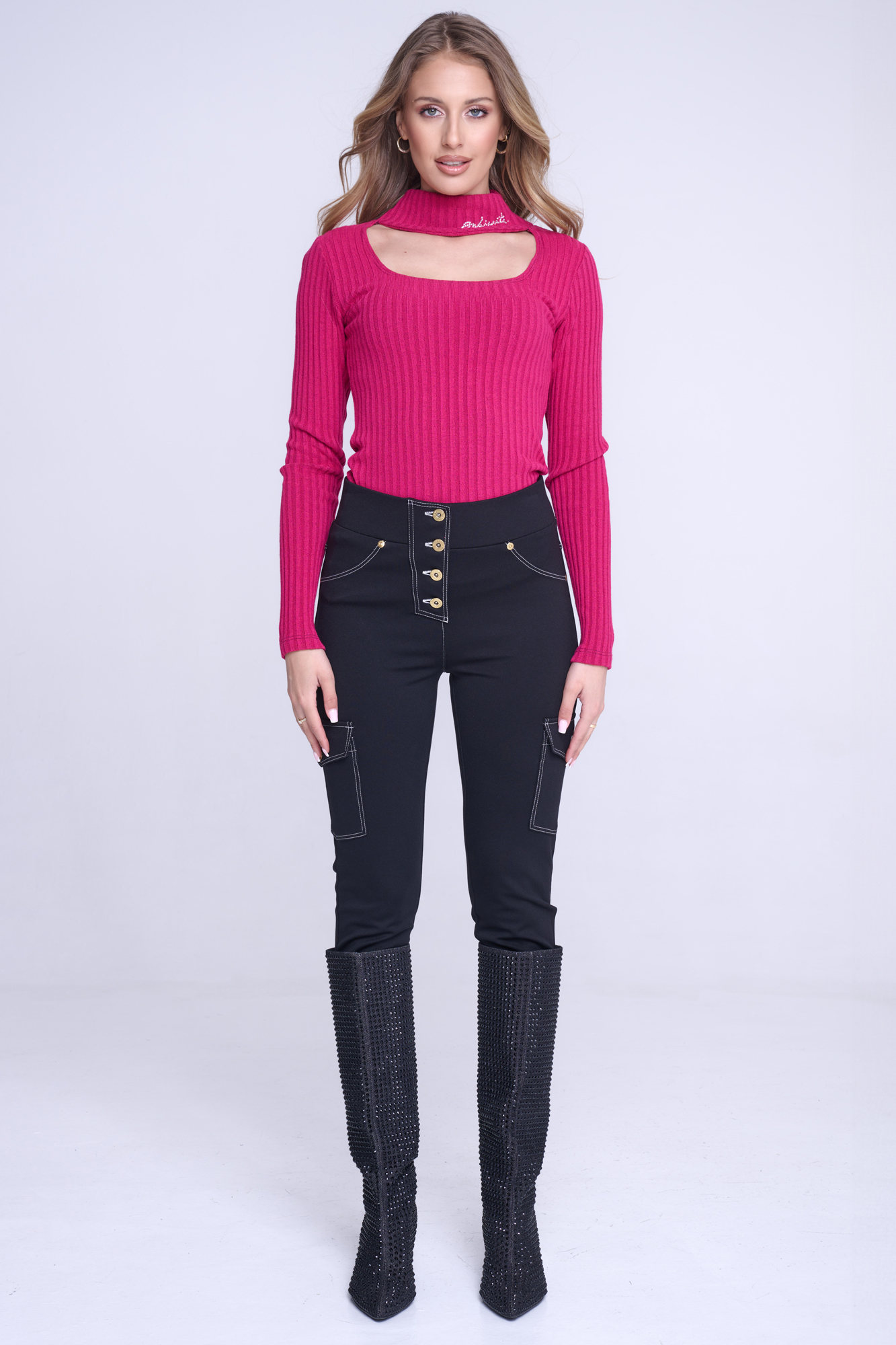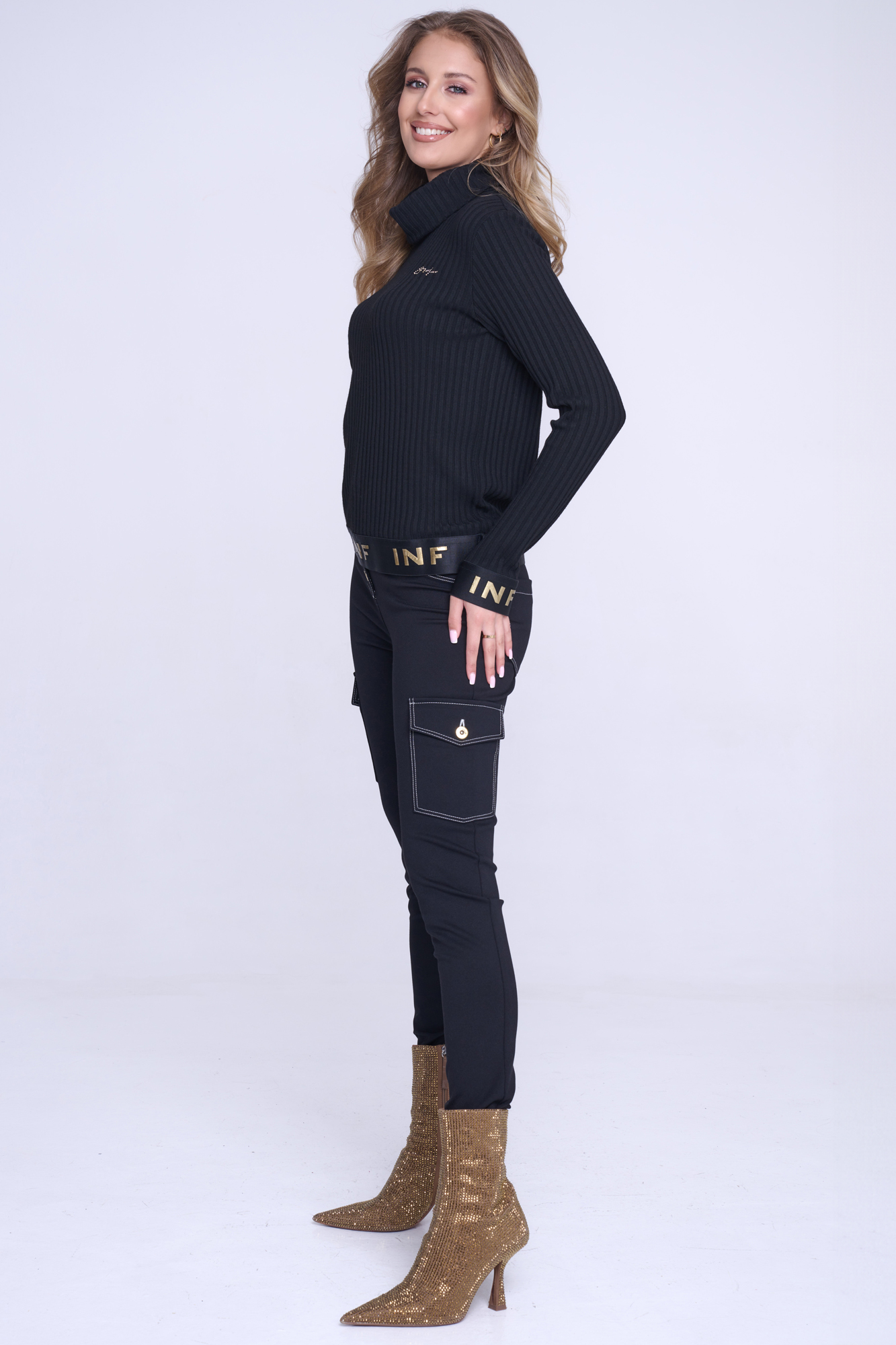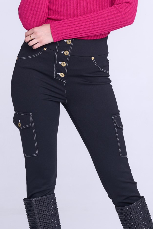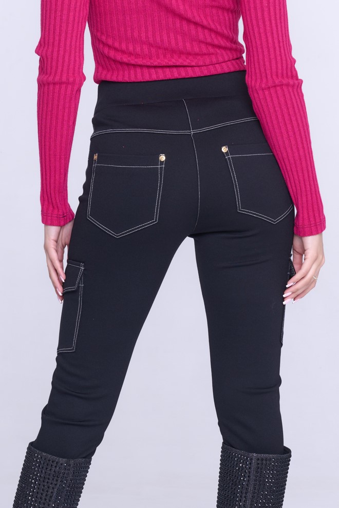 Strečové kalhoty slim střihu. Na zadním díle kapsy. Na bocích cargo kapsy. Zlaté doplňky. Výrazné prošití.