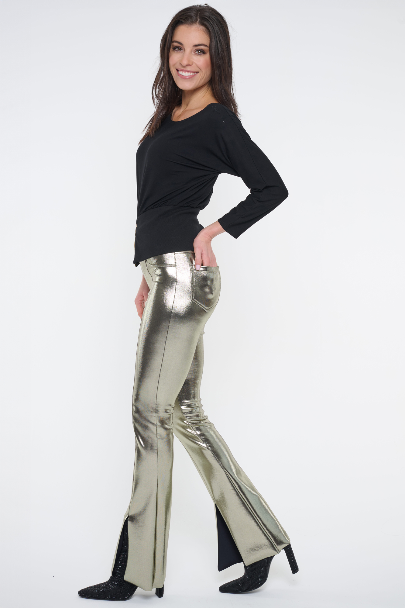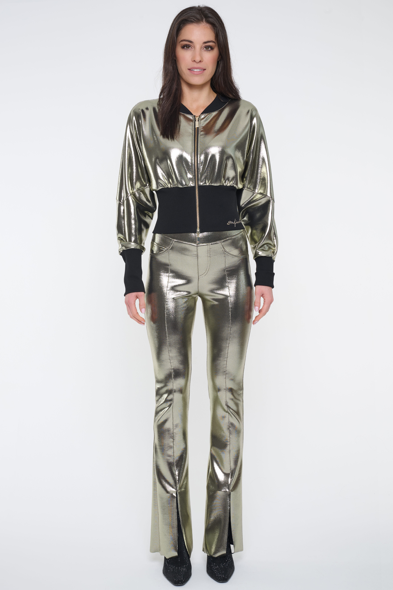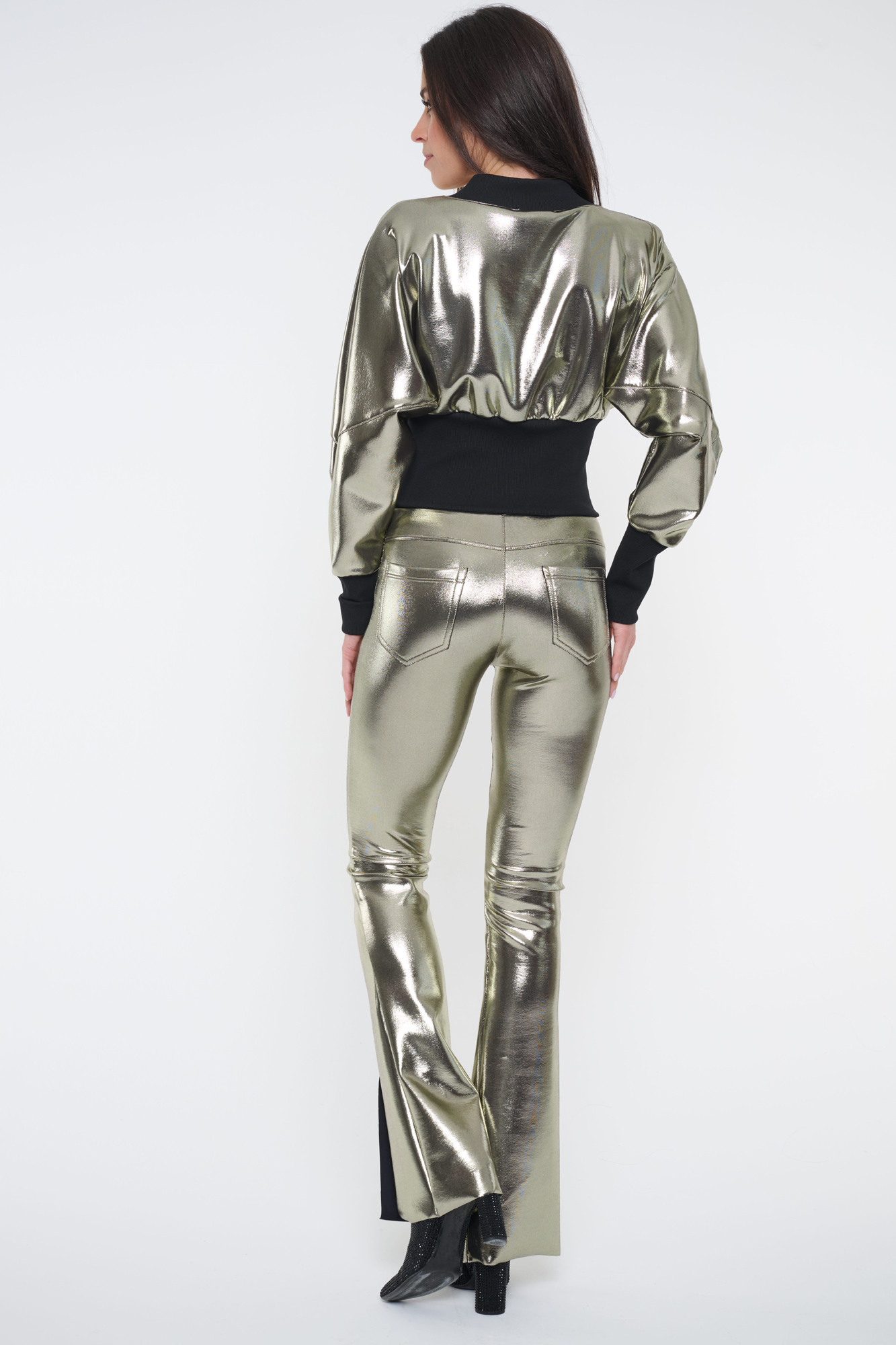 Kalhoty s kapsami na zadním díle. Úzký legínový střih ze zlatého strečového materiálu pro náročné. "Kovový vzhled". V pase guma.