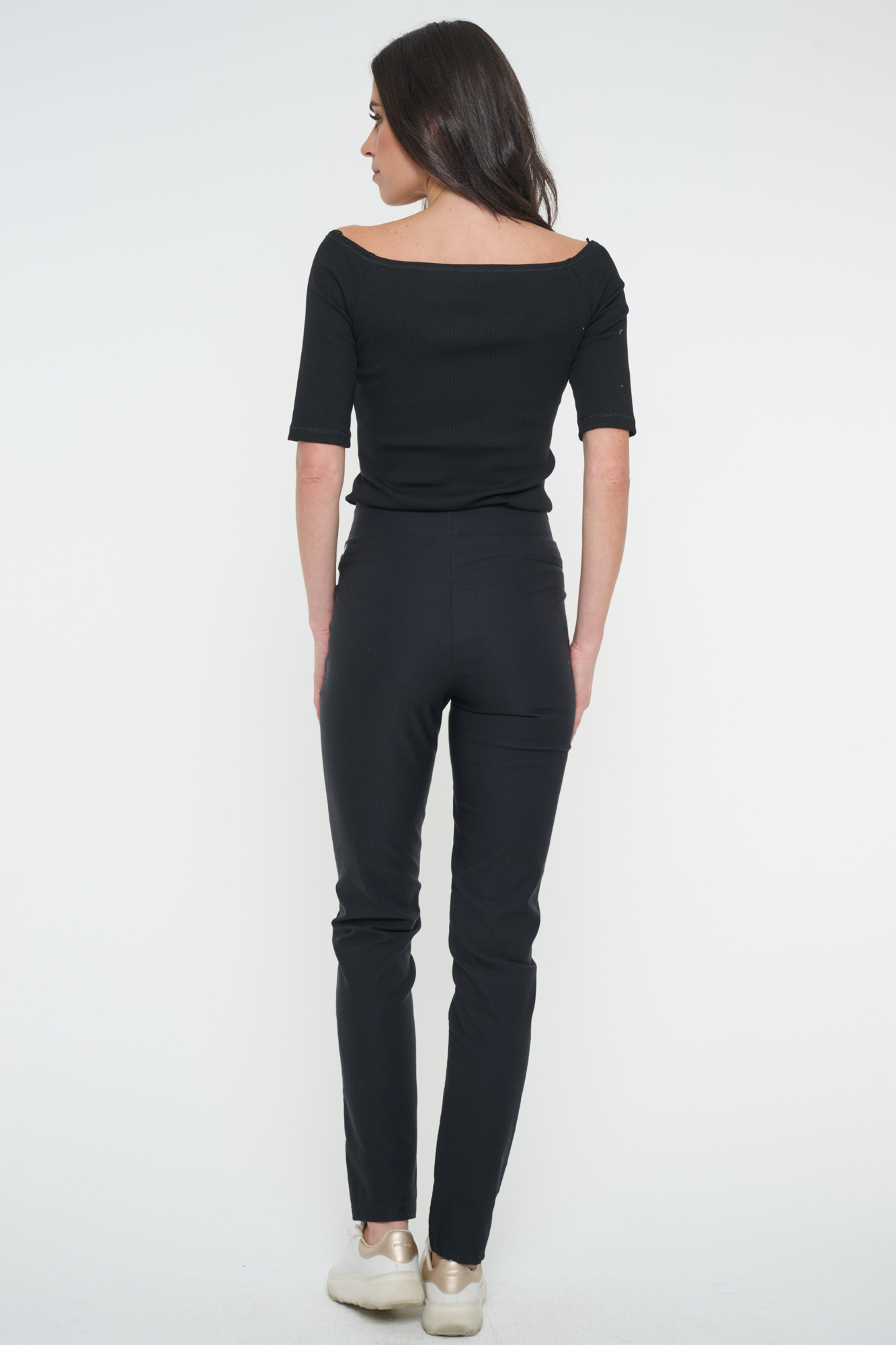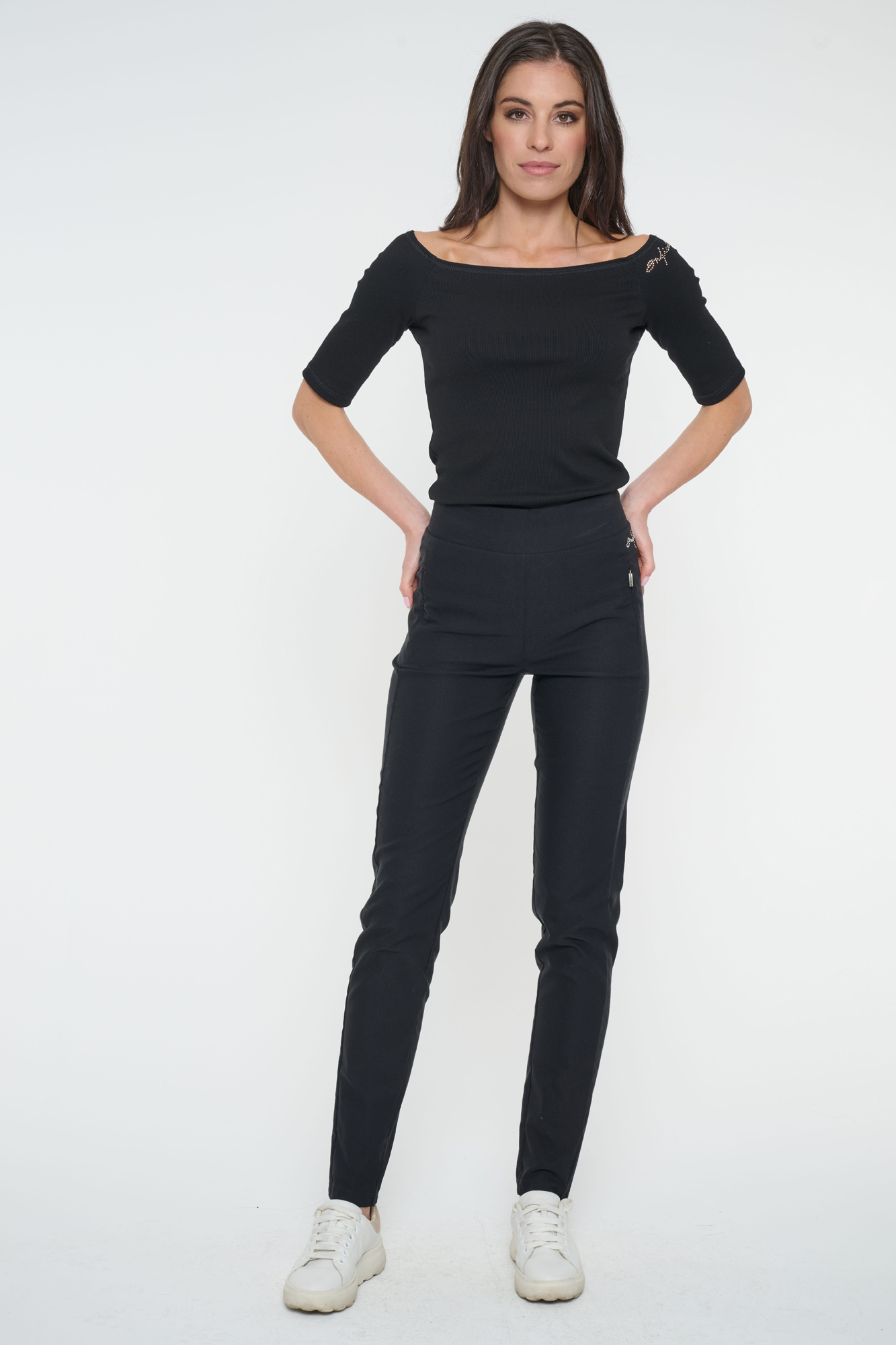 Kalhoty z klasického materiálu. V pase guma. Na bocích zipy a nápis Infinite ze stříbrných krystalů Preciosa.
