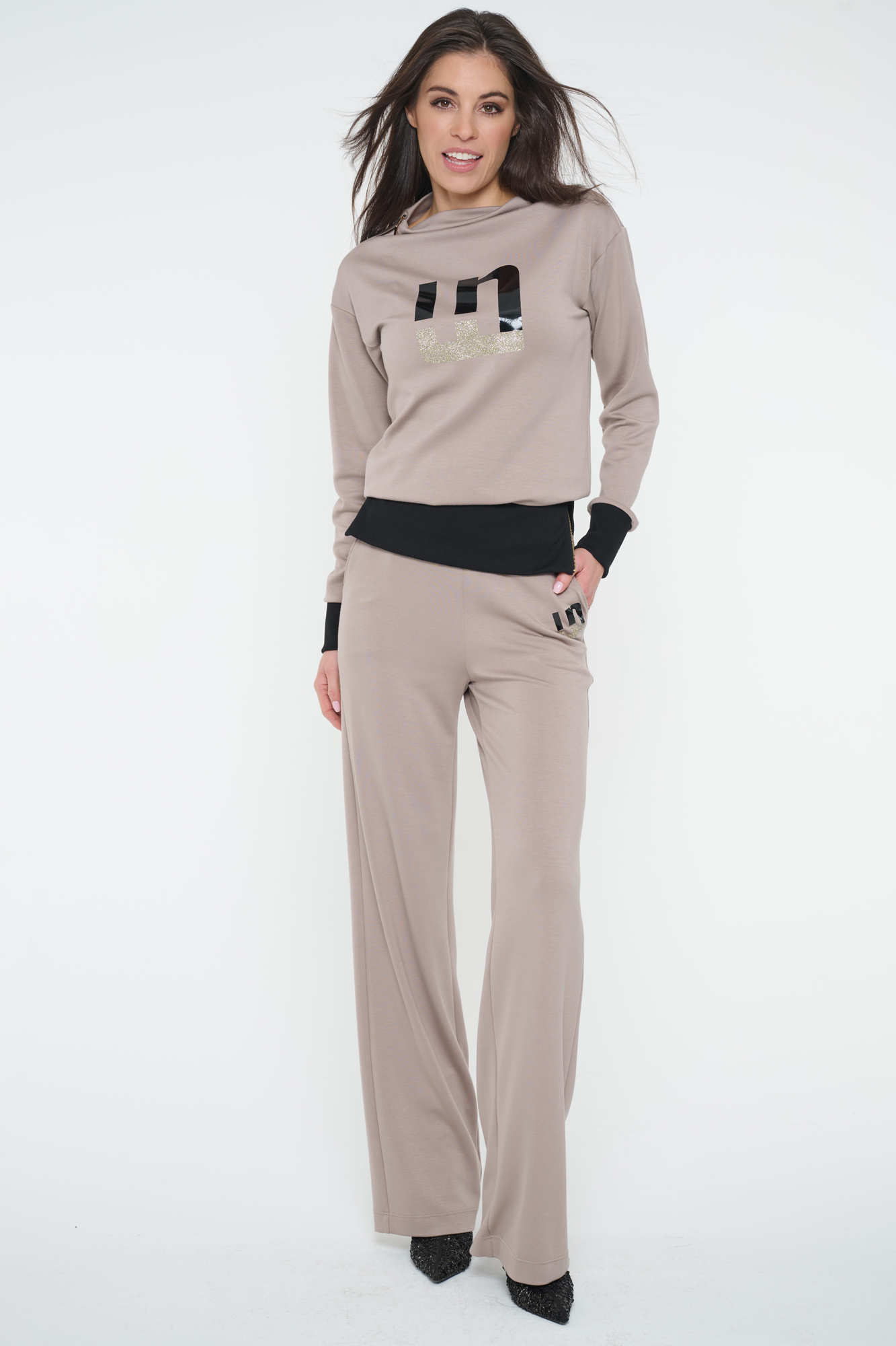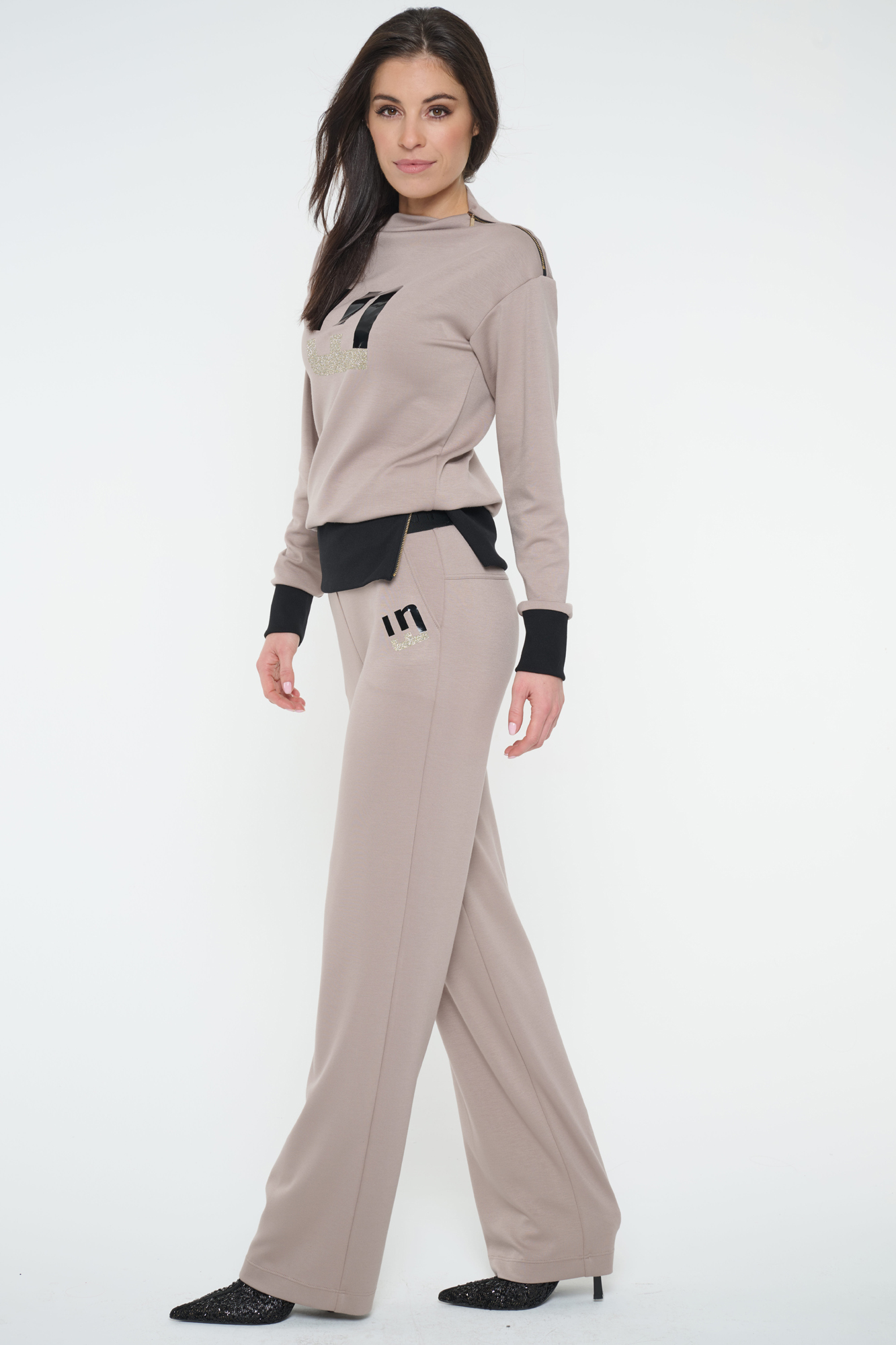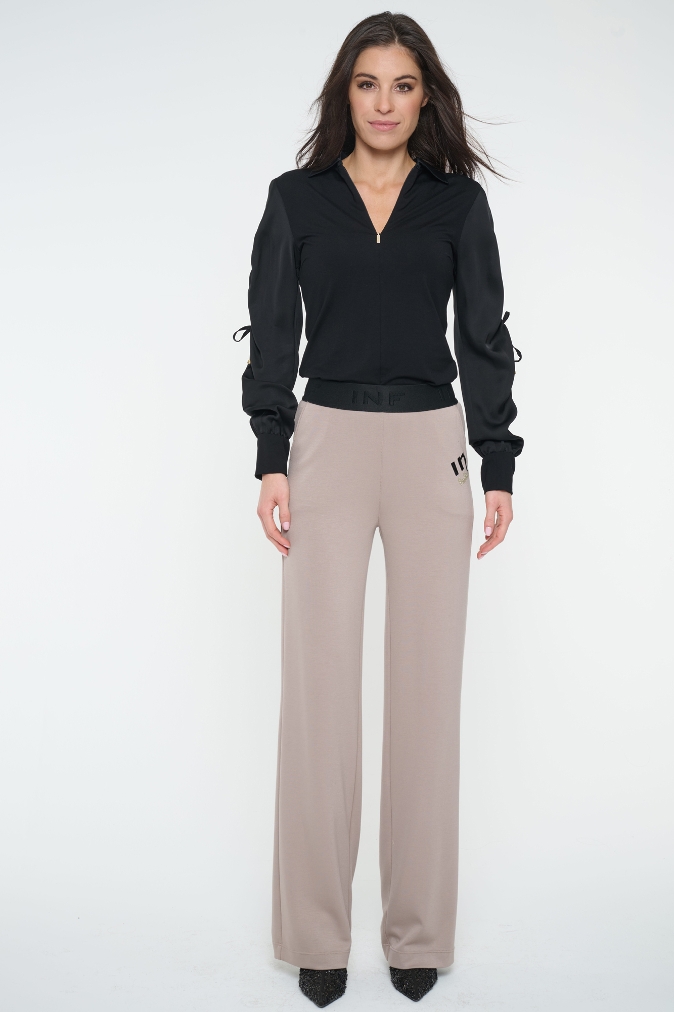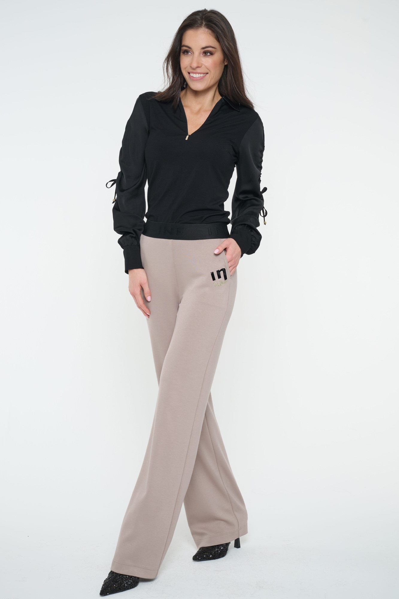 Jogging kalhoty se širokými nohavicemi. V pase efektní guma Infinite. Na kapse předního dílu je logo INF z černých krystalů Preciosa.