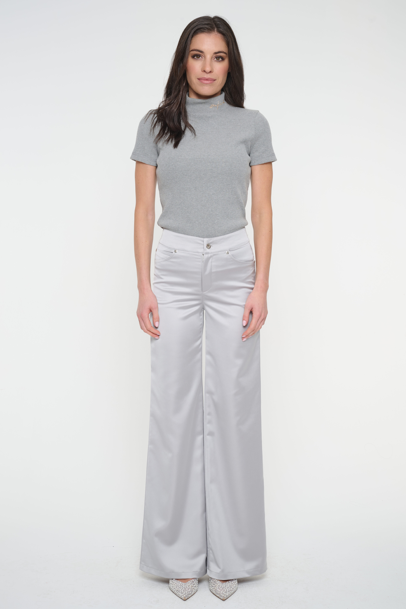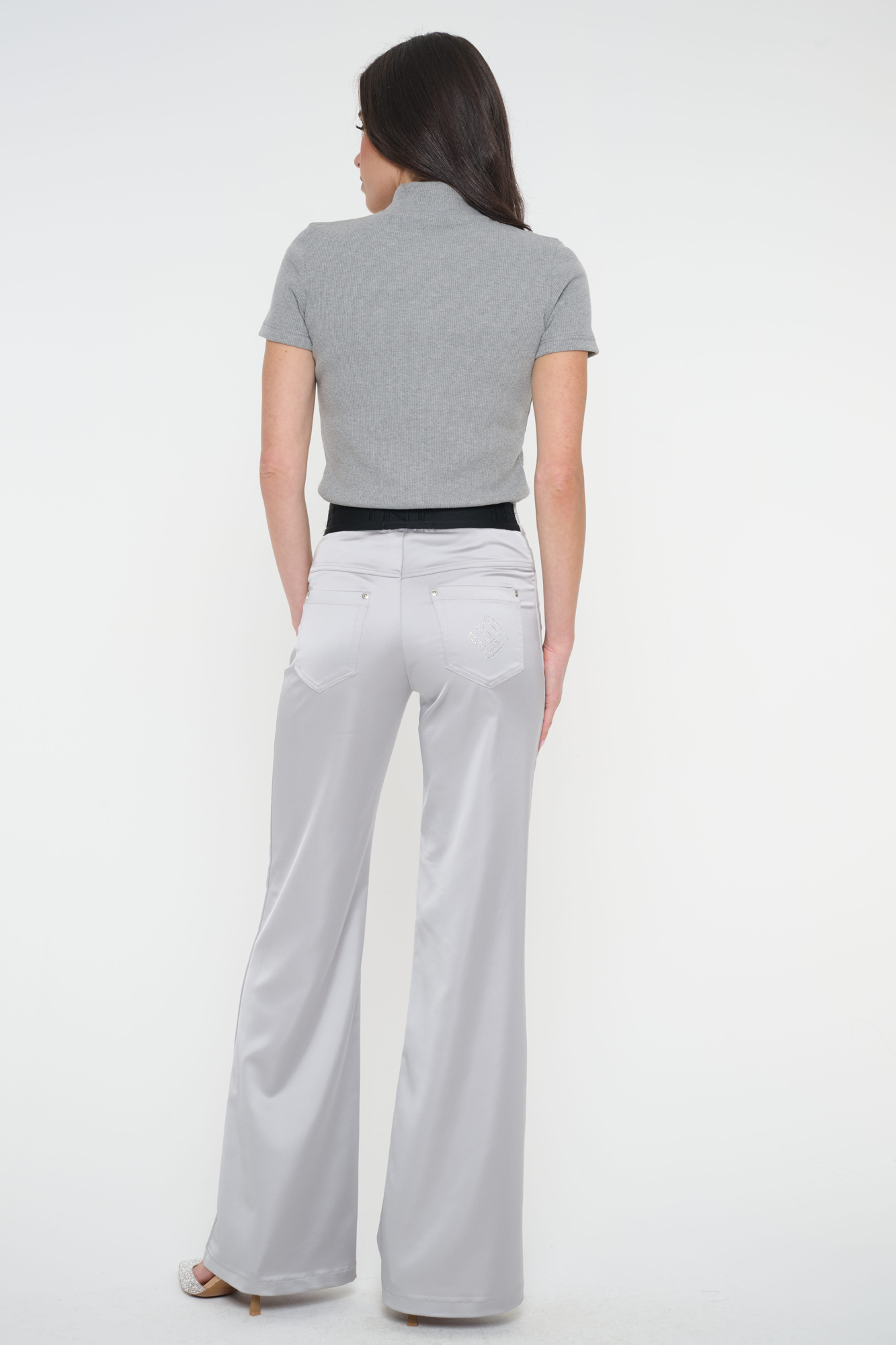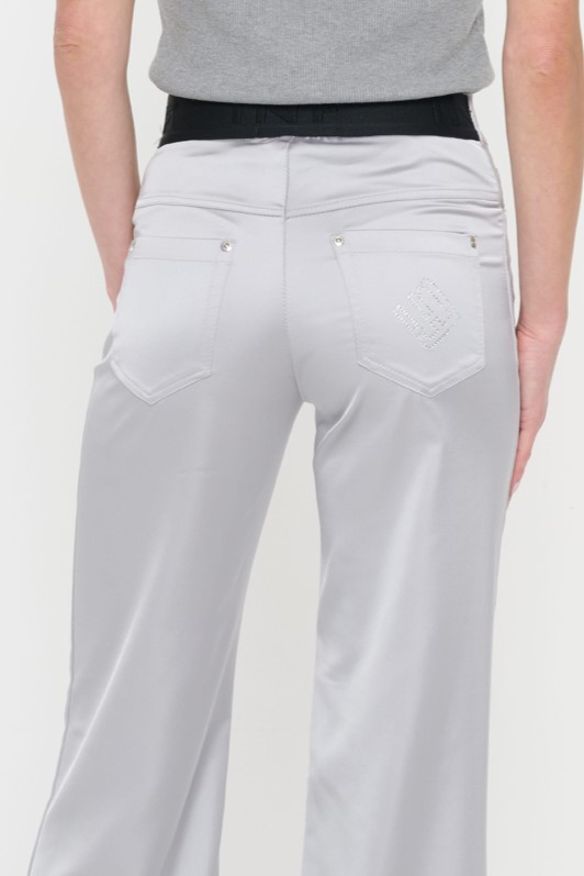 Saténové kalhoty se širokými nohavicemi. Na zadním díle v pase efektní guma INF a kapsy. Na jedné z nich logo INF ze stříbrných krystalů Preciosa. Stříbrné doplňky.