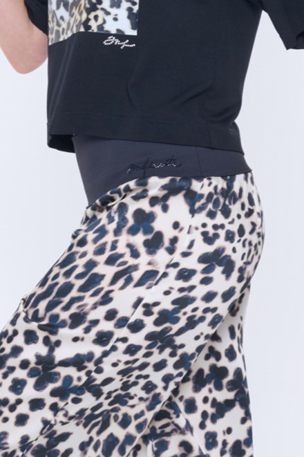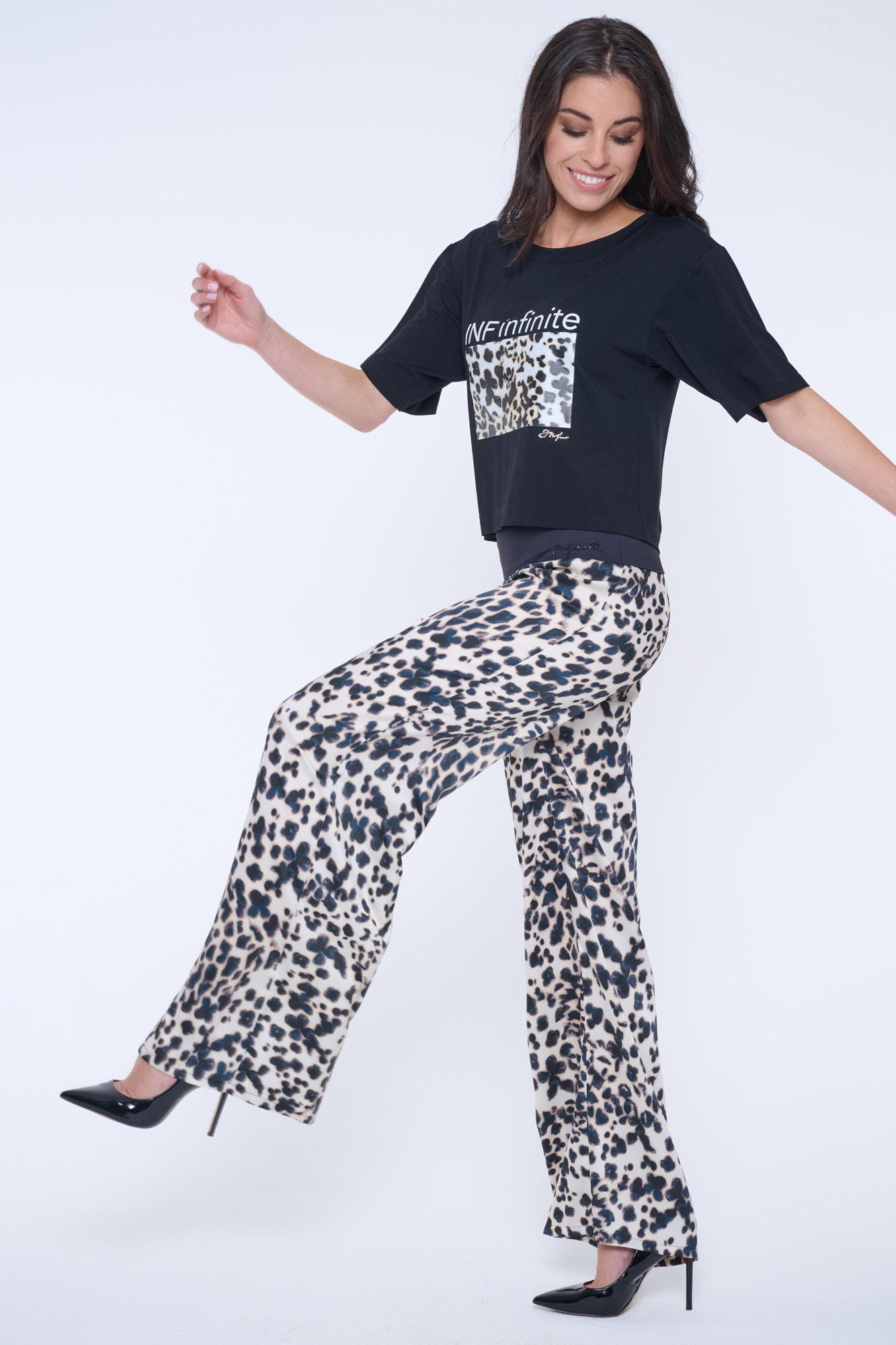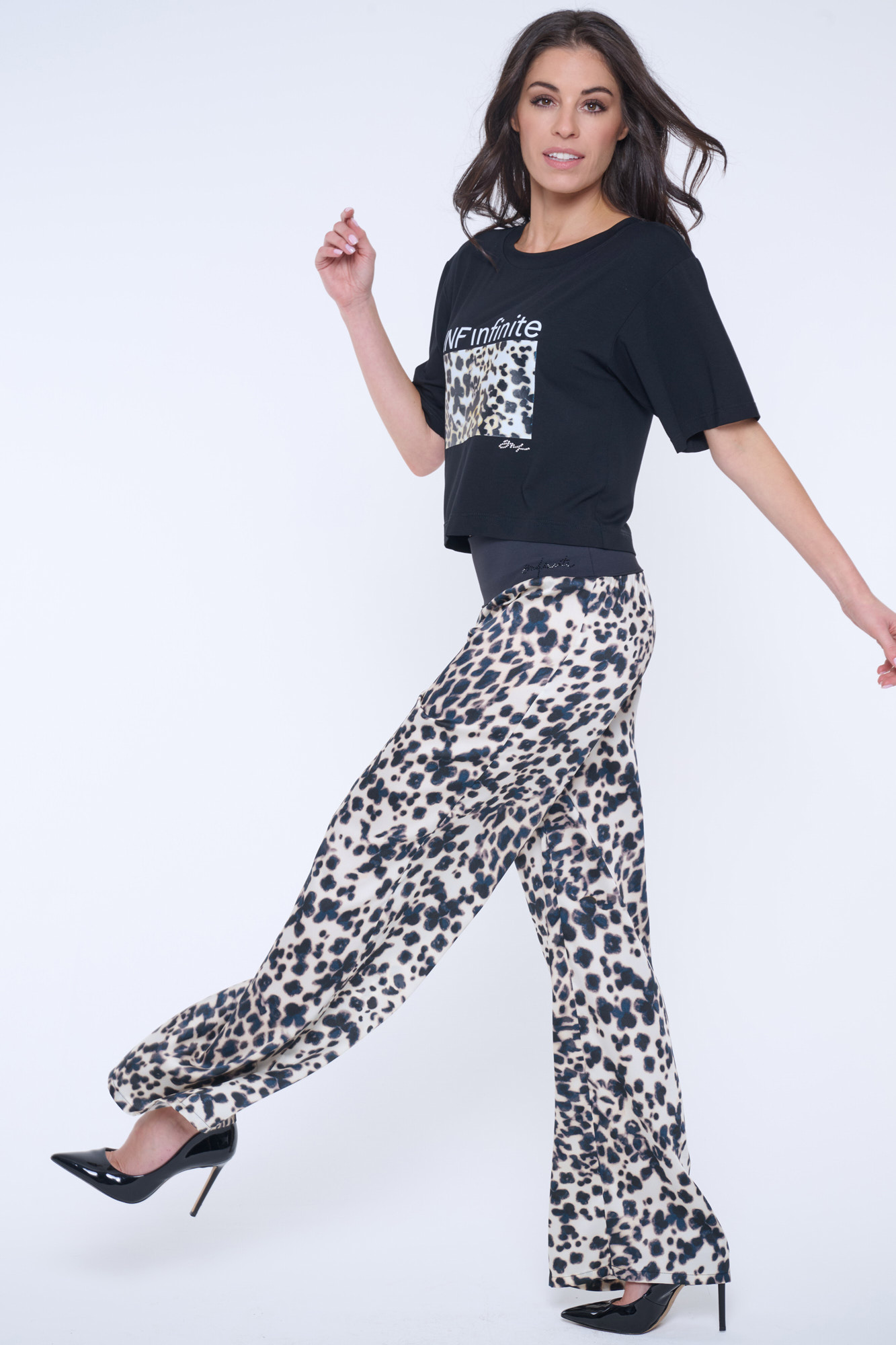 Kalhoty rovného volnějšího střihu z módního tygřího dezénu. V pase sedlo, ze strečového materiálu, díky němu sedí střih všem postavám. Kalhoty vhodné na běžné nošení k teniskám nebo na slavnostnější příležitosti.