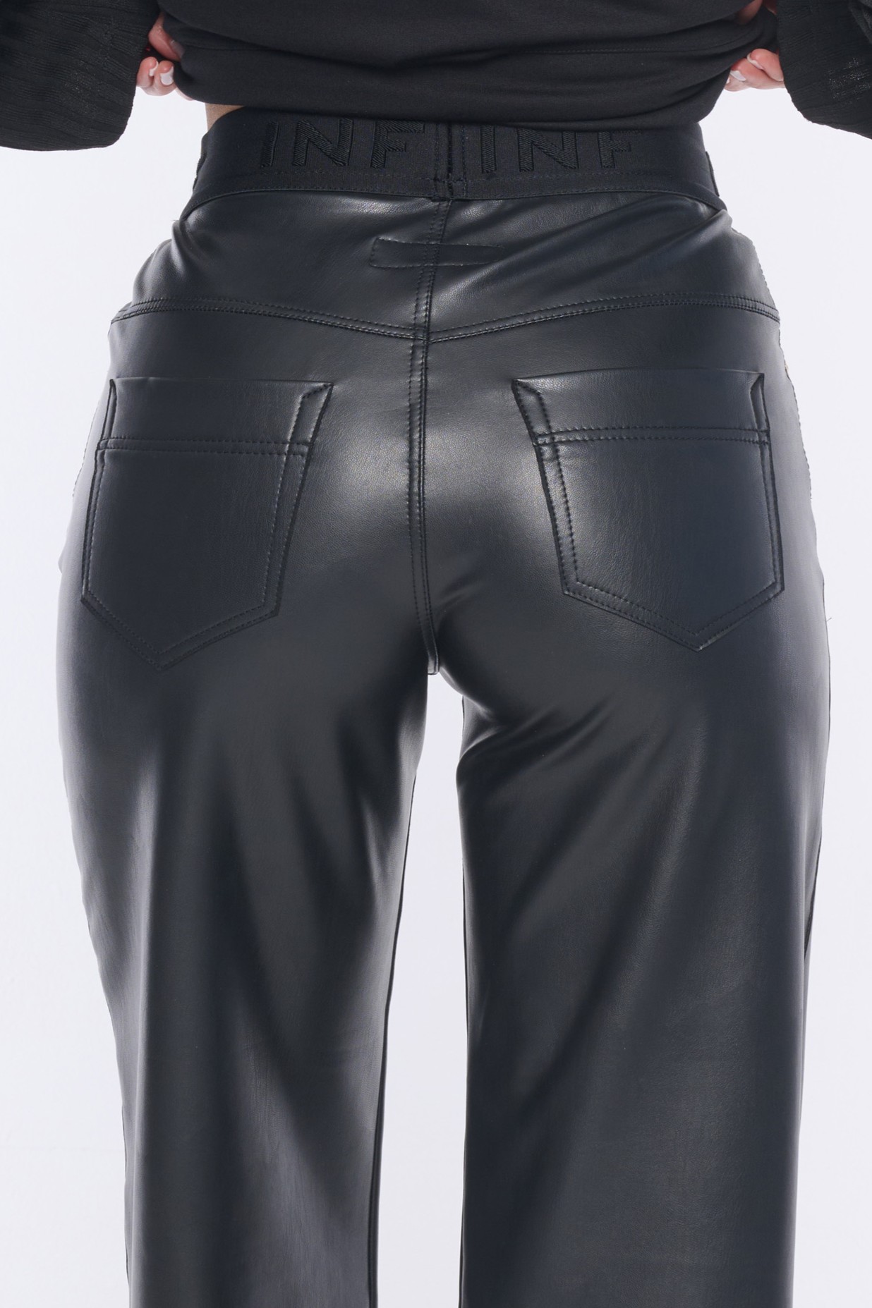Kalhoty "džínového" střihu s širokými nohavicemi. Vyrobeno z módní ekokůže. V pase efektní guma INF.