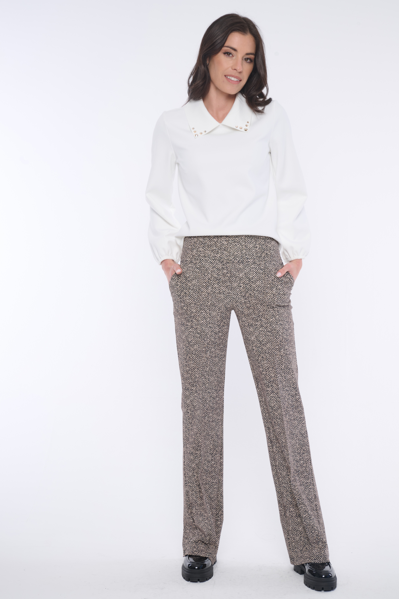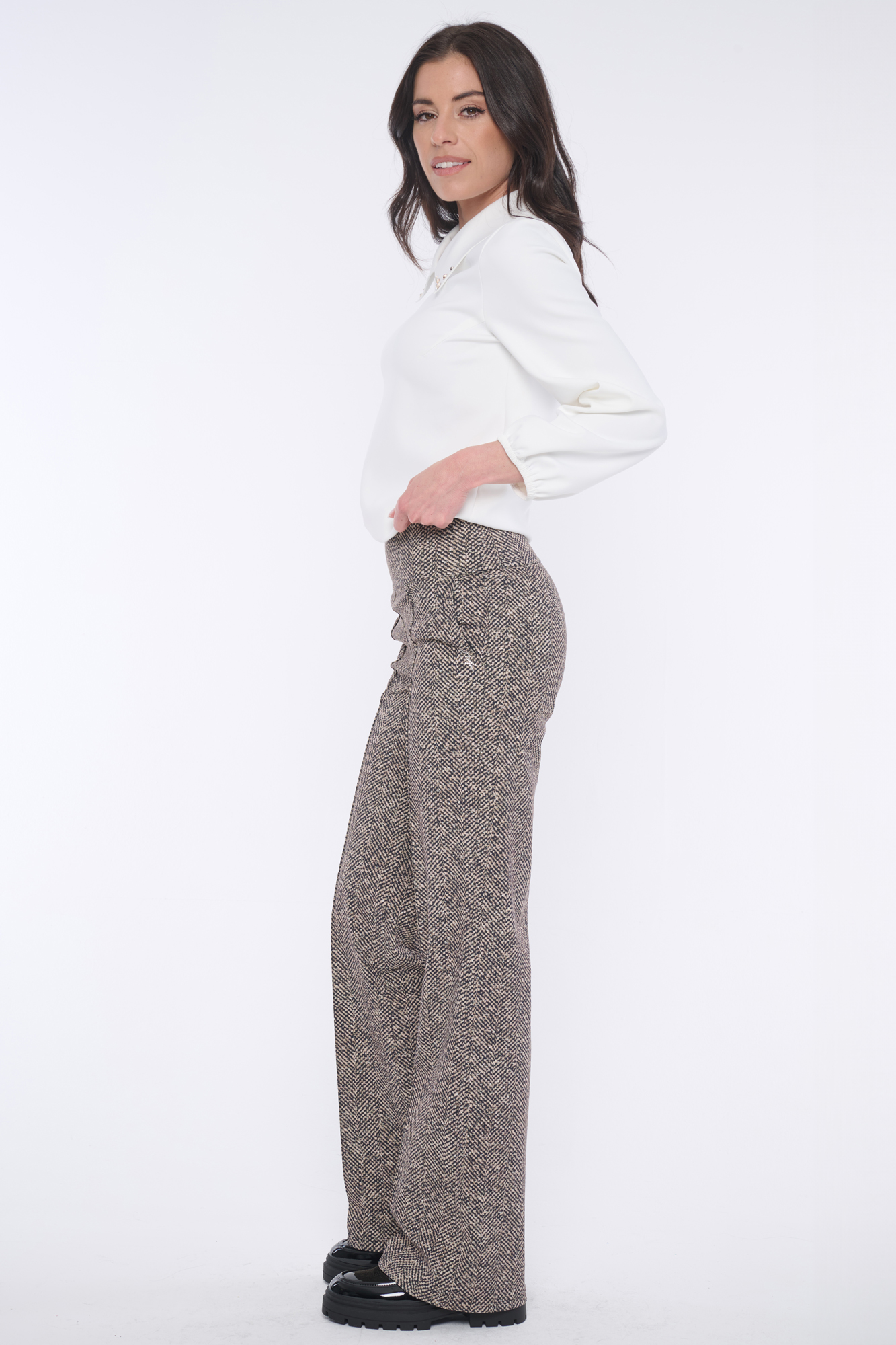 Kalhoty se širšími nohavicemi vyrobeny z úžasného, extrémně elastického námi dlouhými roky prověřeného materiálu "SENSITIVE. Strečový pas. V tomto modelu spojujeme trendy "tvíd" s vlastnostmi nadčasového bezúdržbového materiálu SENSITIVIVE. Nemusíte již chodit s tvídovým modelem do čistírny. Stačí ho vyprat v pračce, usušit a jít..... SENSITIVE materiál není třeba žehlit.