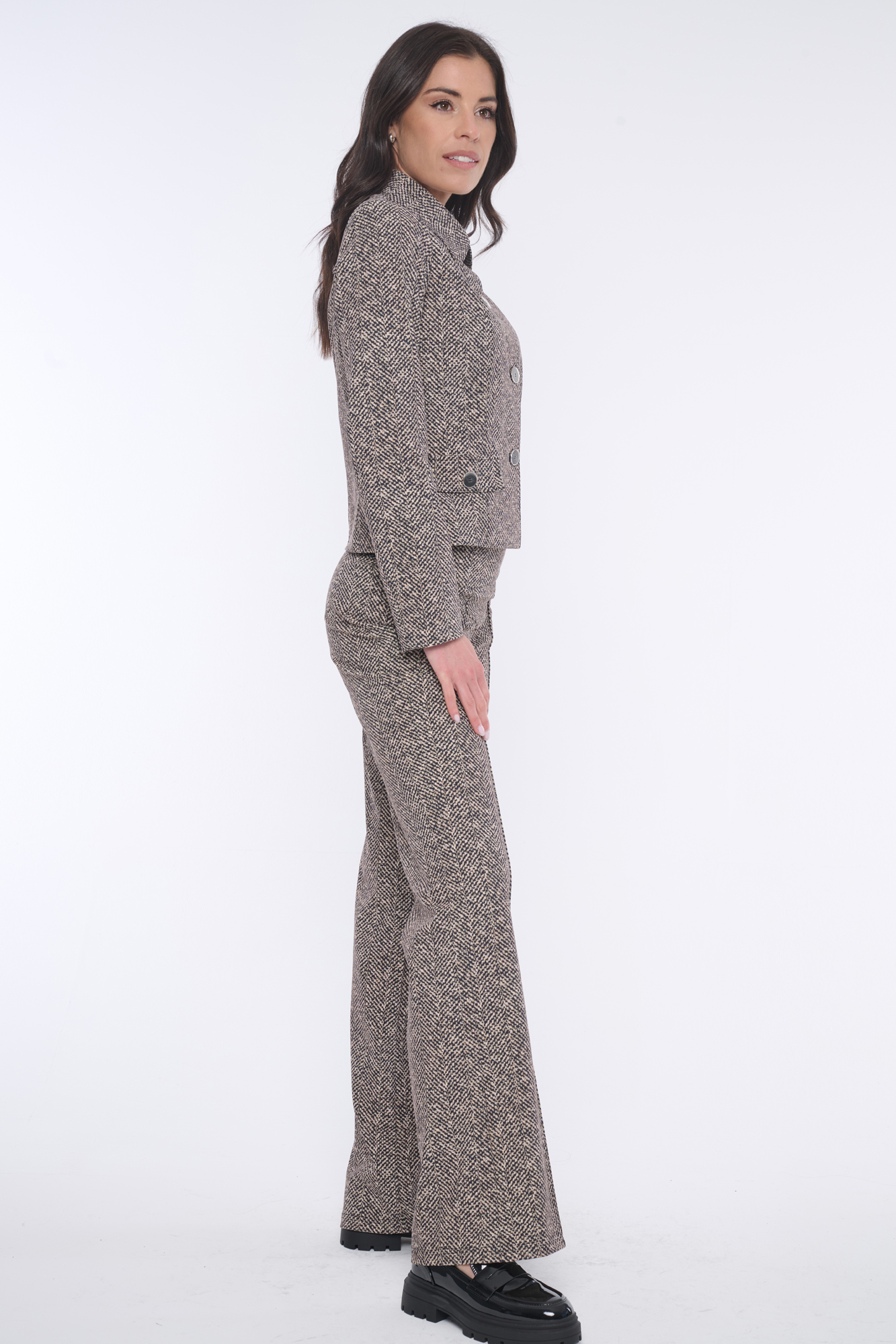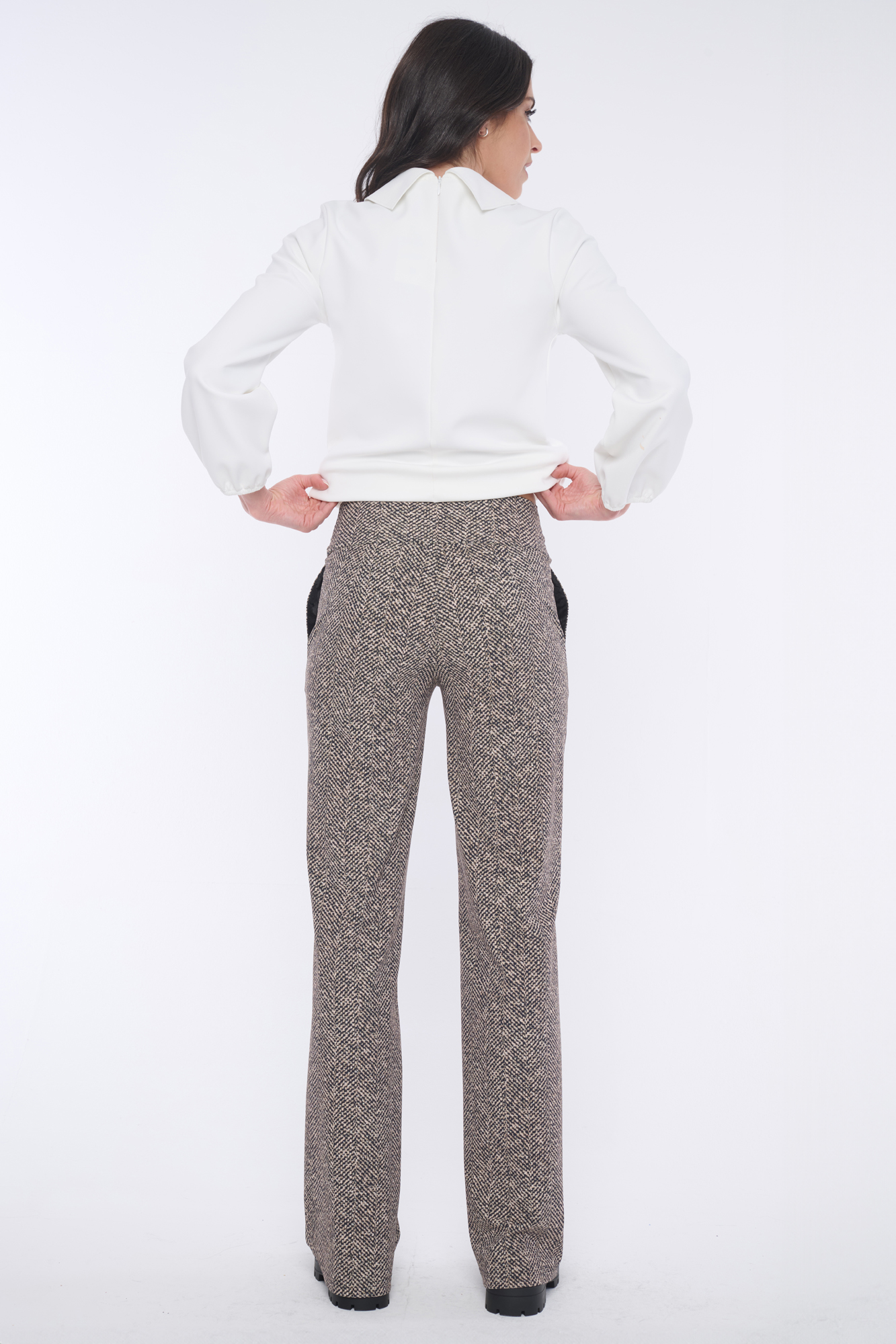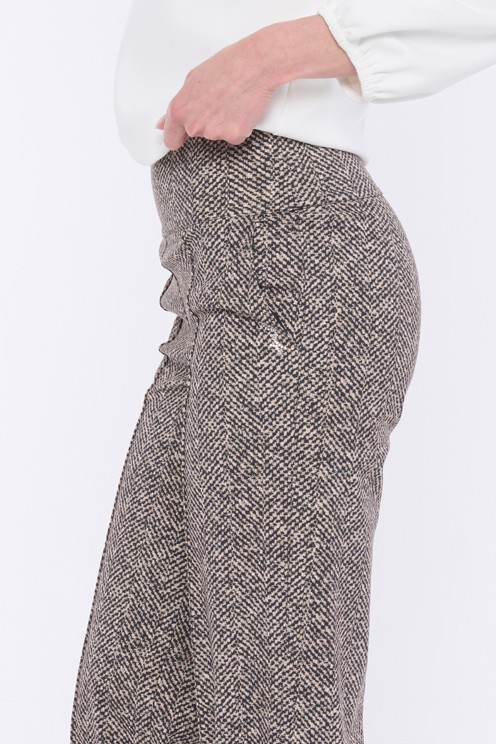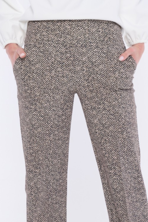 Tyto kalhoty jsou vhodné nosit samostatně k uni vrchním outfitům nebo jako módní kalhotový kostým společně s tvídovým sakem ze stejné kolekce.