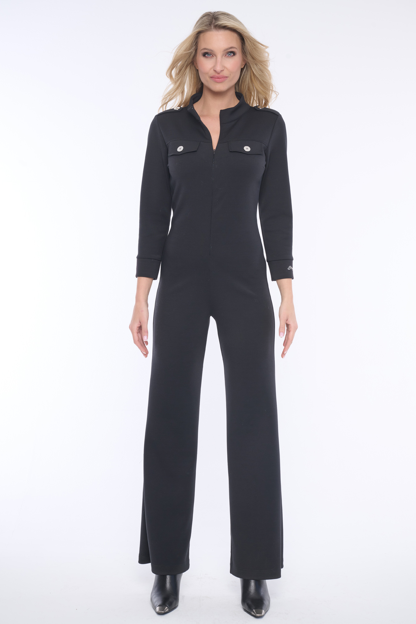 Dlouhý elegantní overal z velmi příjemného materiálu ozdobený lesklými knoflíky. Praktické rozepínání na zip z přední strany.