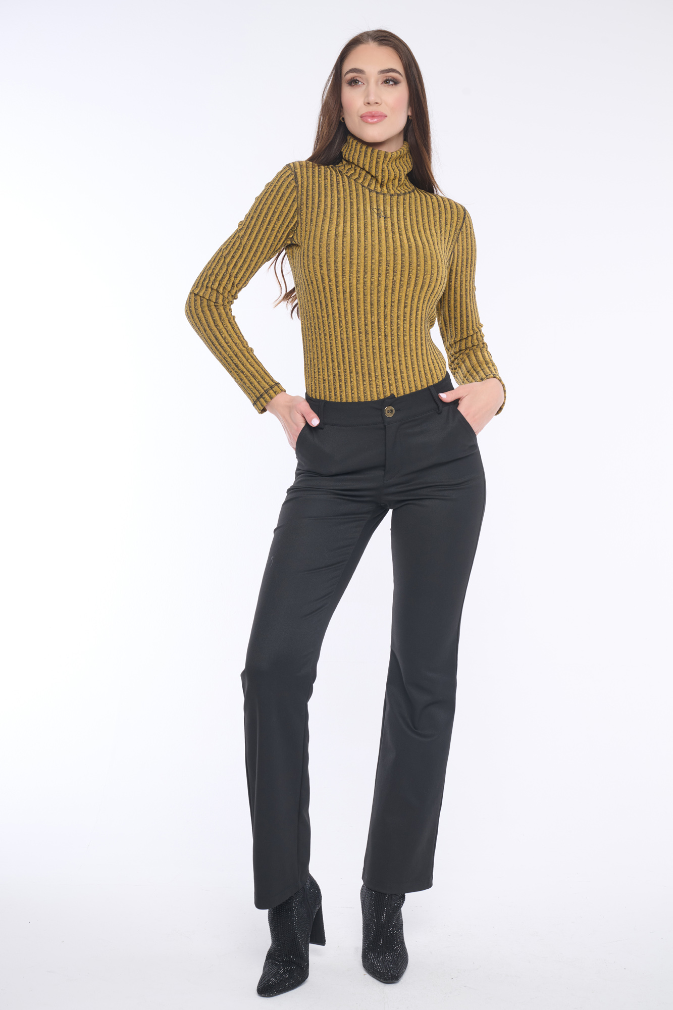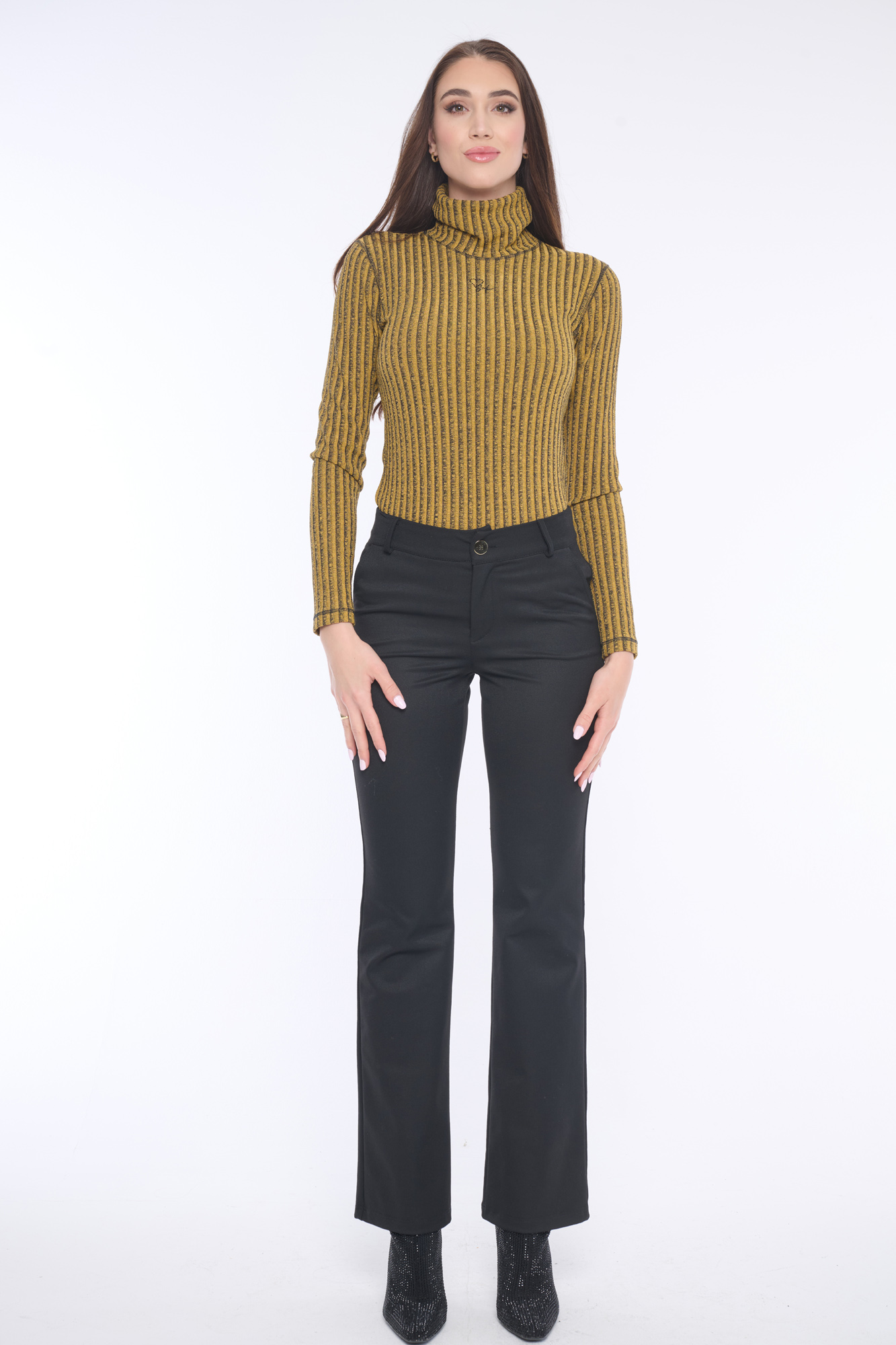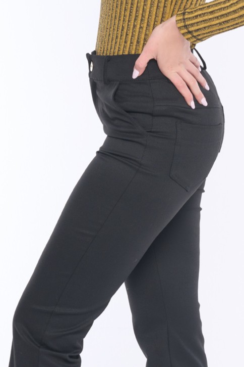 Klasické elegantní kalhoty rovného střihu doplněné lesklým knoflíkem. Dostupné ve dvou barevných variantách.