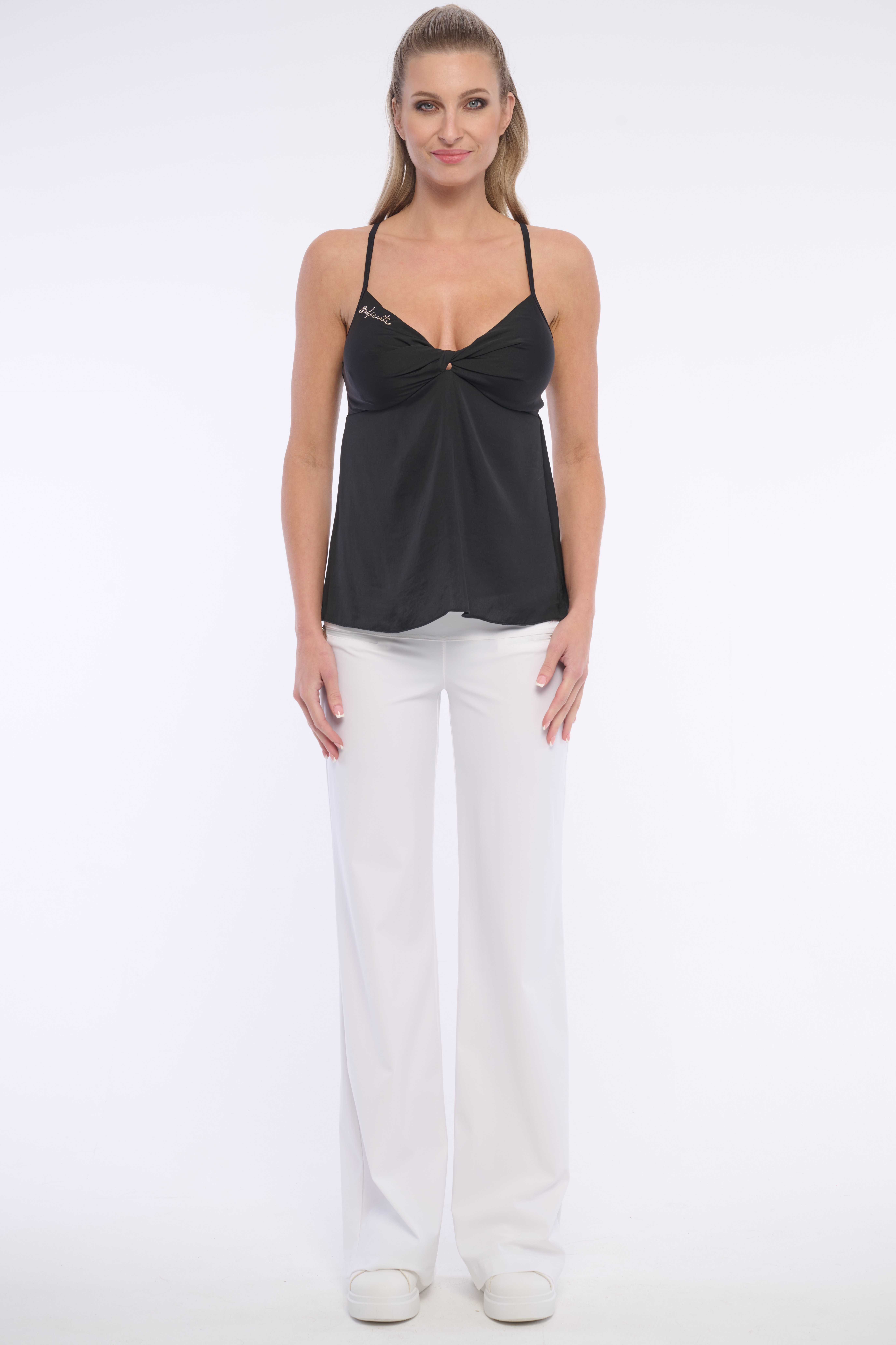 Splývavé kalhoty s vysokým pasem na každou příležitost doplněné zlatými zipy. Detail tvoří logo z luxusních krystalů Swarowski.