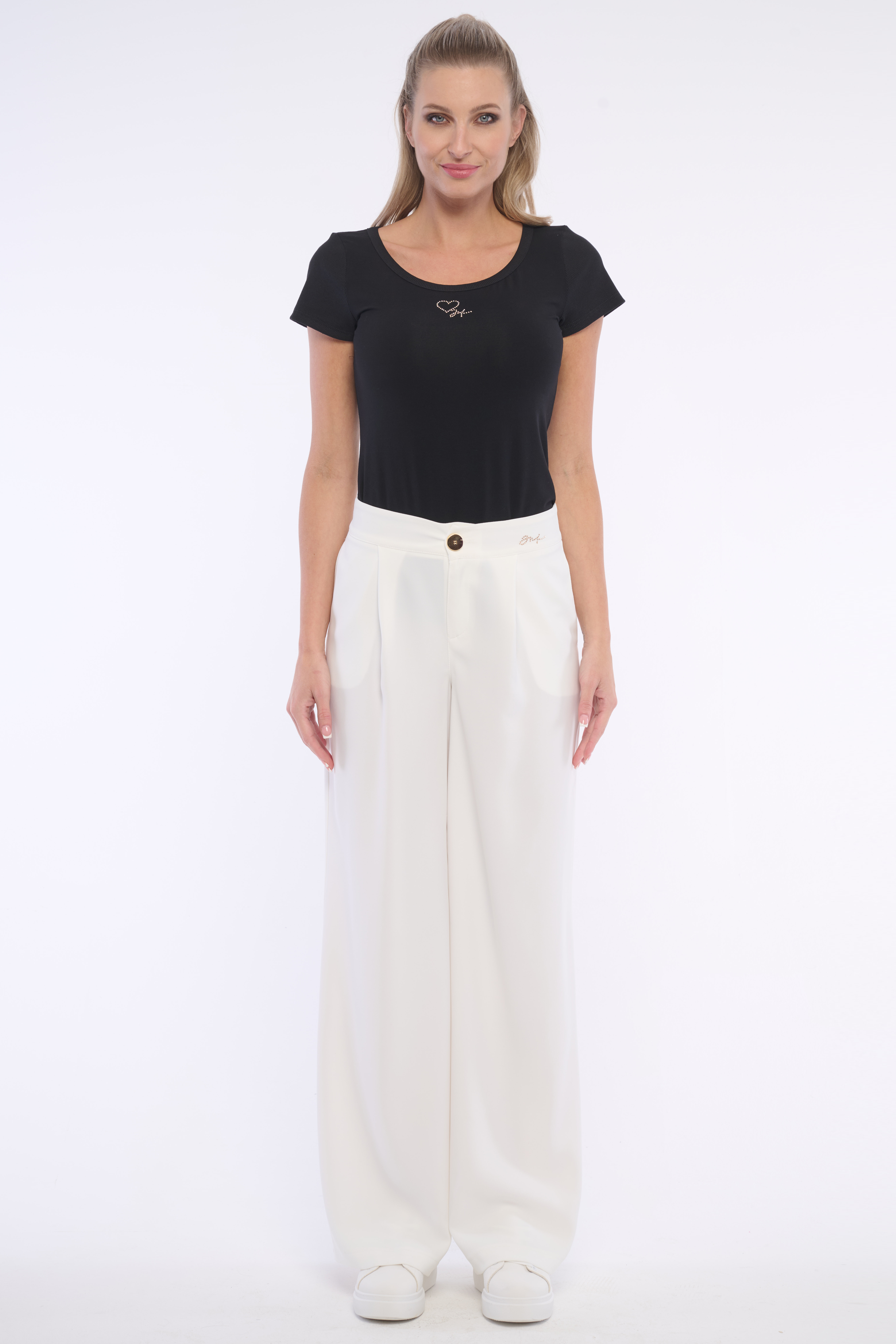 Klasické volné kalhoty s vysokým pasem na knoflík. Detail tvoří logo z luxusních krystalů Swarowski. Dostupné ve dvou barevných variantách.