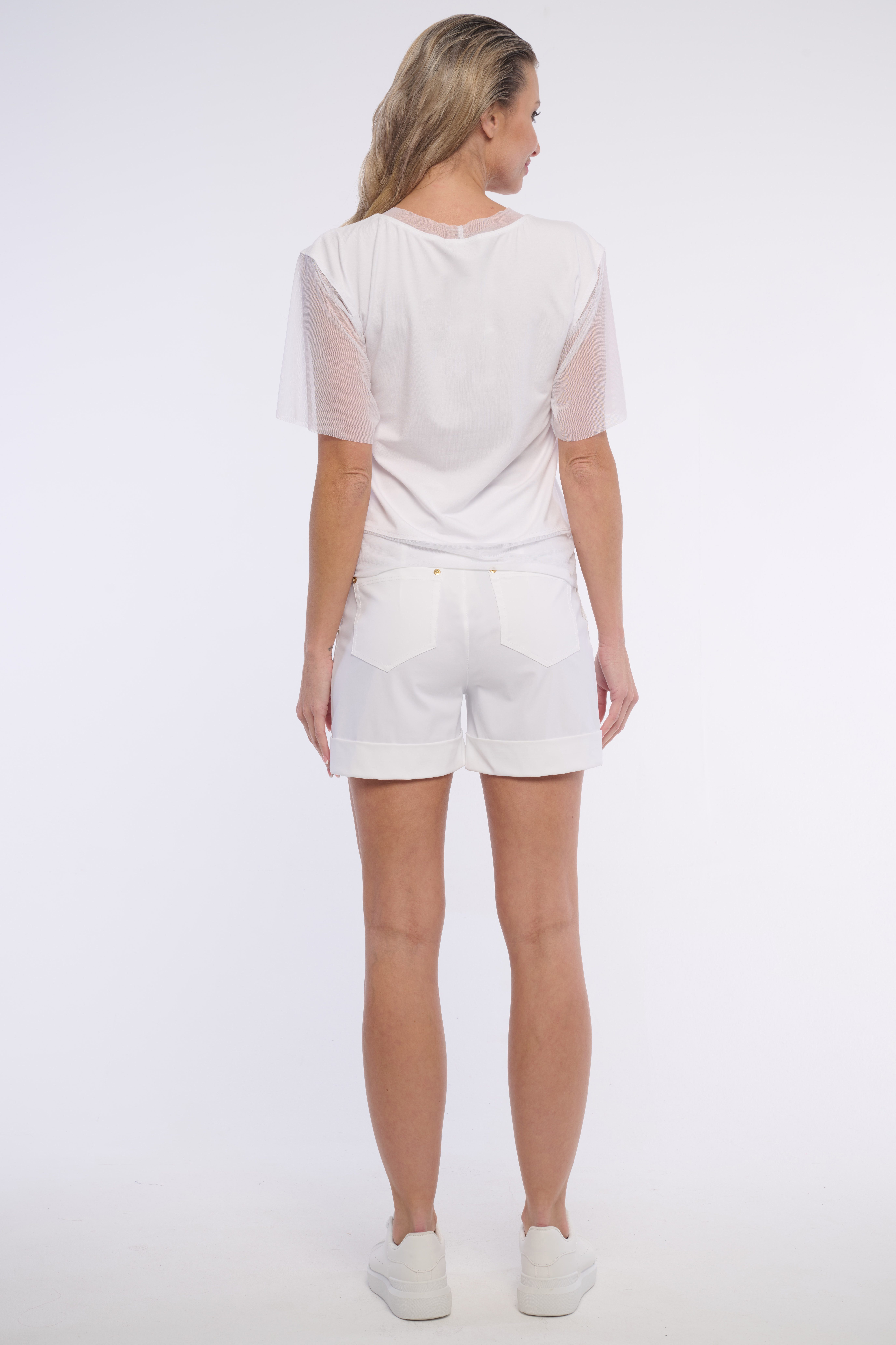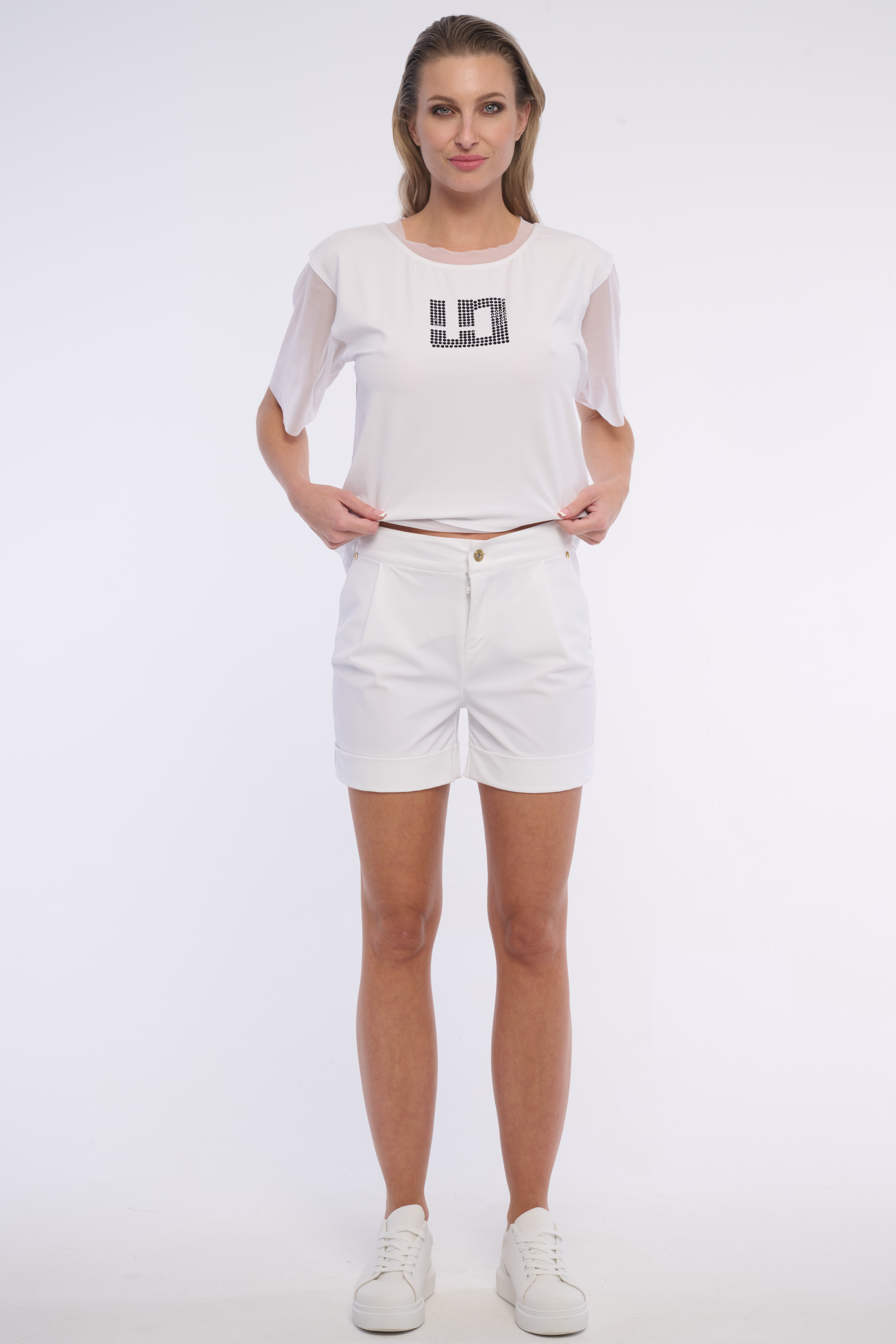 Elegantní šortky z pohodlného materiálu, vhodné i na volný čas, doplněné zlatým knoflíkem. Dostupné ve dvou barevných variantách.