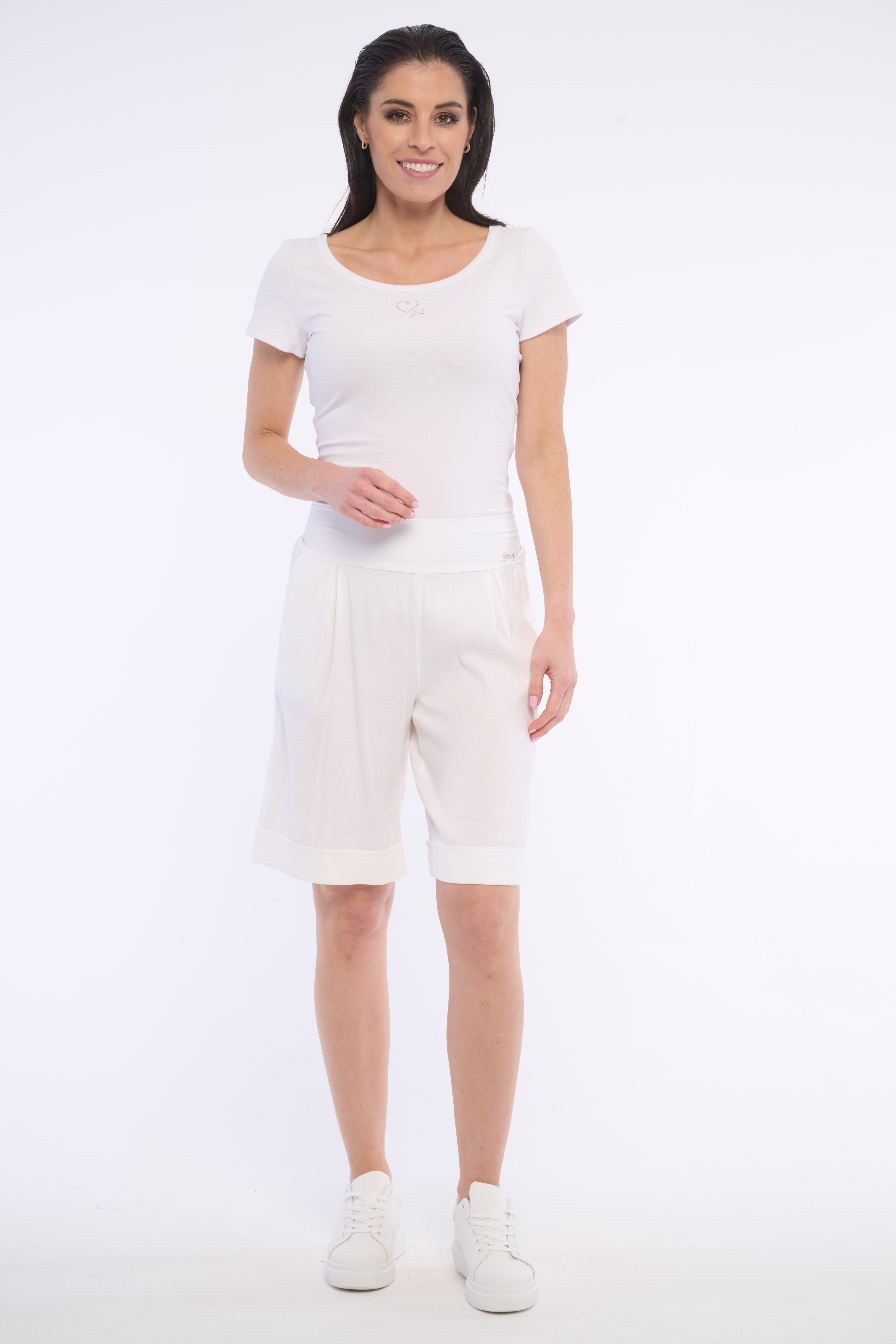 Delší volné lněné kraťasy s vysokým přilehavým pasem, který krásně tvaruje postavu. Detail tvoří logo z luxusních krystalů Swarowski. Dostupné ve dvou barevných variantách.