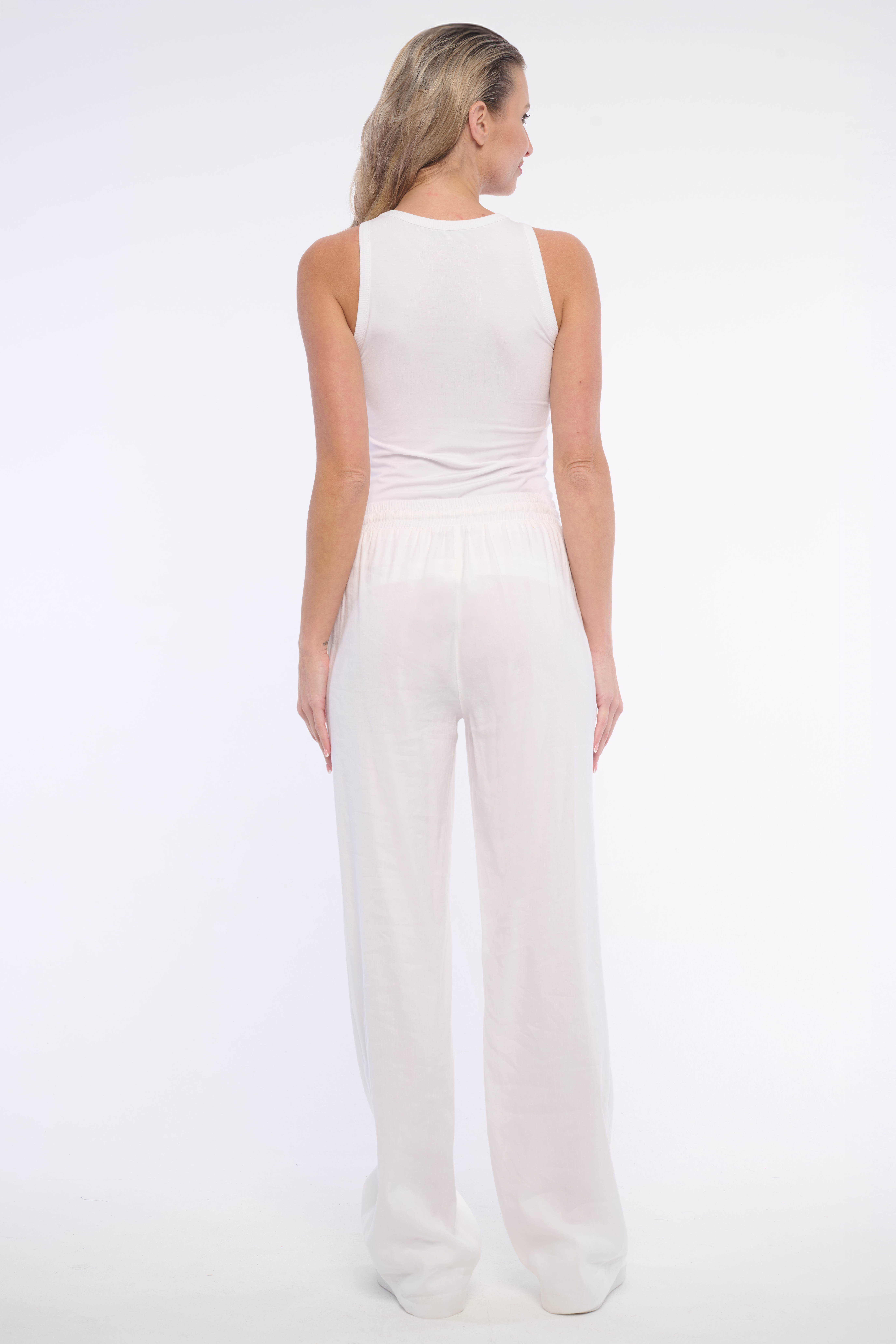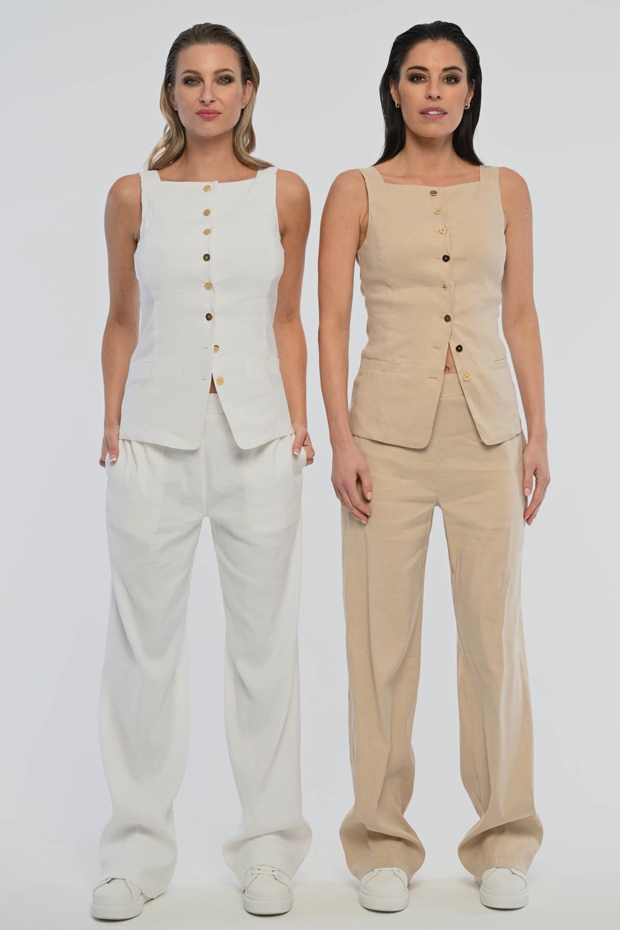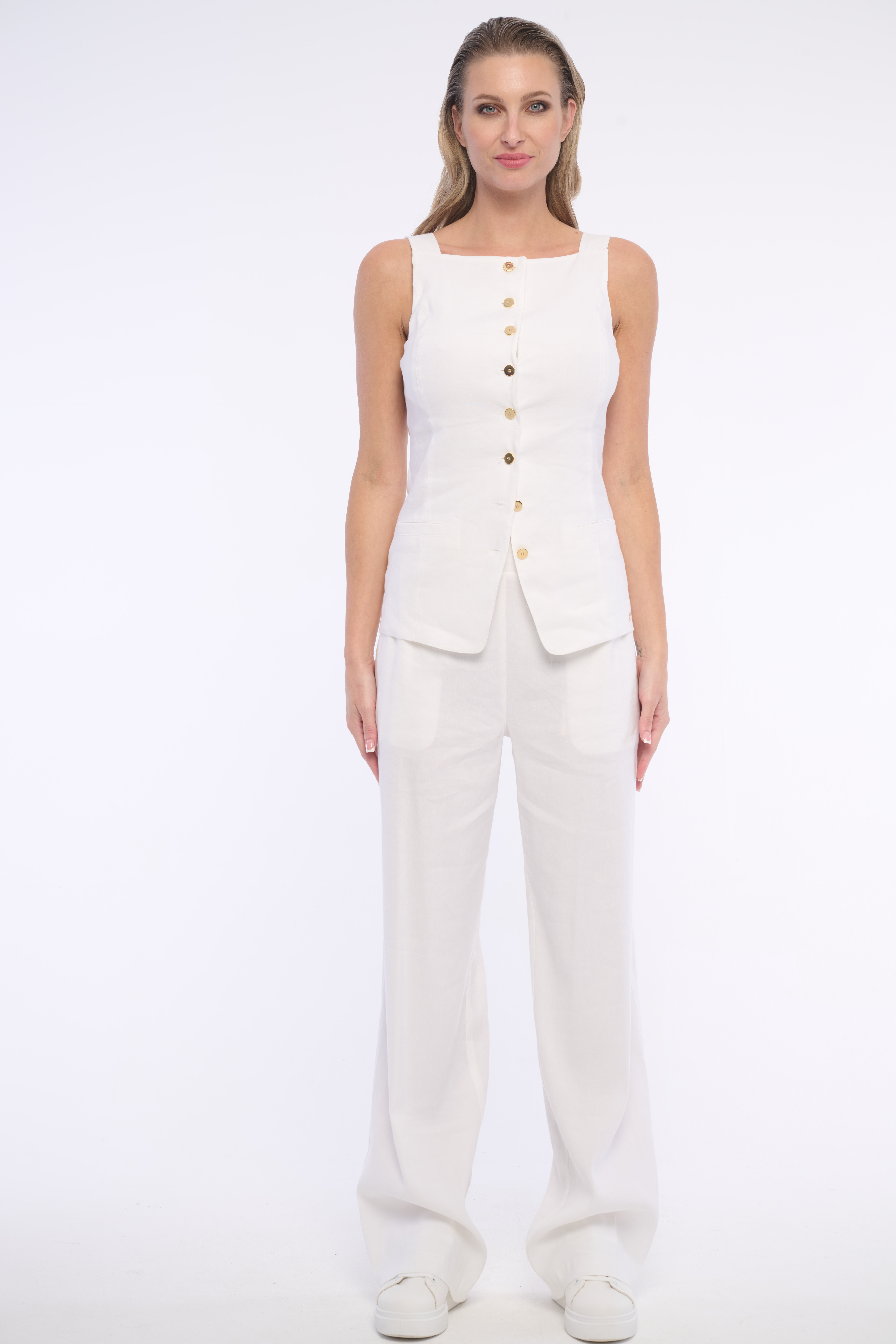Pohodlné lněné kalhoty se zavazováním v pase. Detail na kapse tvoří logo z luxusních krystalů Swarowski. Ideální do kompletu s naší lněnou elegantní vestičkou. Dostupné ve dvou barevných variantách.