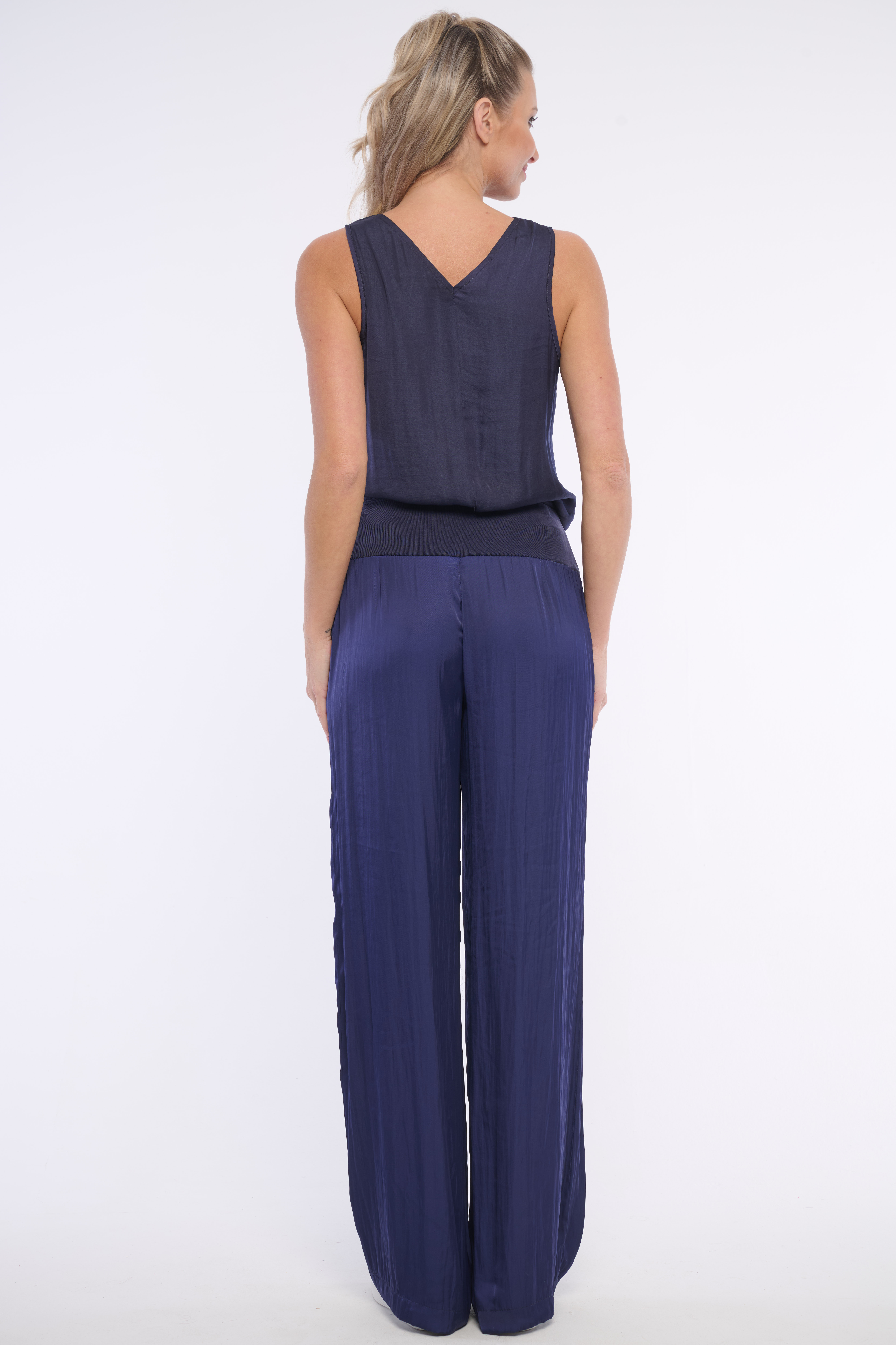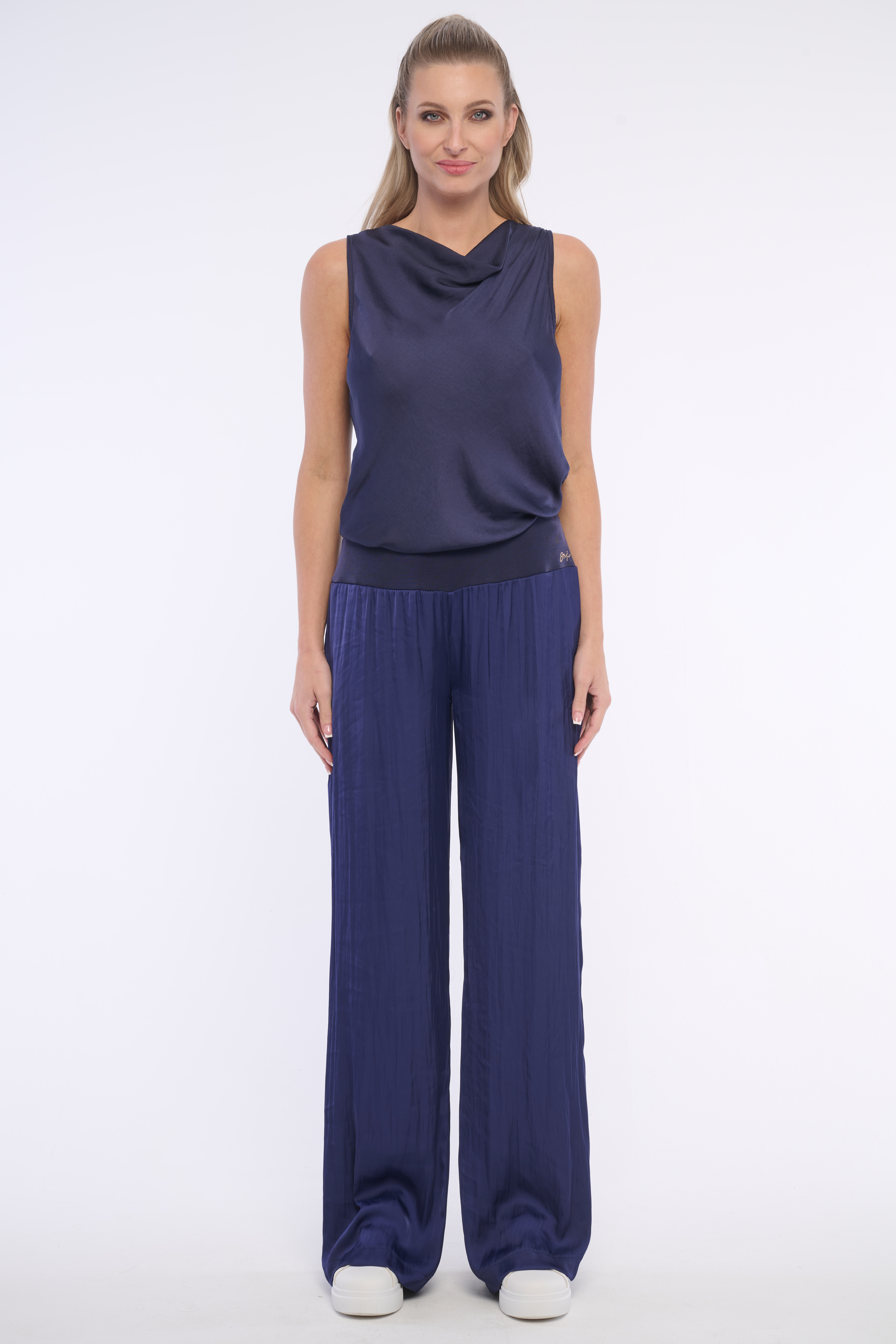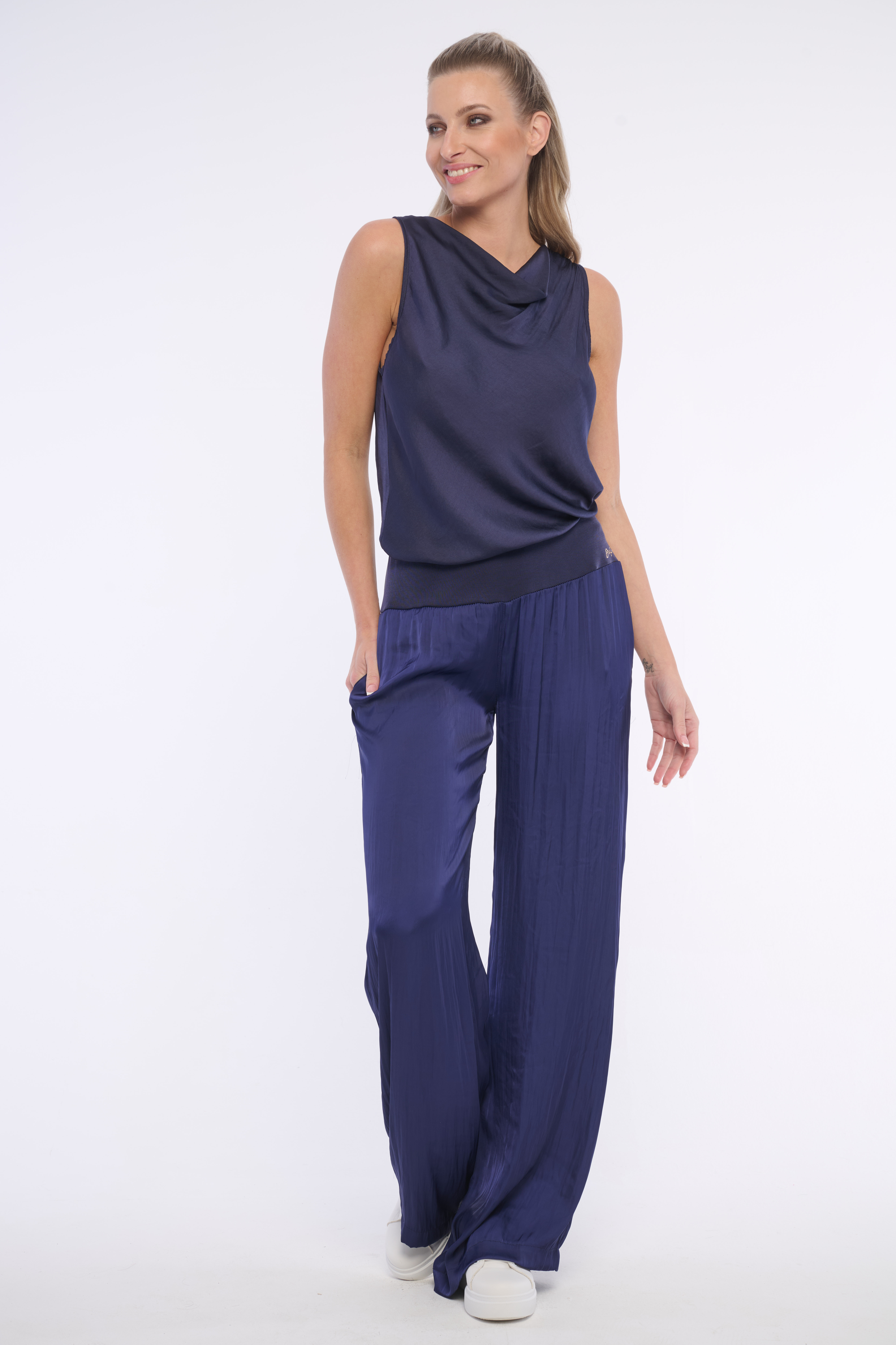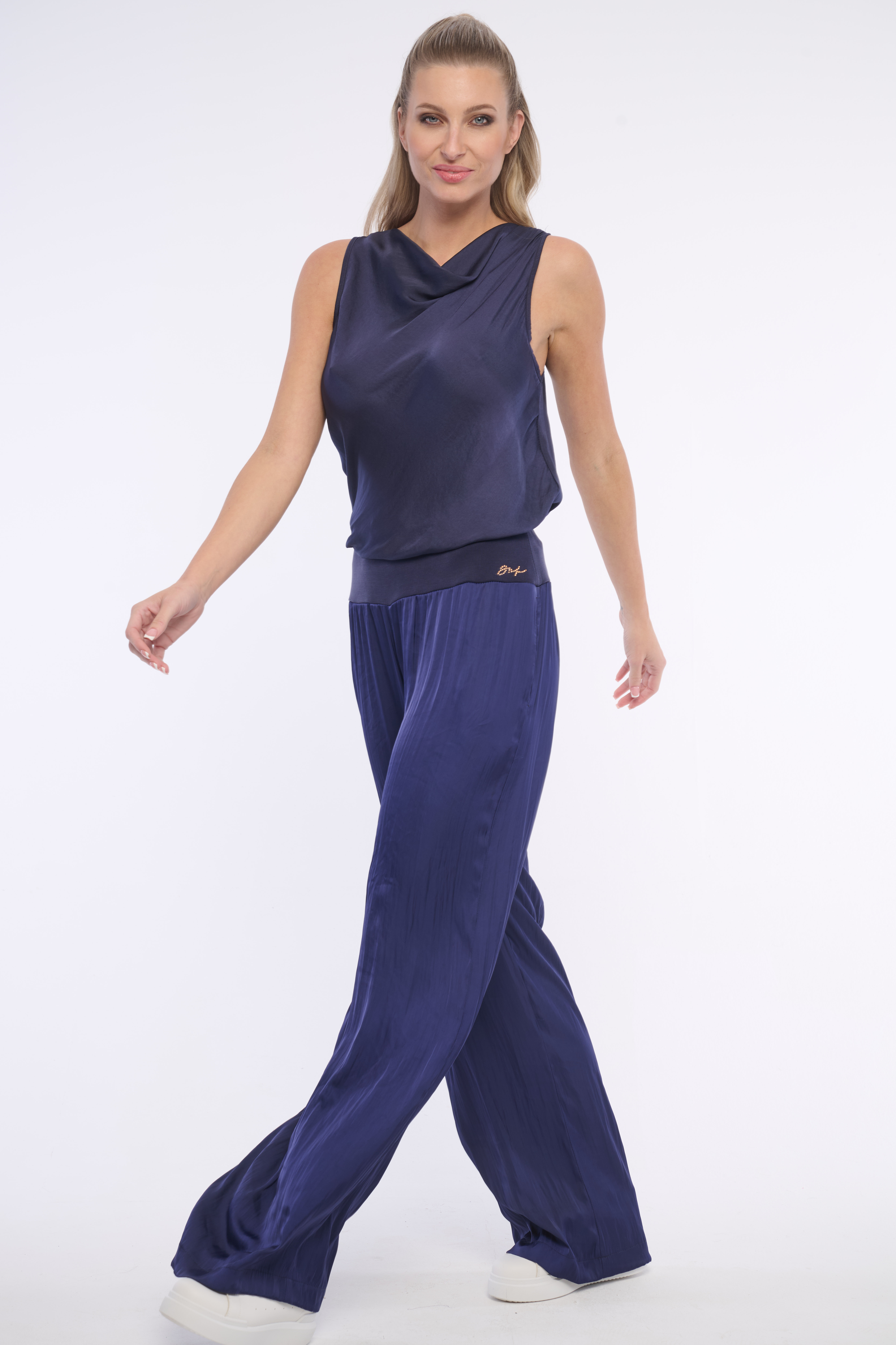 Pohodlné volné kalhoty z příjemného materiálu. Skvěle se kombinují s jakýmkoliv vrškem a jsou vhodné na volný čas i do kanceláře. Detail tvoří logo z luxusních krystalů Swarowski. Dostupné ve třech barevných variantách.