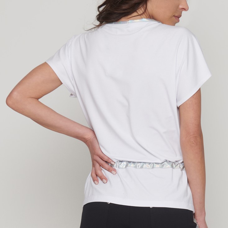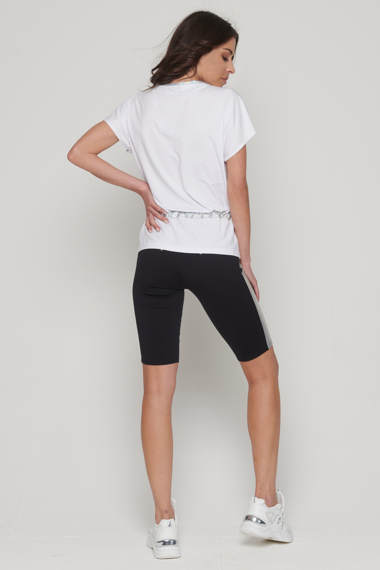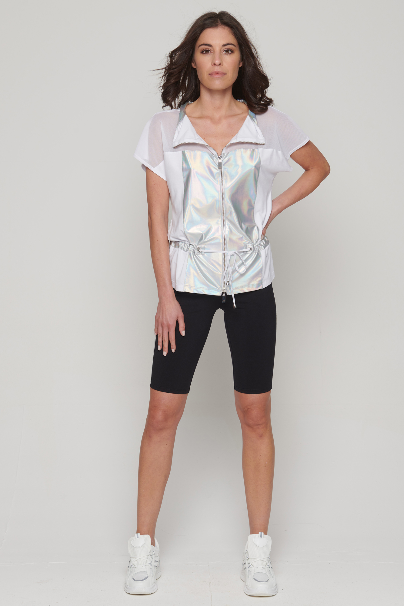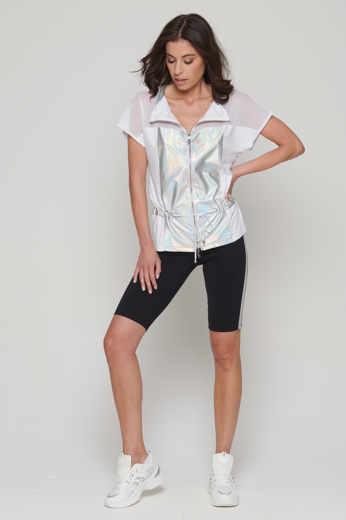 Bílá bundička s krátkým rukávem na stažení v pase, kombinace úpletu, tylu a lesklého materiálu, stříbrný zip a jiné doplňky, krystalové logo INF.