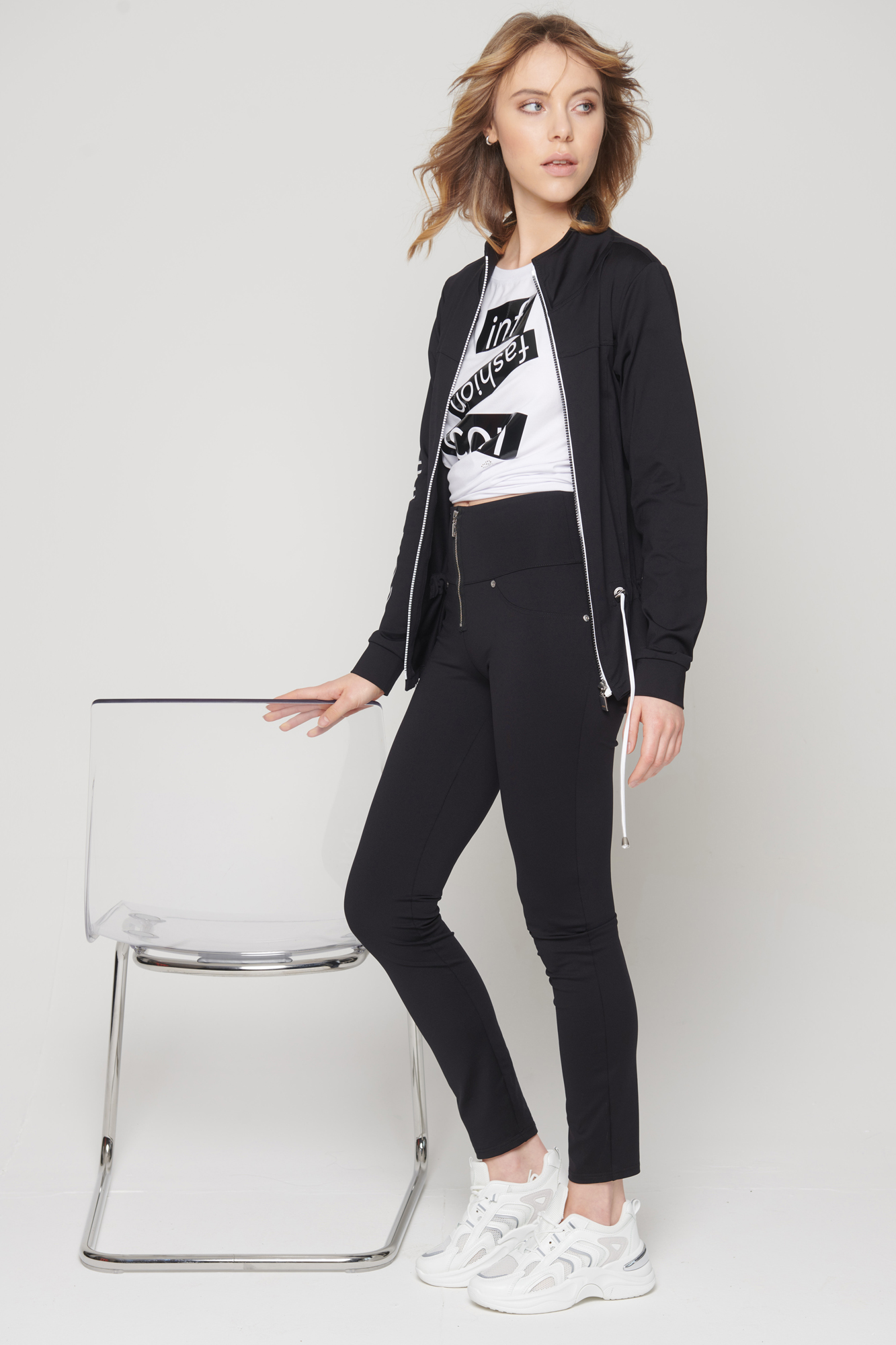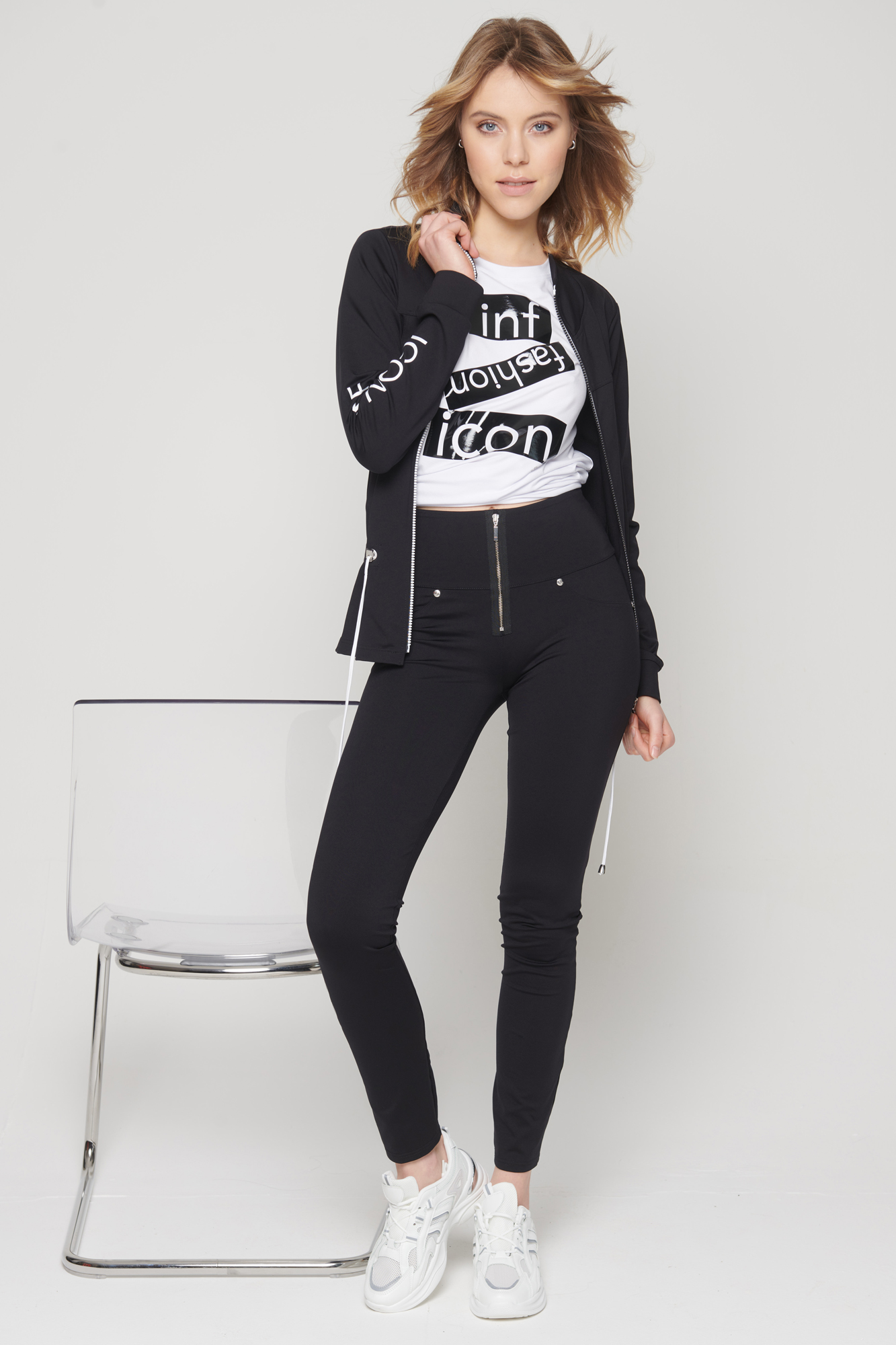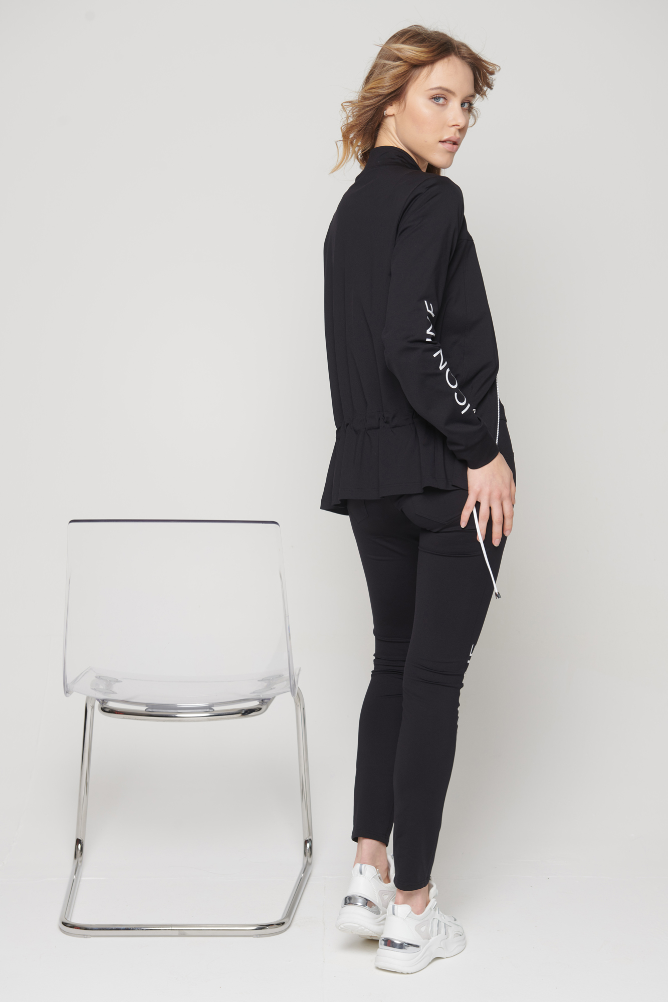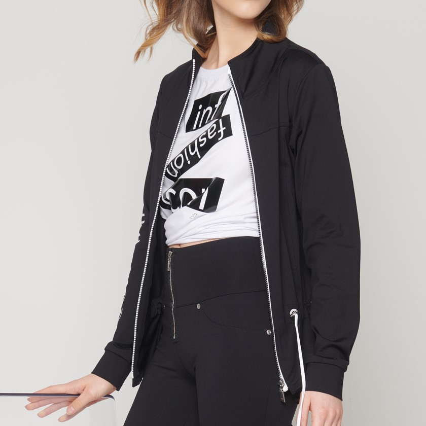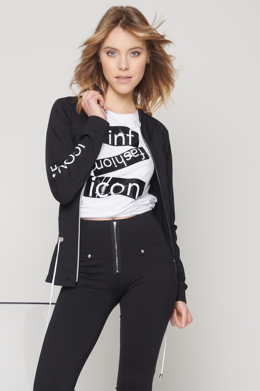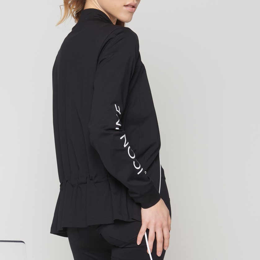 Úpletová černá bundička s logem na jednom rukávu a černobílým zipem, v pase na stažení.