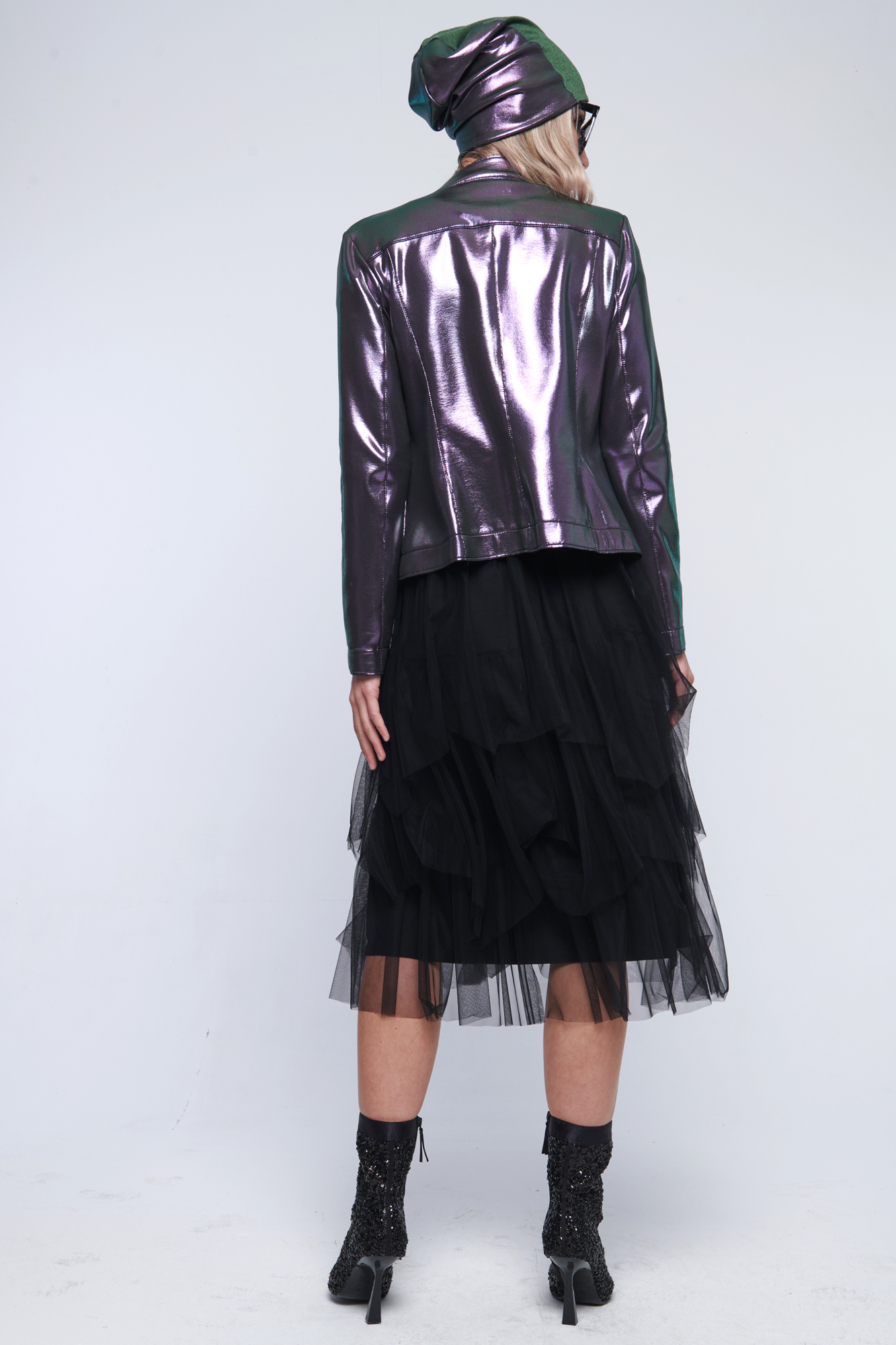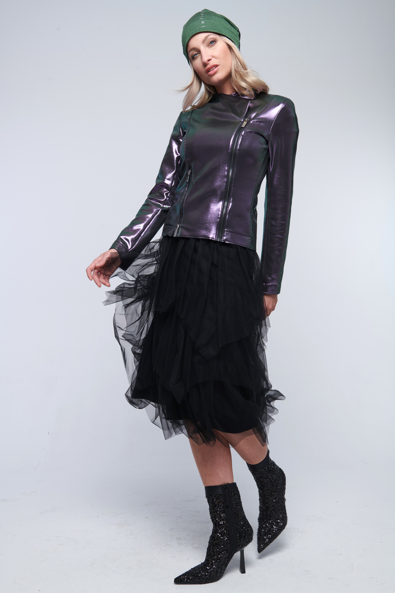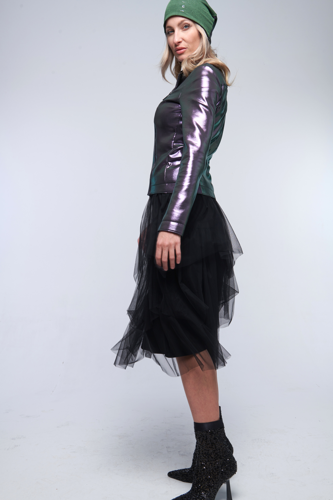 Bundička - křivák z efektního lesklého materiálu. Zlaté doplňky.