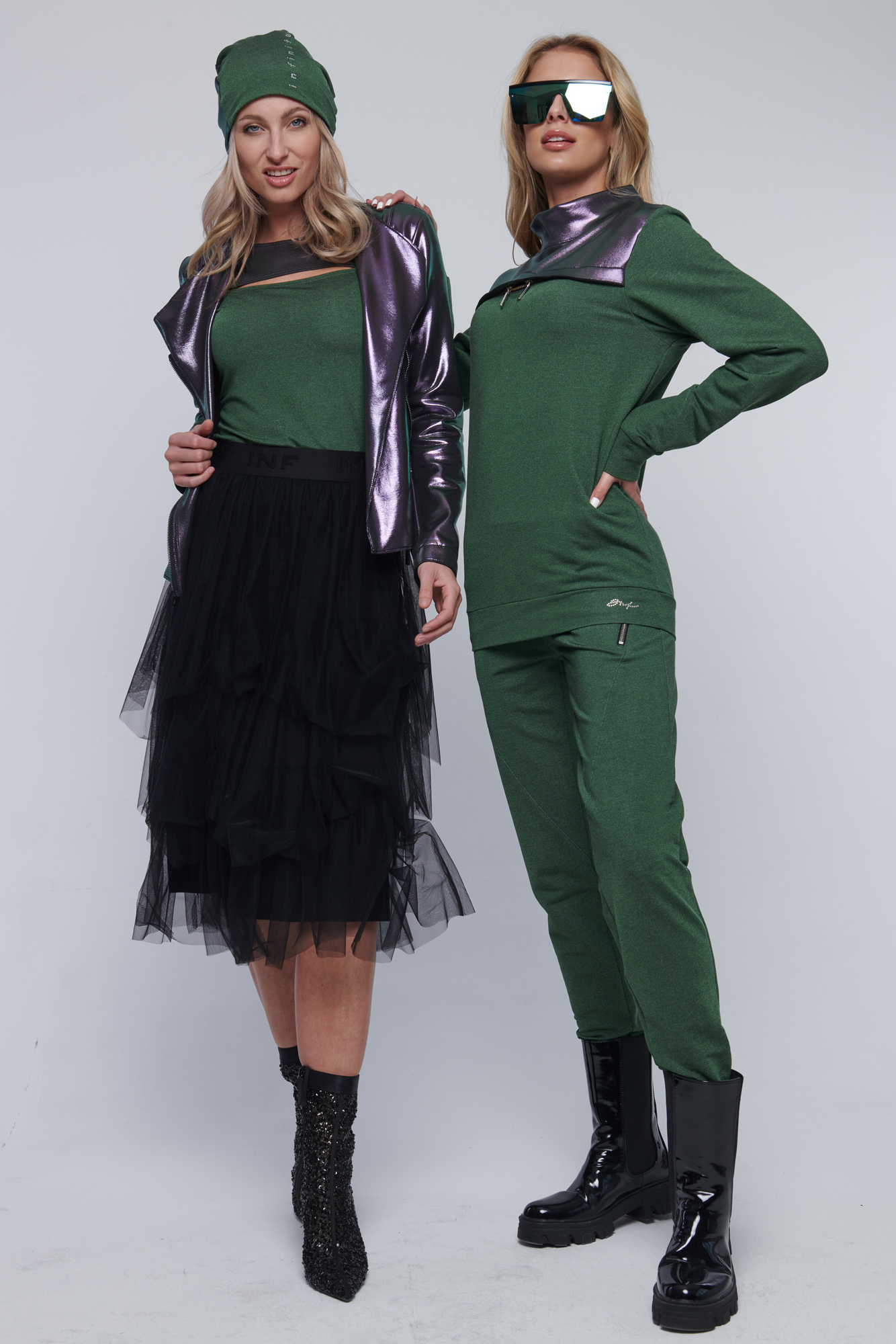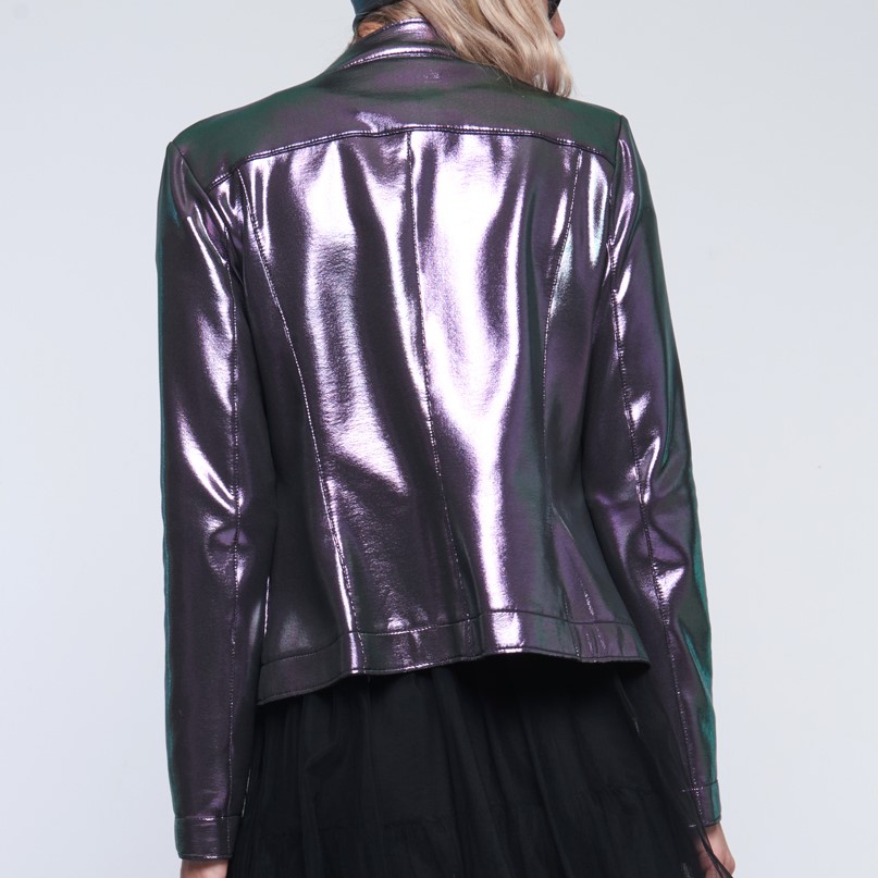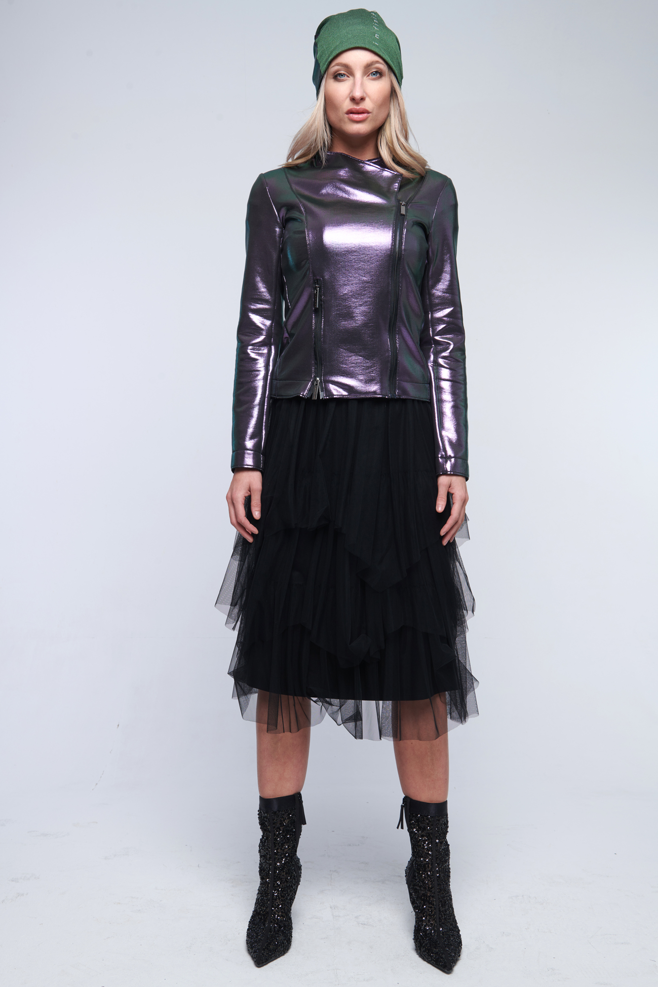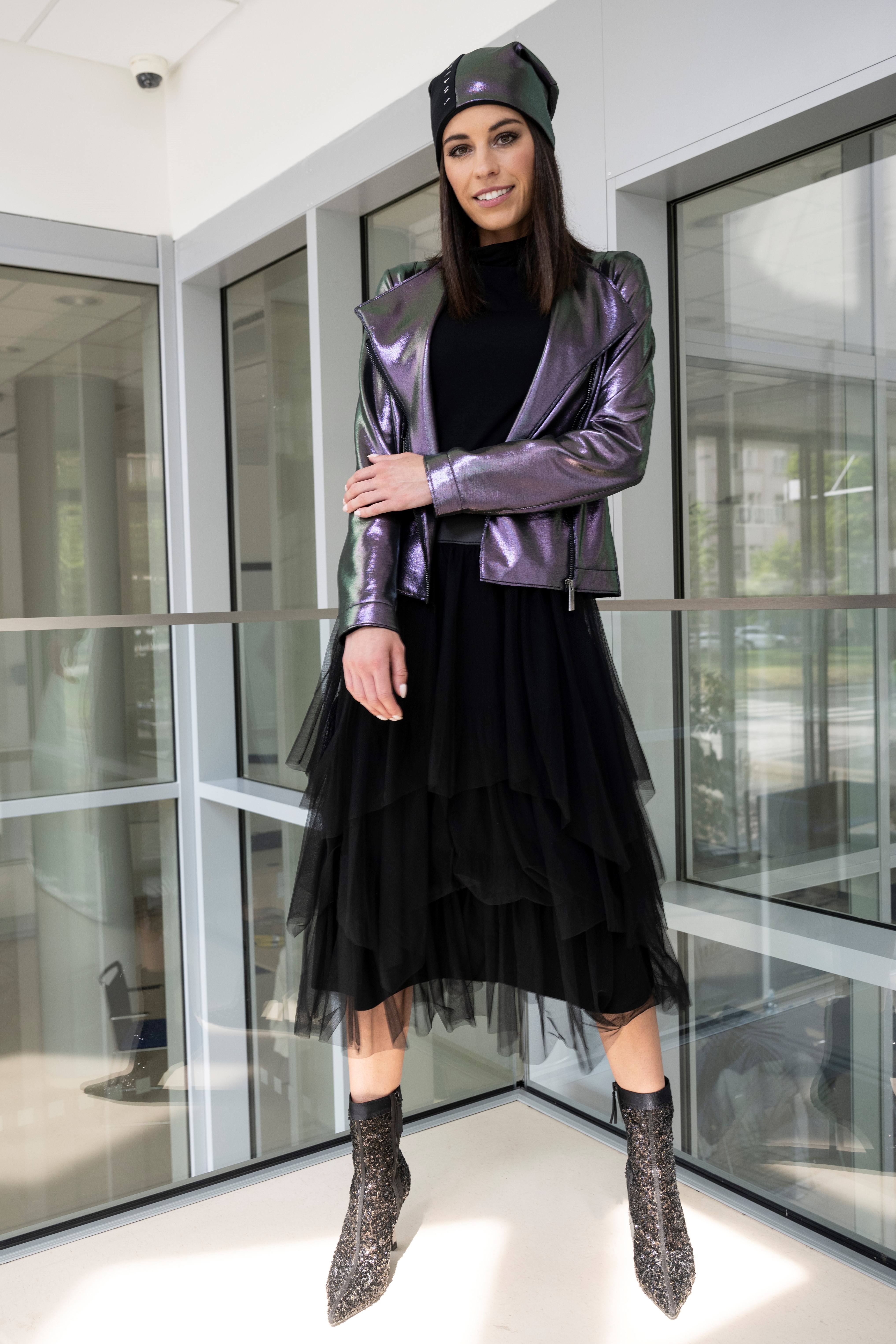 Bundička - křivák z efektního lesklého materiálu. Zlaté doplňky.
