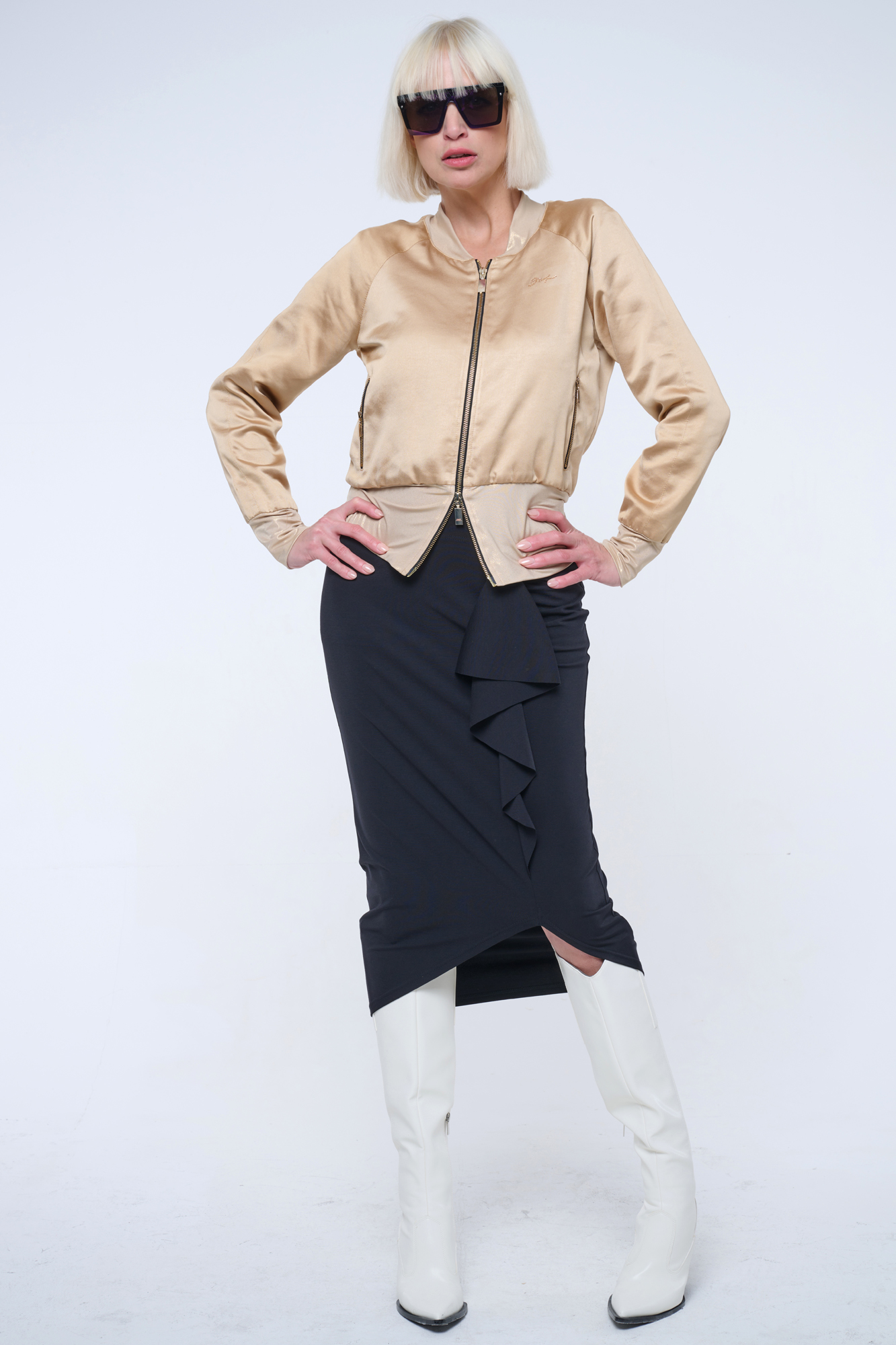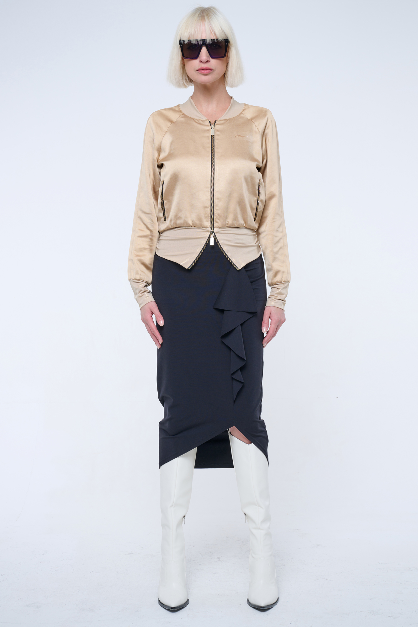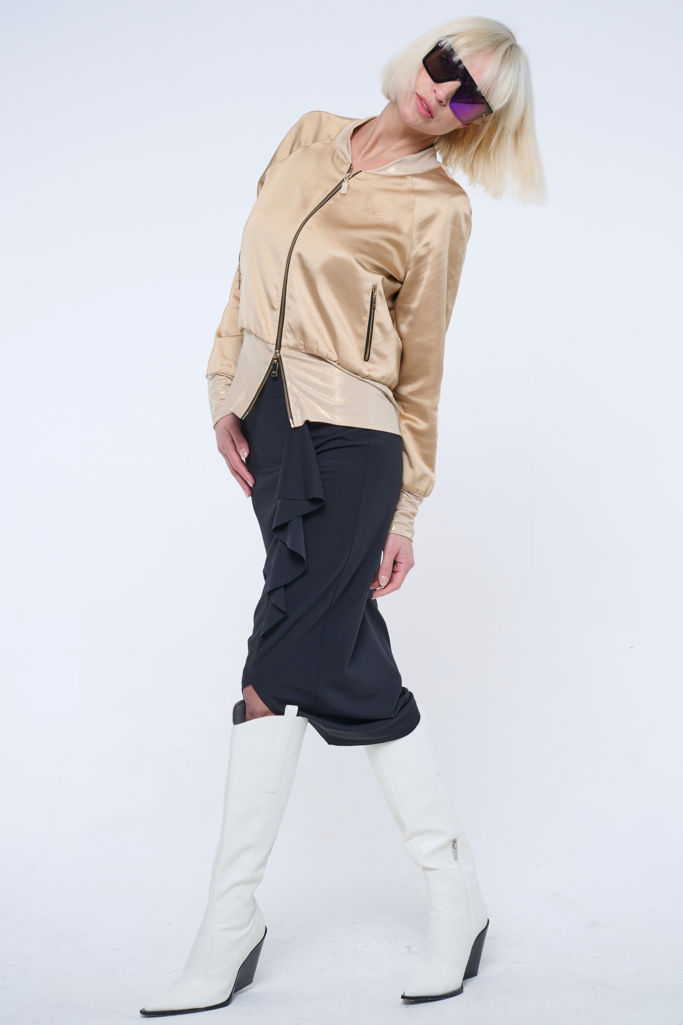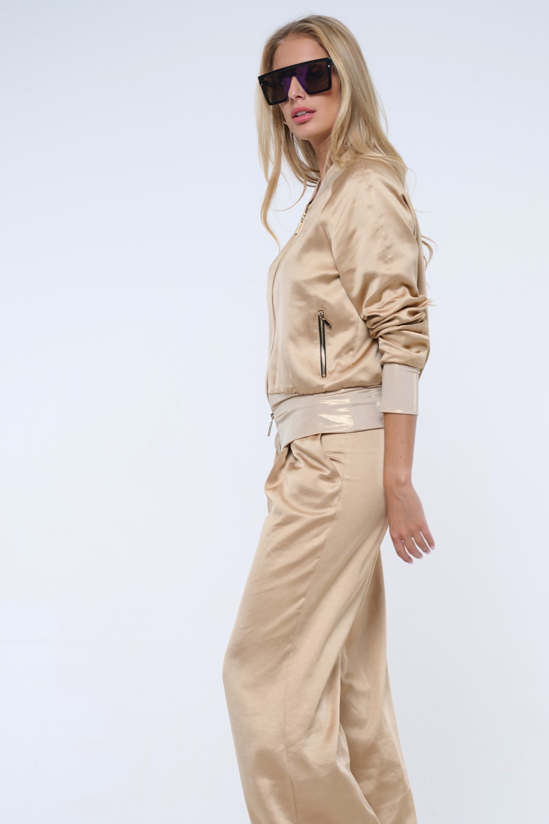 Bundička "bomber" z lesklého materiálu. V pase strečový úplet. Na předním díle zlaté krystalové logo INF.