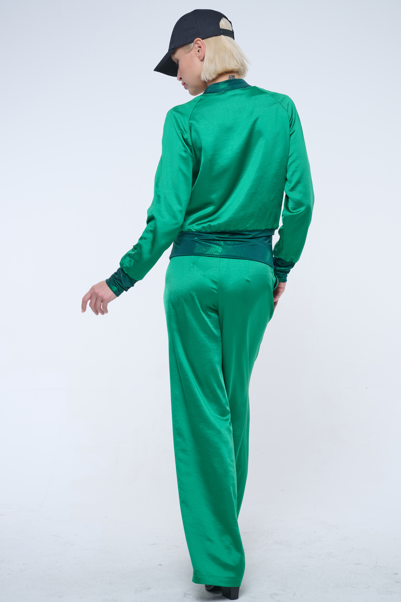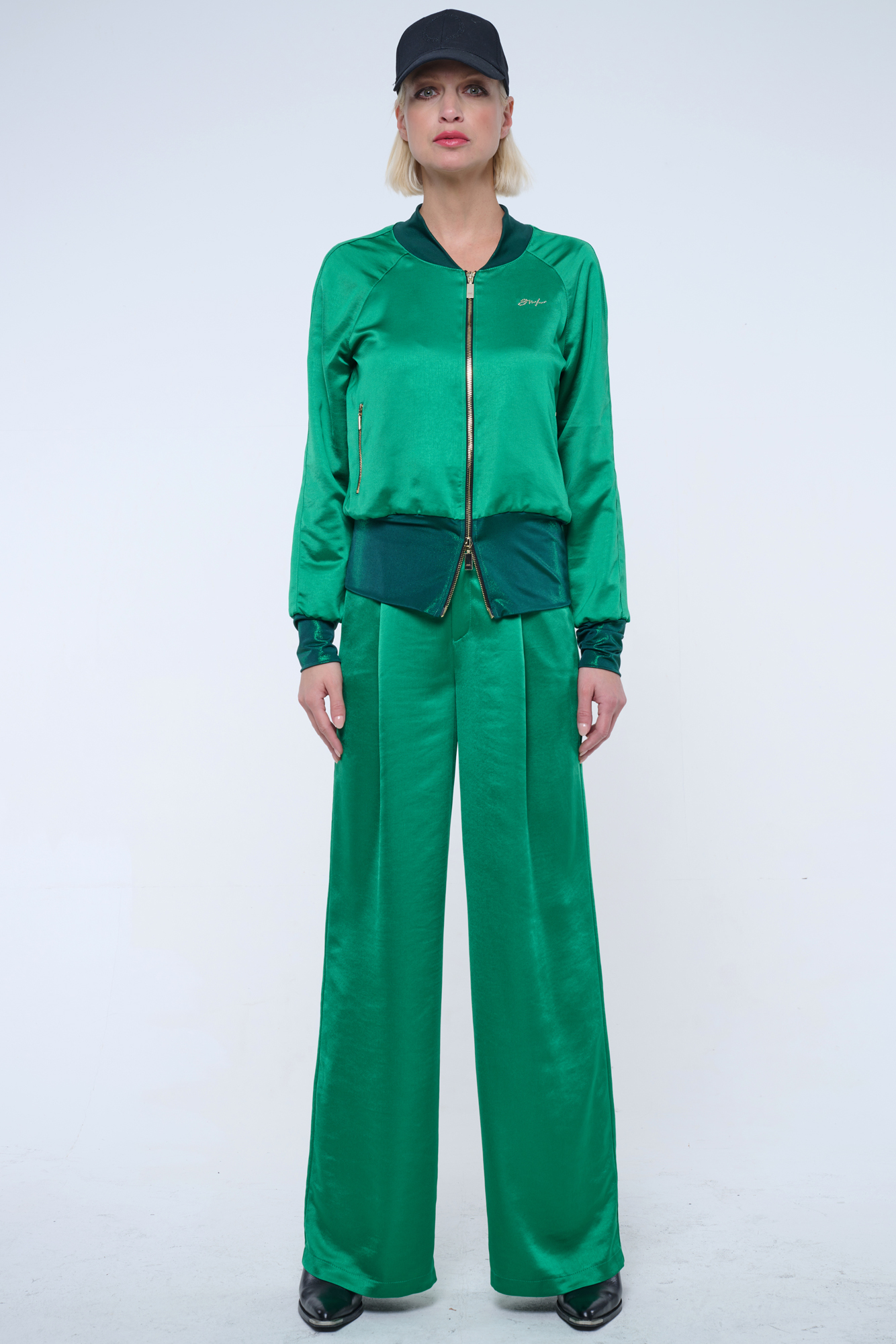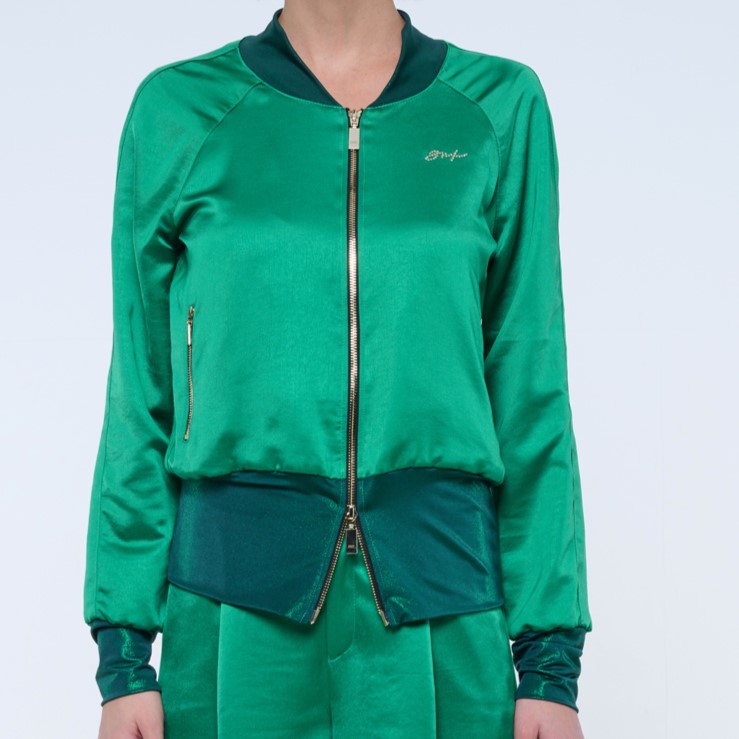 Bundička "bomber" z lesklého materiálu. V pase strečový úplet. Na předním díle zlaté krystalové logo INF.