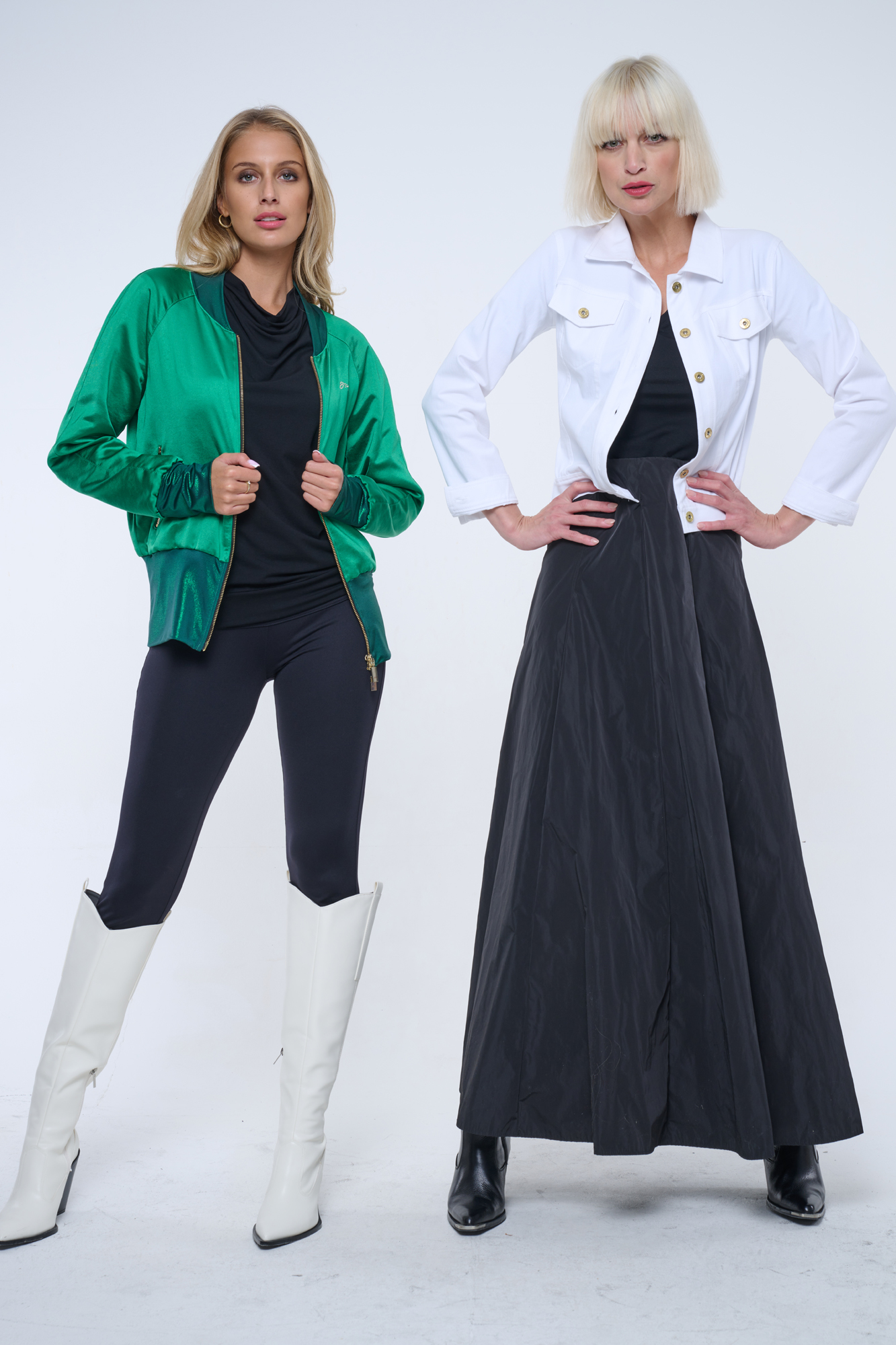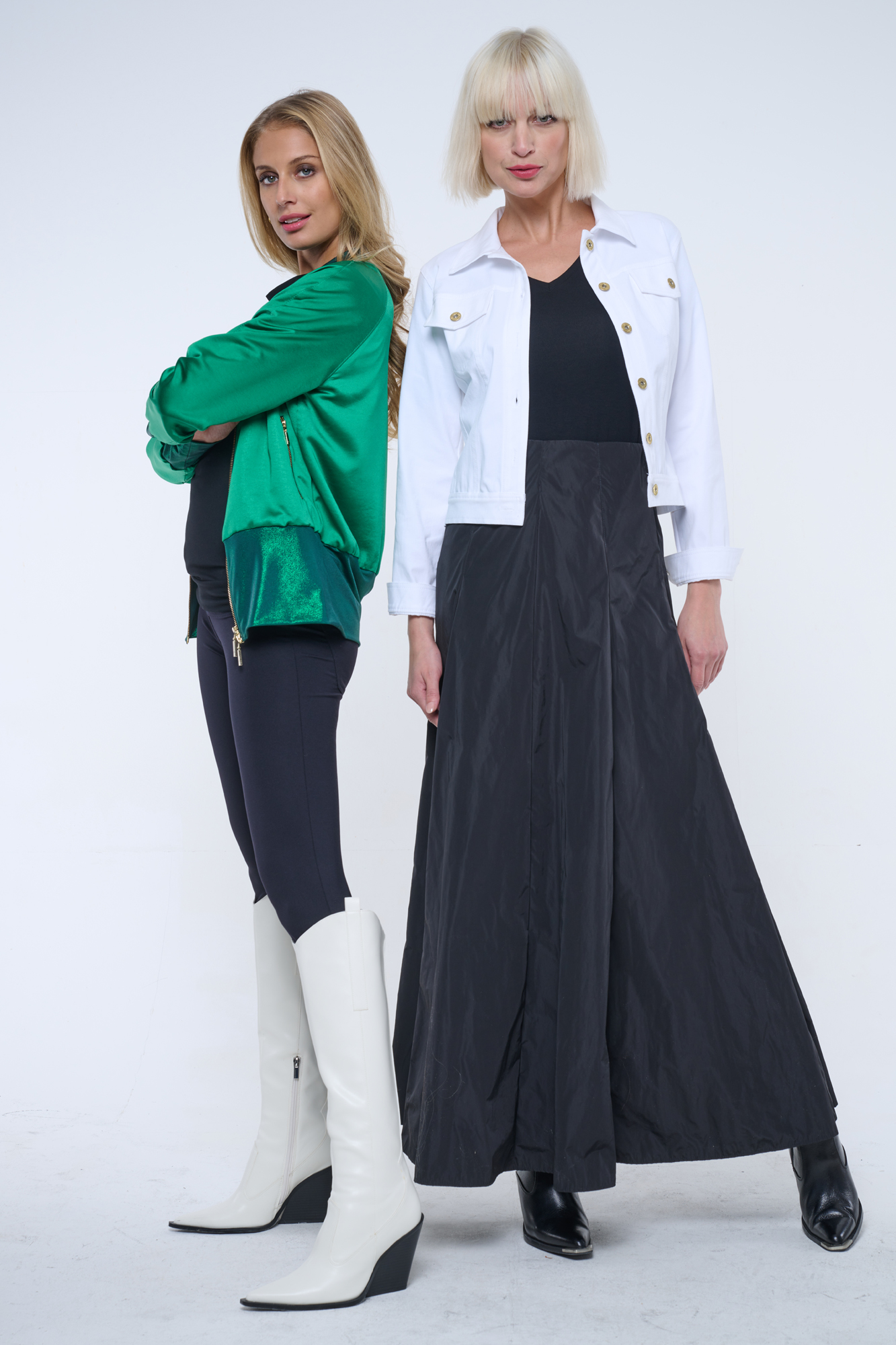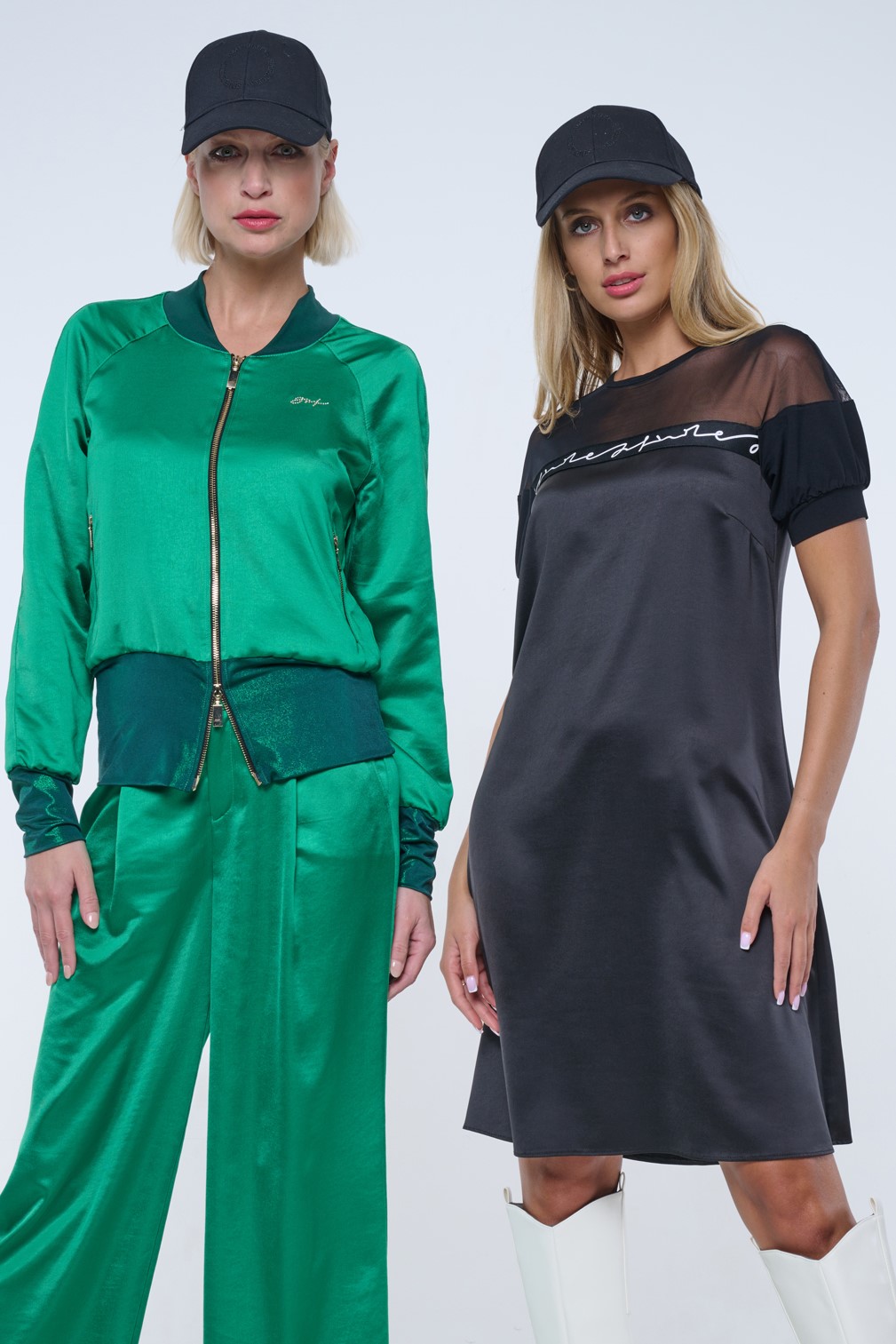 Bundička "bomber" z lesklého materiálu. V pase strečový úplet. Na předním díle zlaté krystalové logo INF.