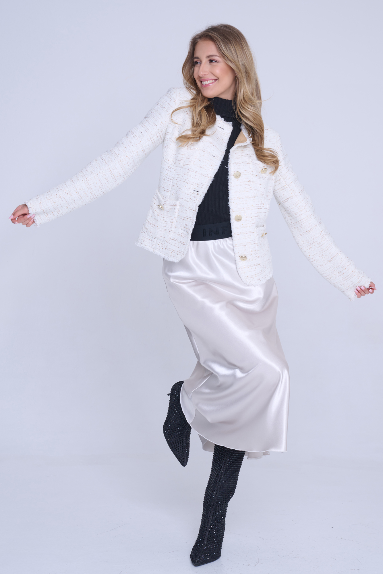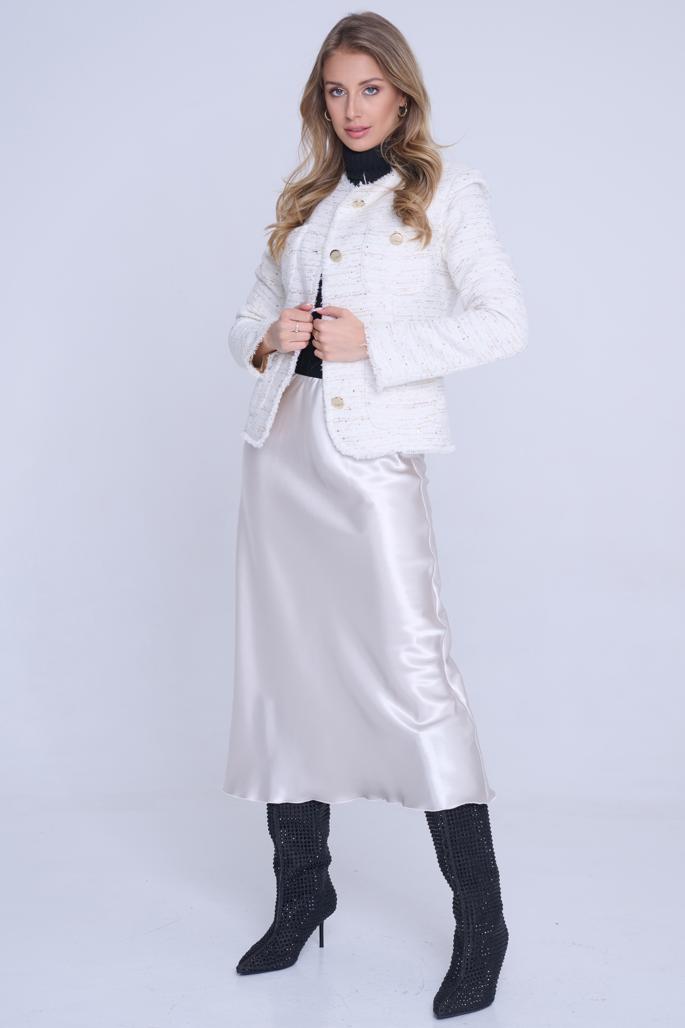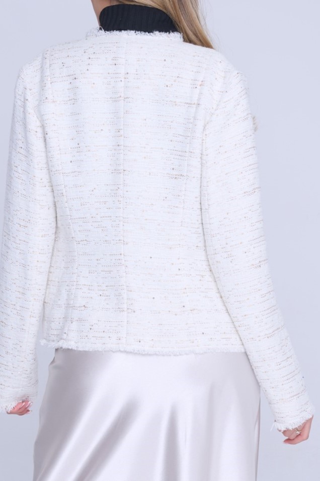 Blejzr Infinite s kapsami. Efektní třepení. Ruční práce. Zlaté knoflíky. Nadčasový model.