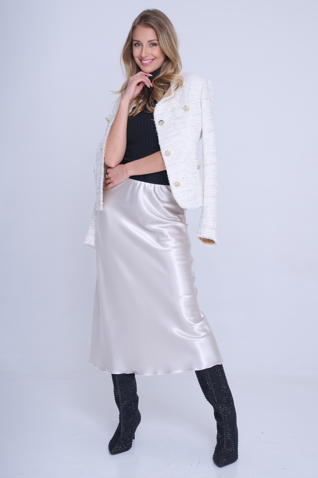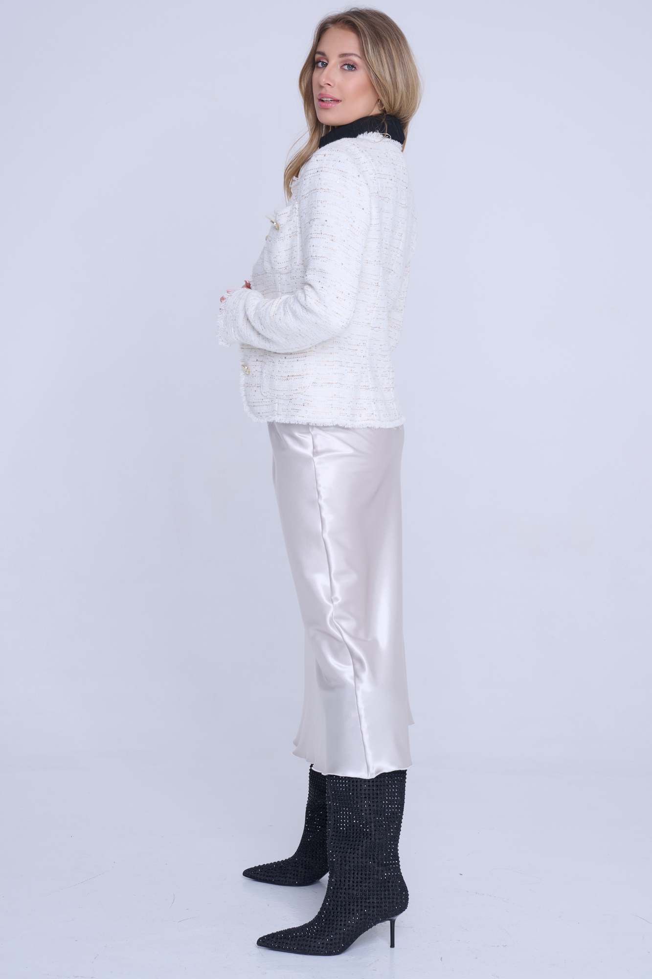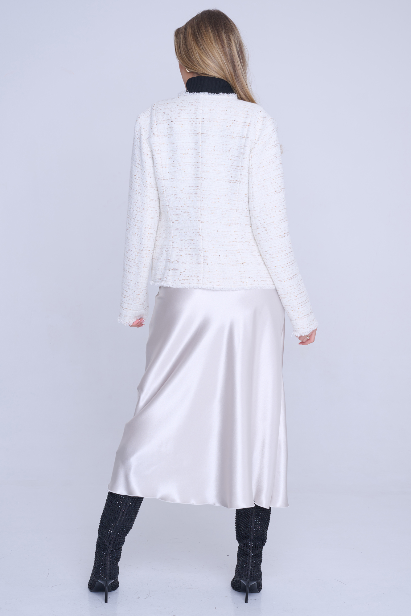 Blejzr Infinite s kapsami. Efektní třepení. Ruční práce. Zlaté knoflíky. Nadčasový model.