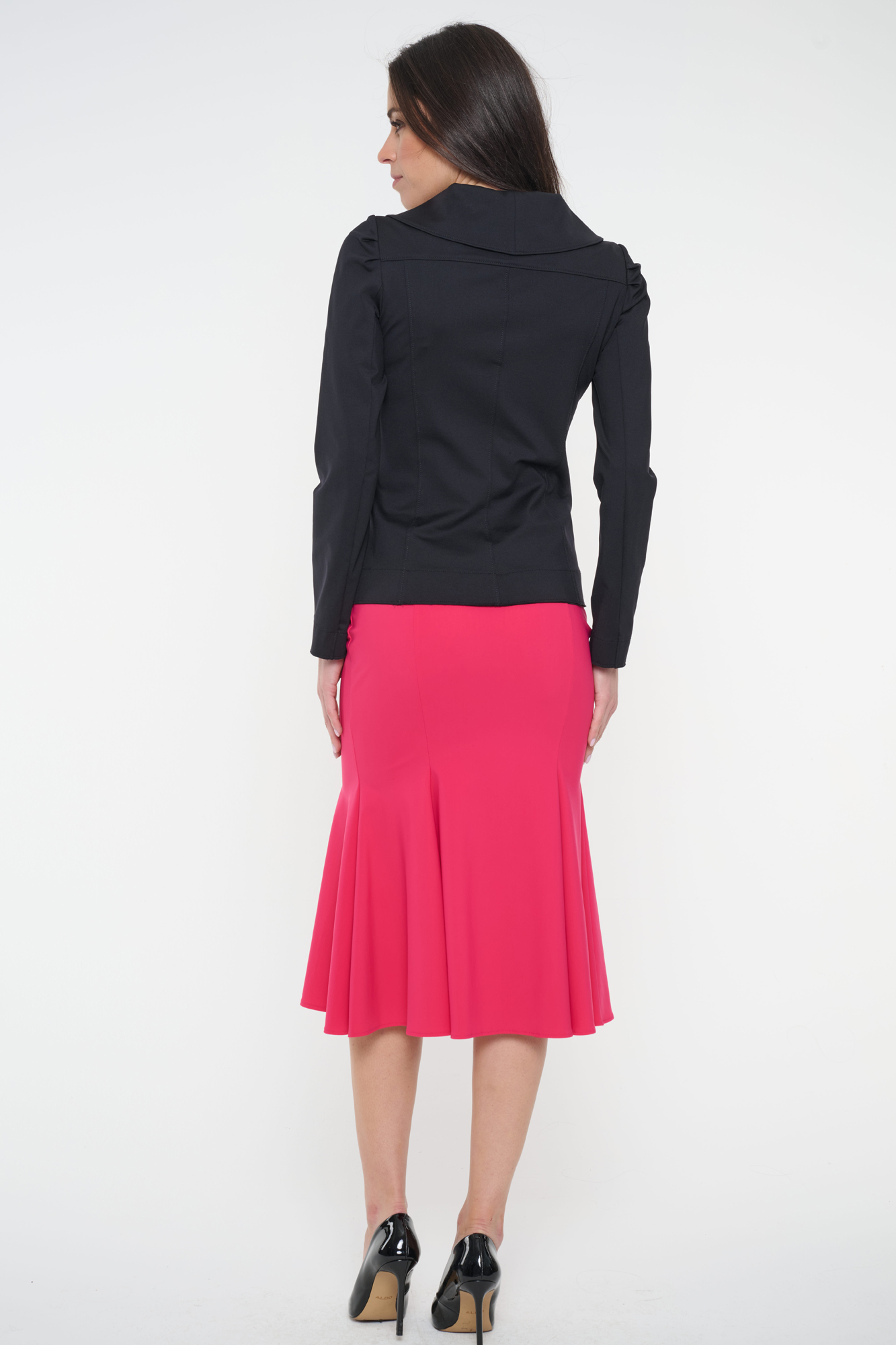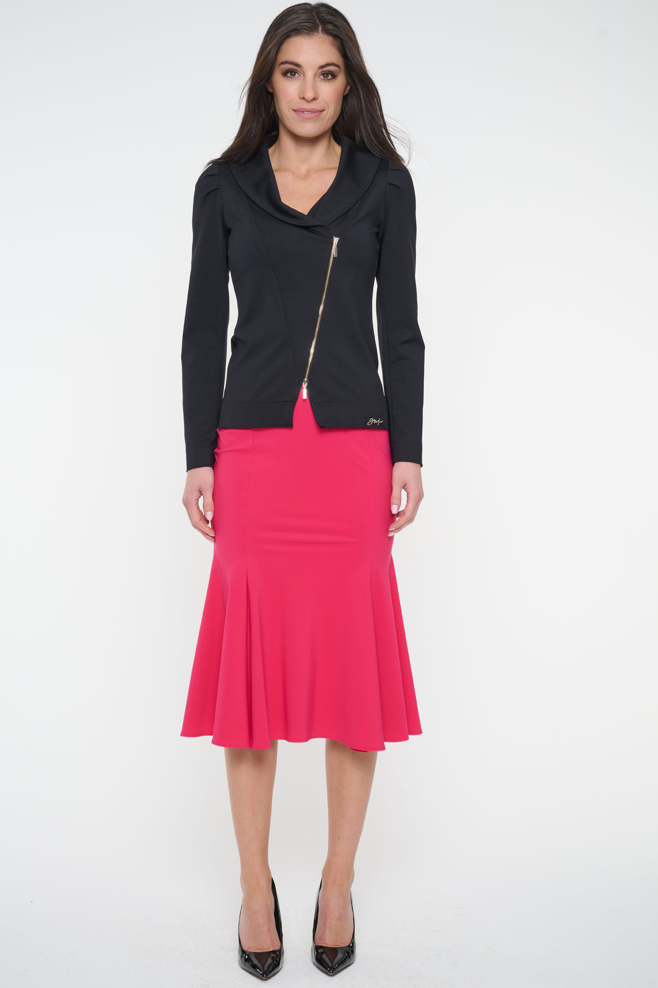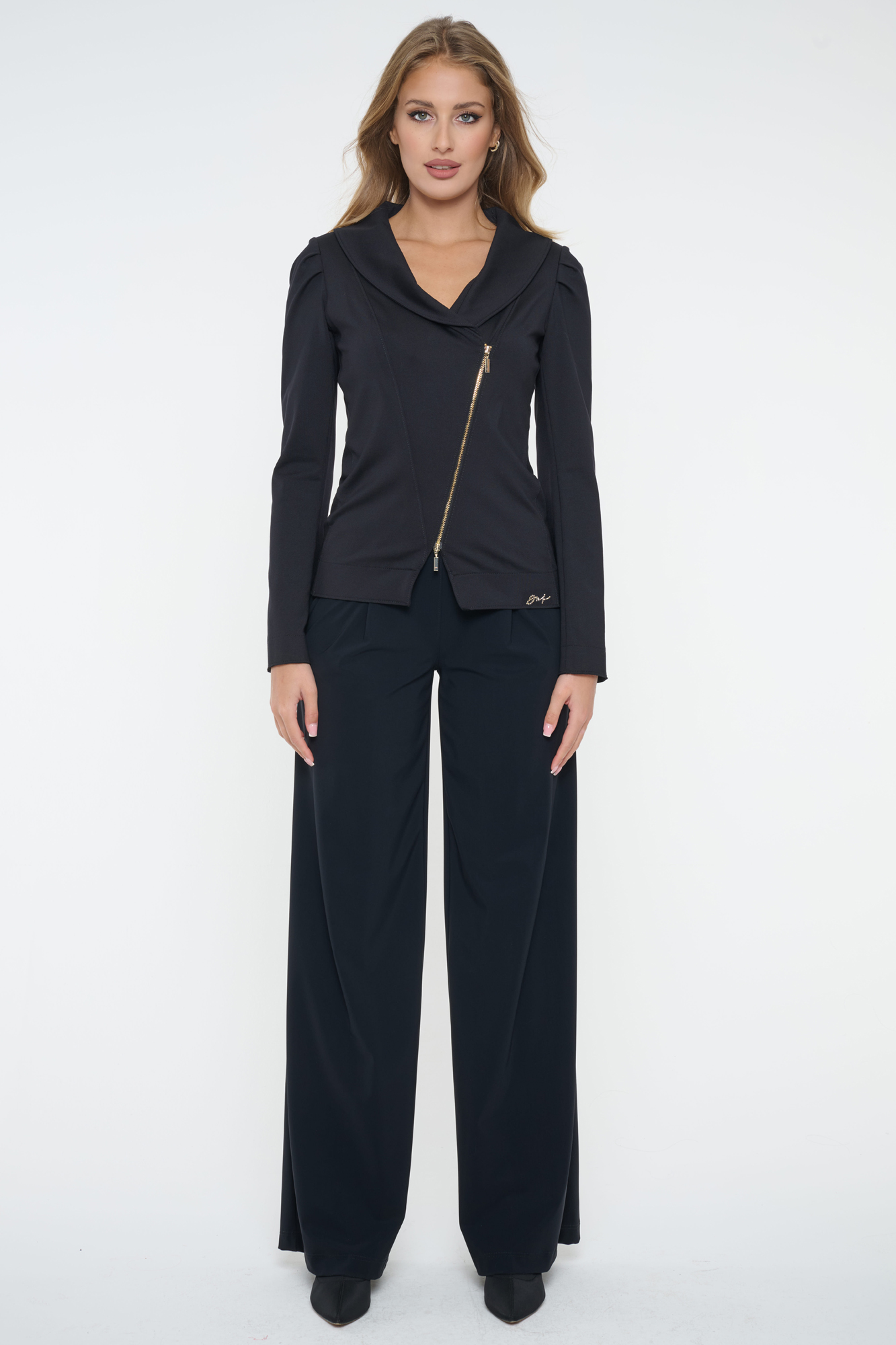 Asymetrický blejzr "křivák". Zlatý zip. Minimallistické logo INF ze zlatých krystalů. Mírně nařasená ramena.