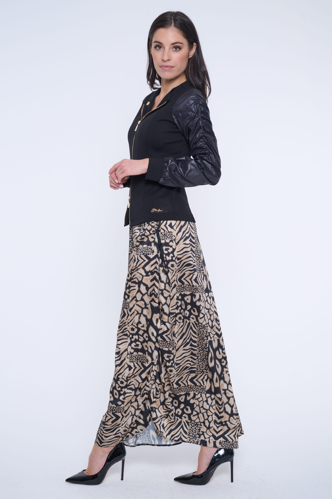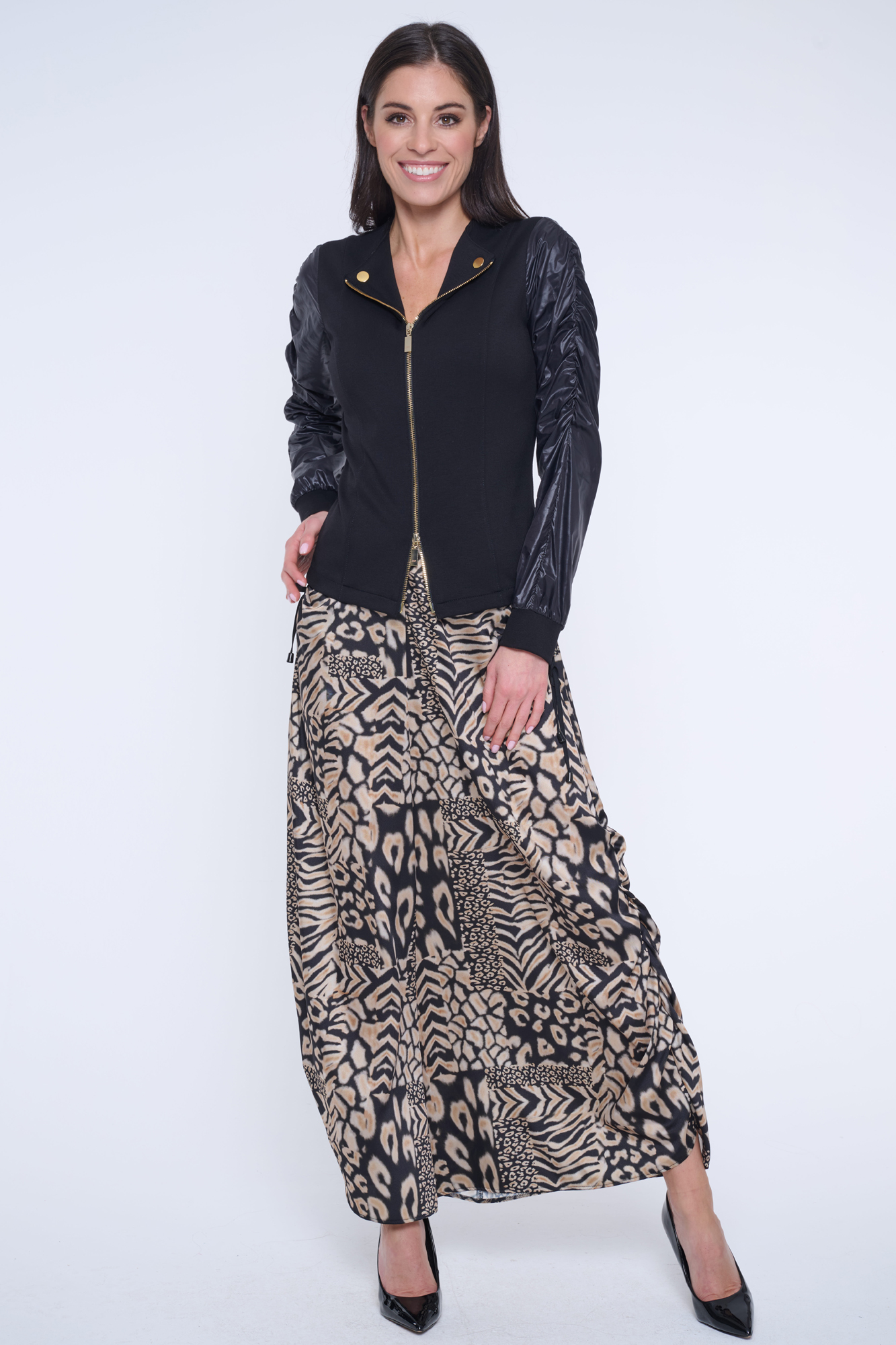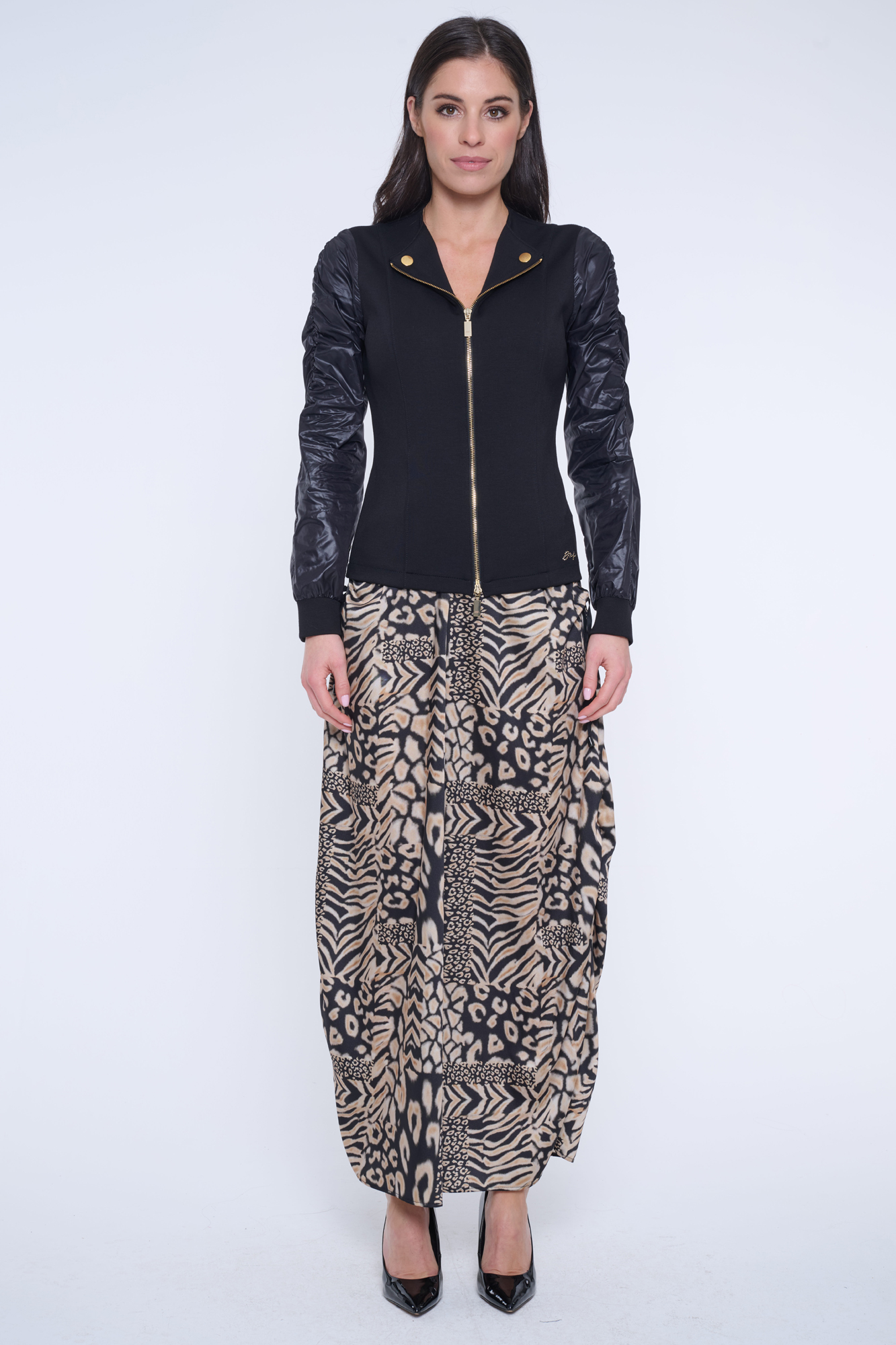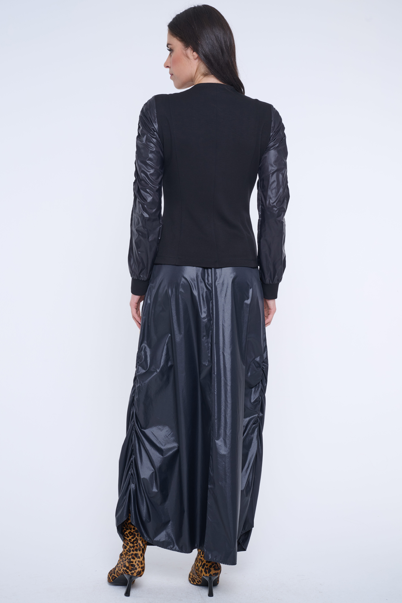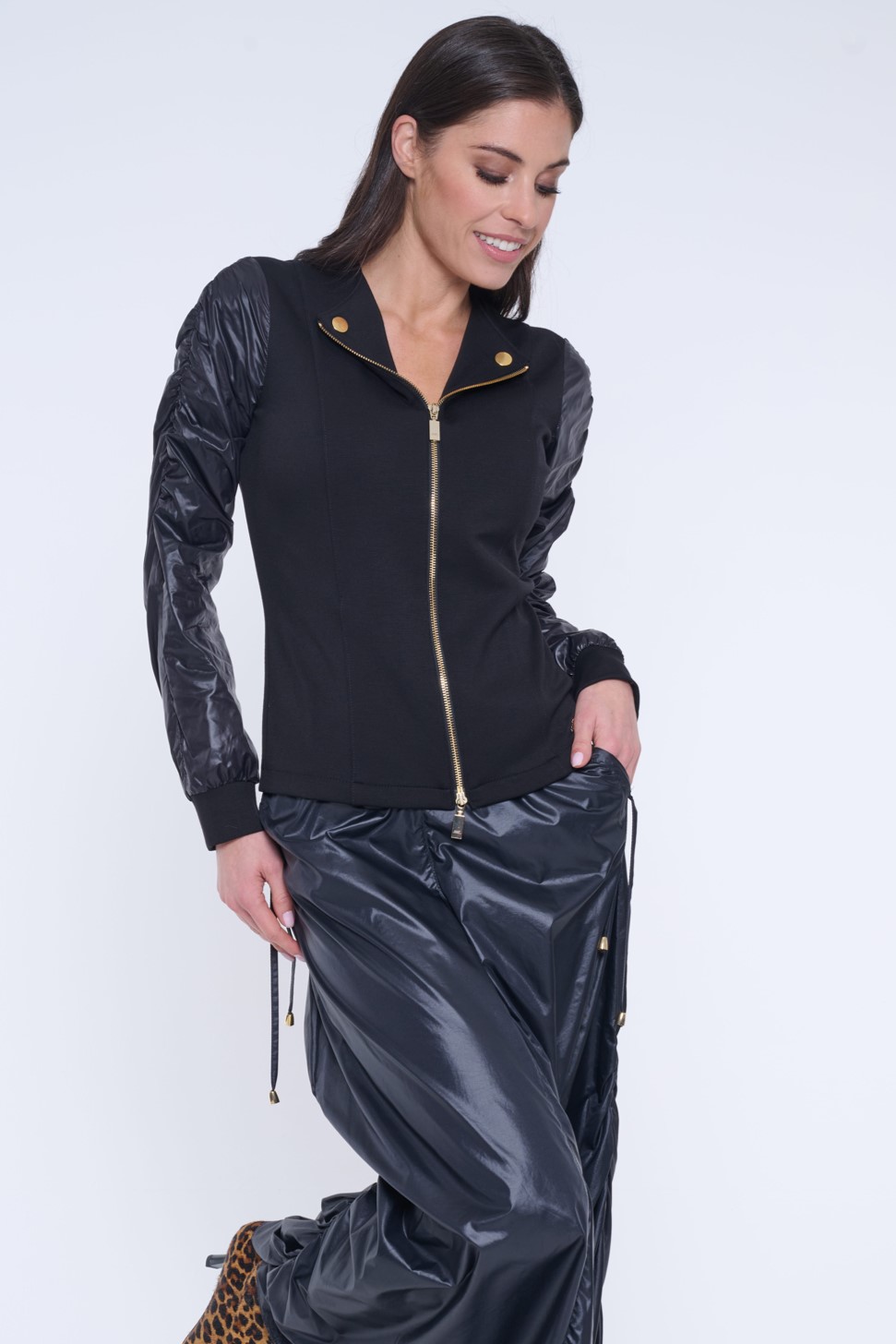 Blejzr z "rib" úpletu. Rukávy ze šusťáku. Mírně nařasené ramena. Zlaté doplňky. V pase minimalistické logo INF ze zlatých krystalů.