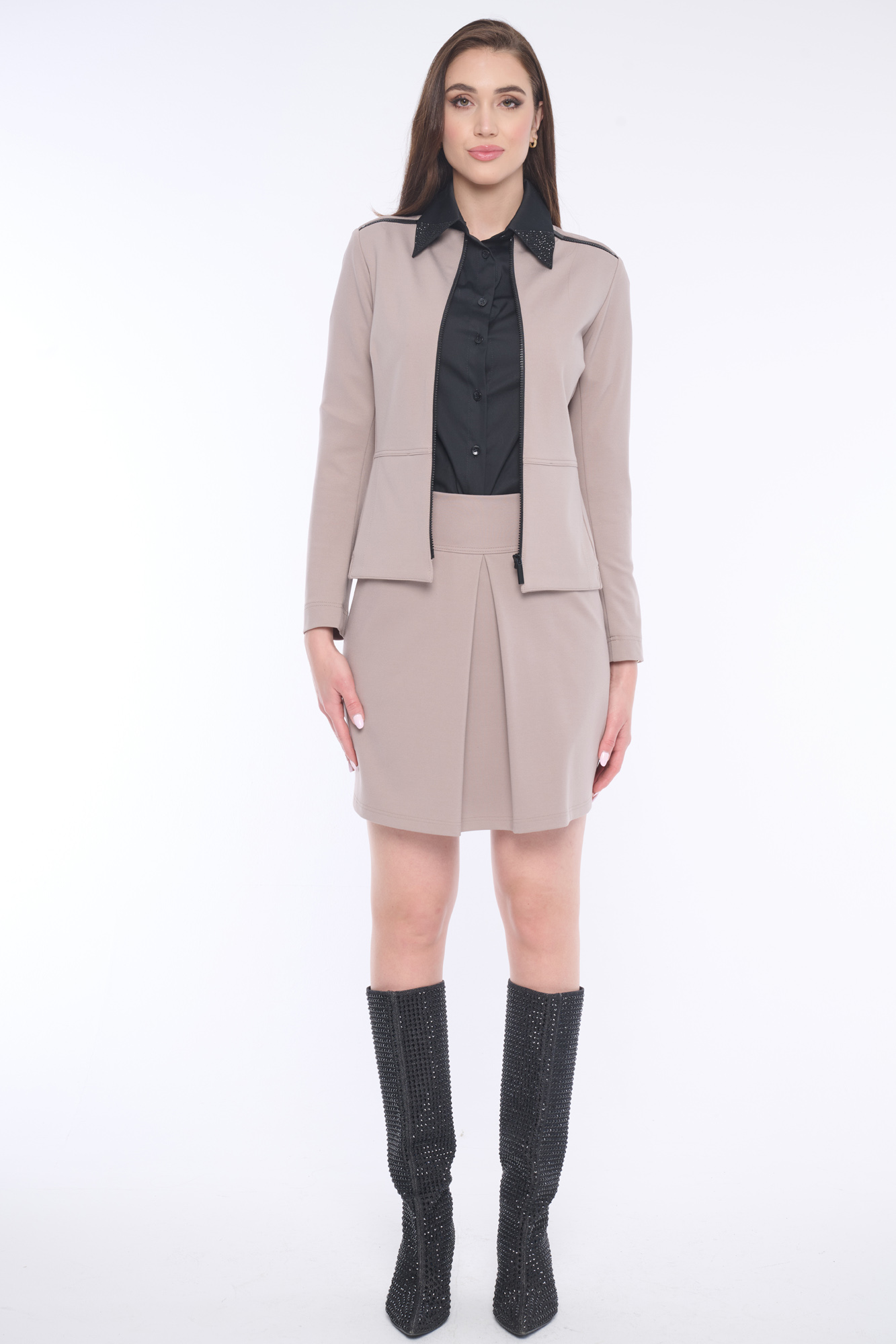 Přilehavá elegantní bundička se schovanými kapsami z boku a zajímavými zipovými detaily, která krásně tvaruje postavu. Jemný detail tvoří krystaly Swarowski. Dostupná ve dvou barevných variantách.