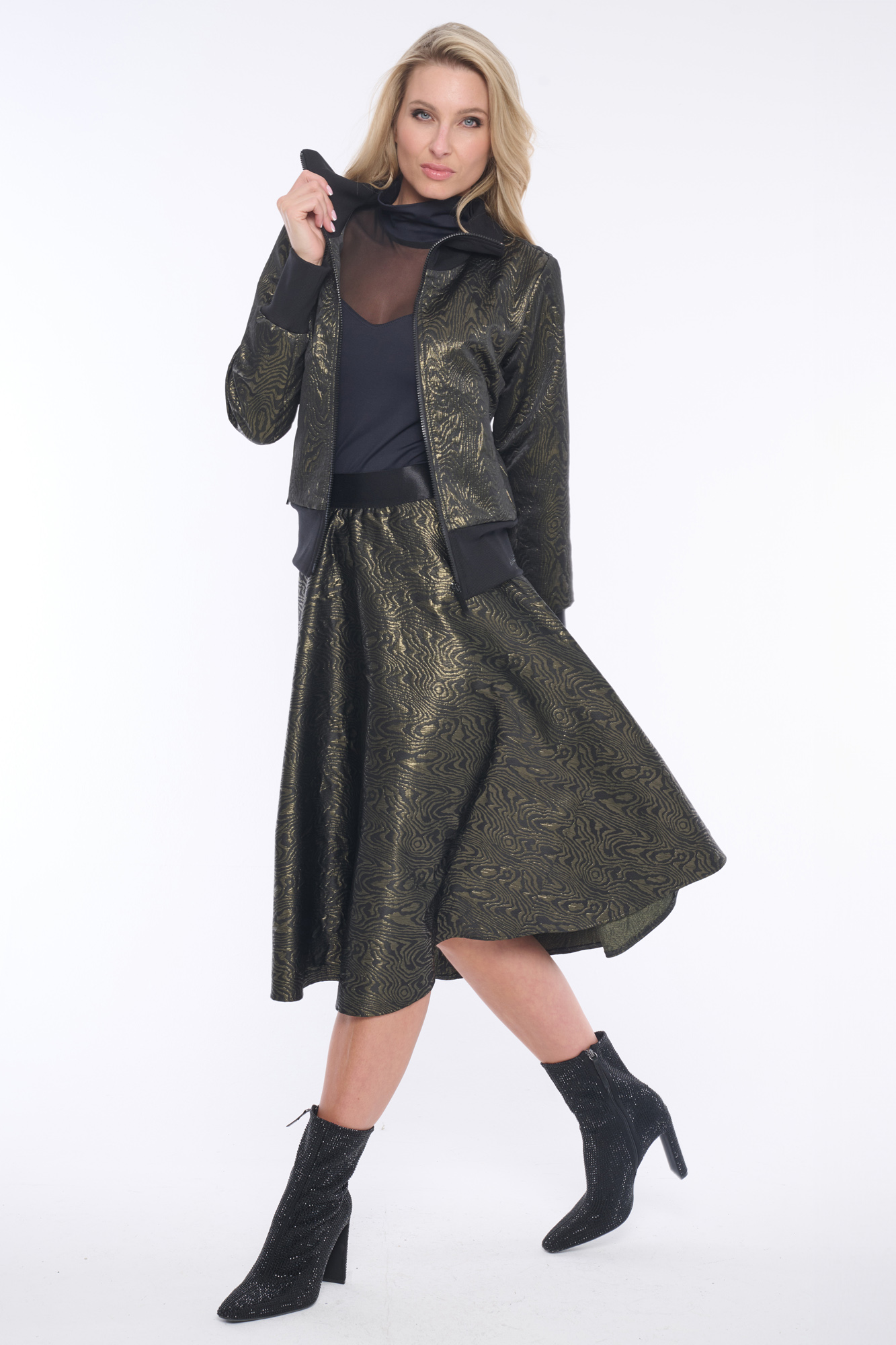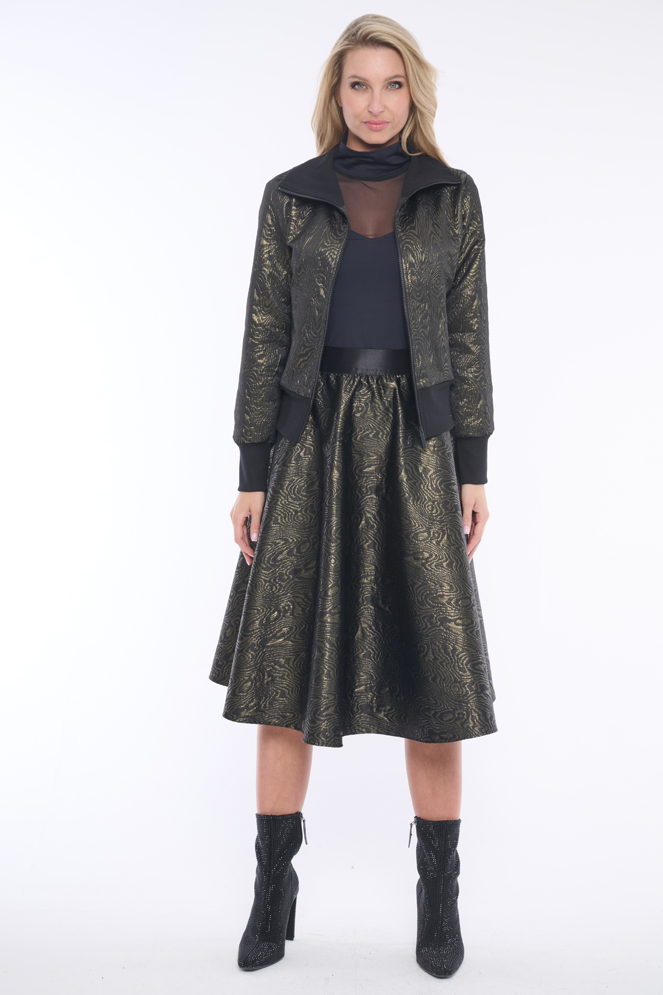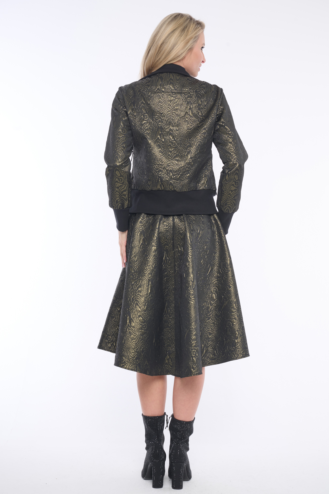 Luxusní bomber s metalovými odlesky, ve kterém budete vynikat. Spodní široký žebrovaný lem krásně kopíruje a tvaruje postavu. Jemný detail tvoří krystaly Preciosa. Ideální do kompletu se sukní ze stejné kolekce.