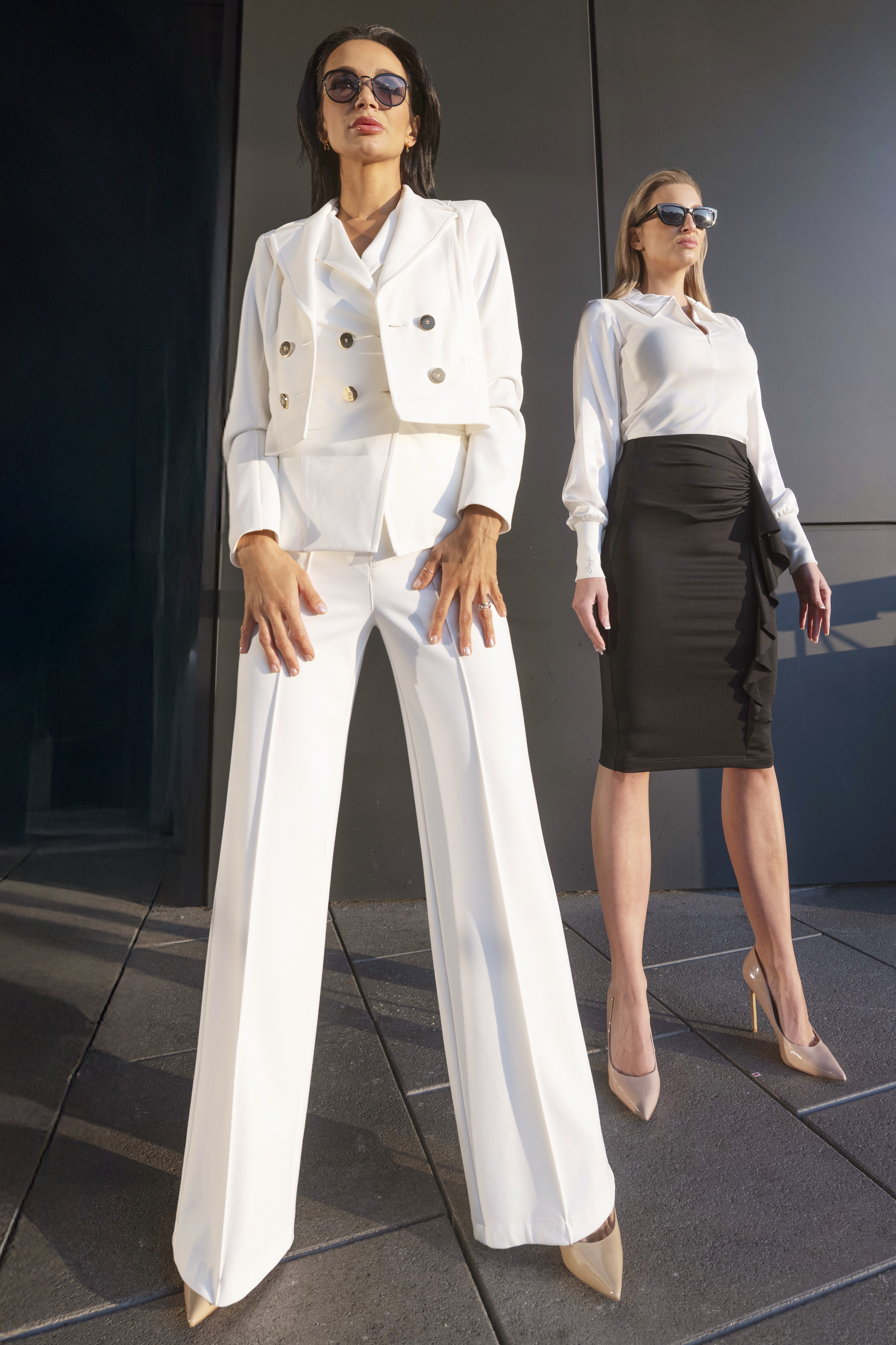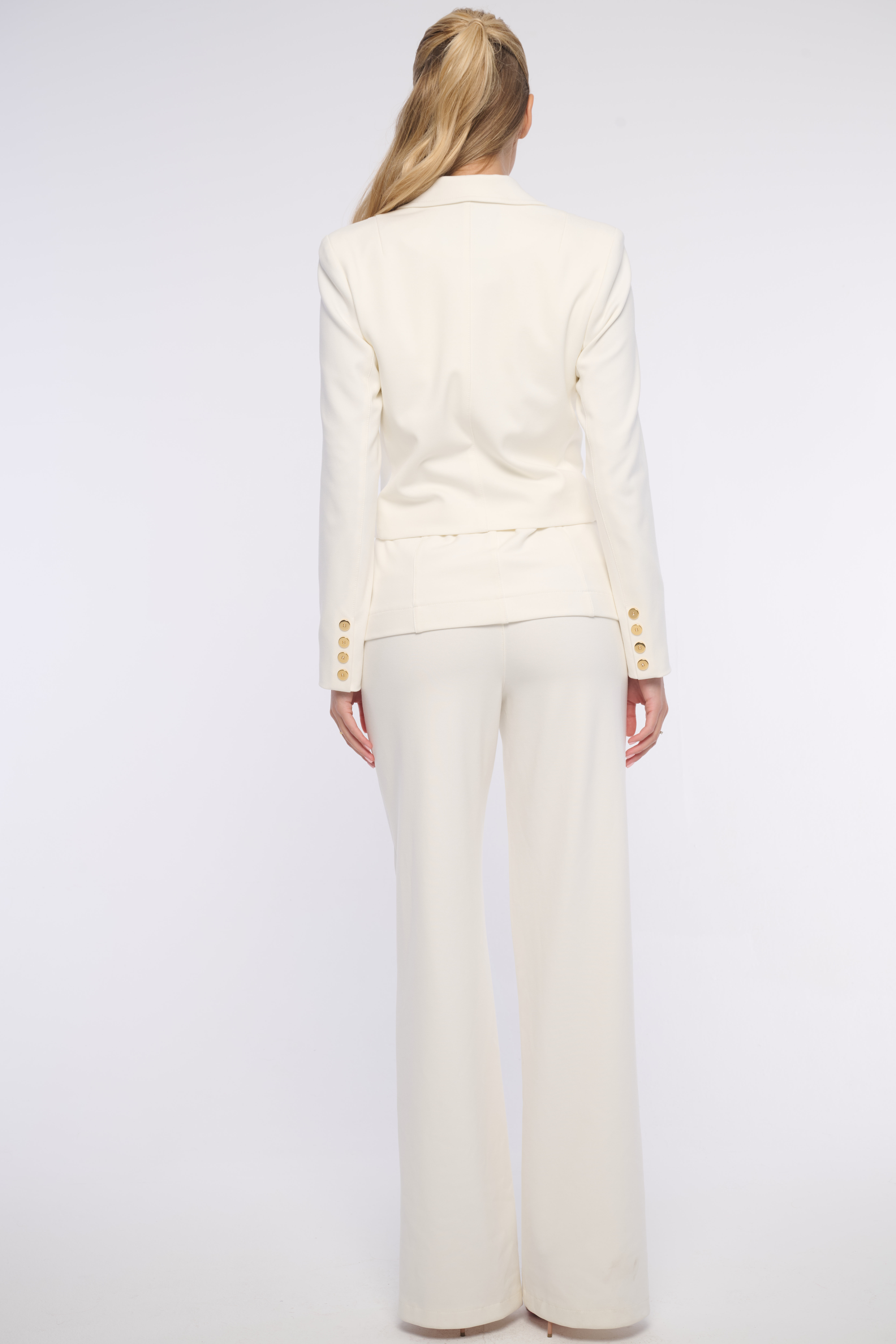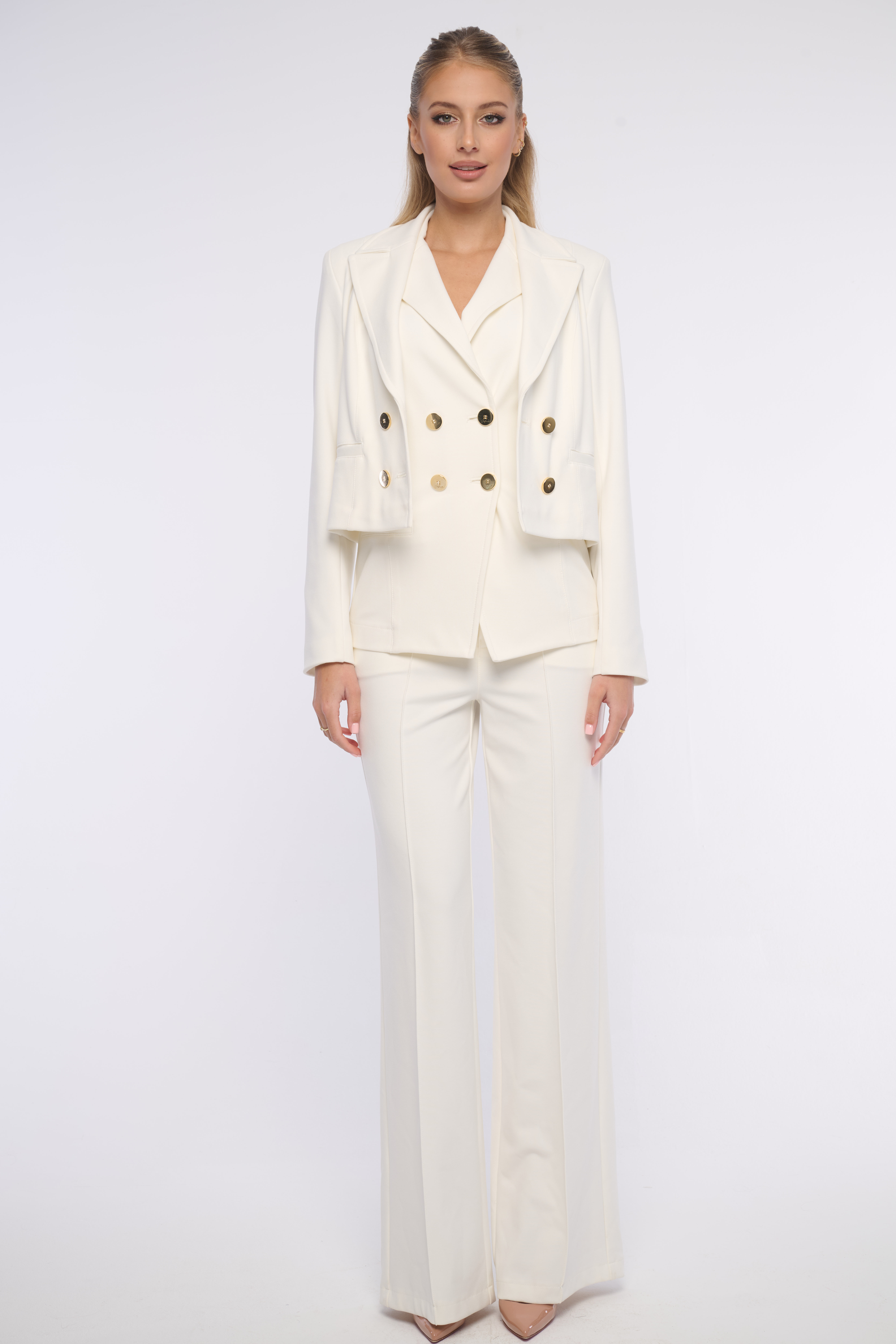 Moderní zkrácené sako s výraznými zlatými knoflíky. Krásně se kombinuje s elegantními kalhoty ze stejné kolekce. Sako je dostupné ve dvou barevných variantách.