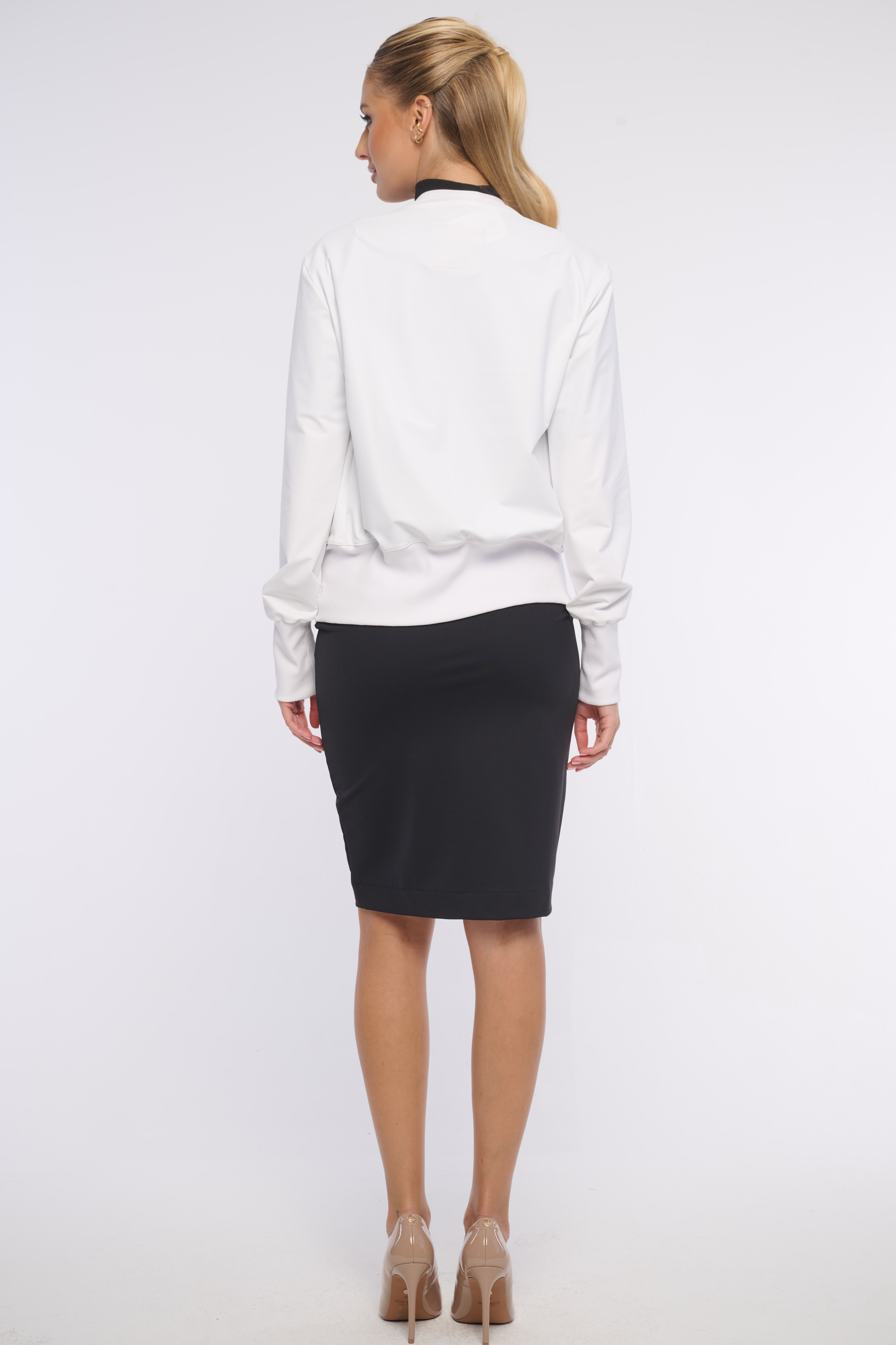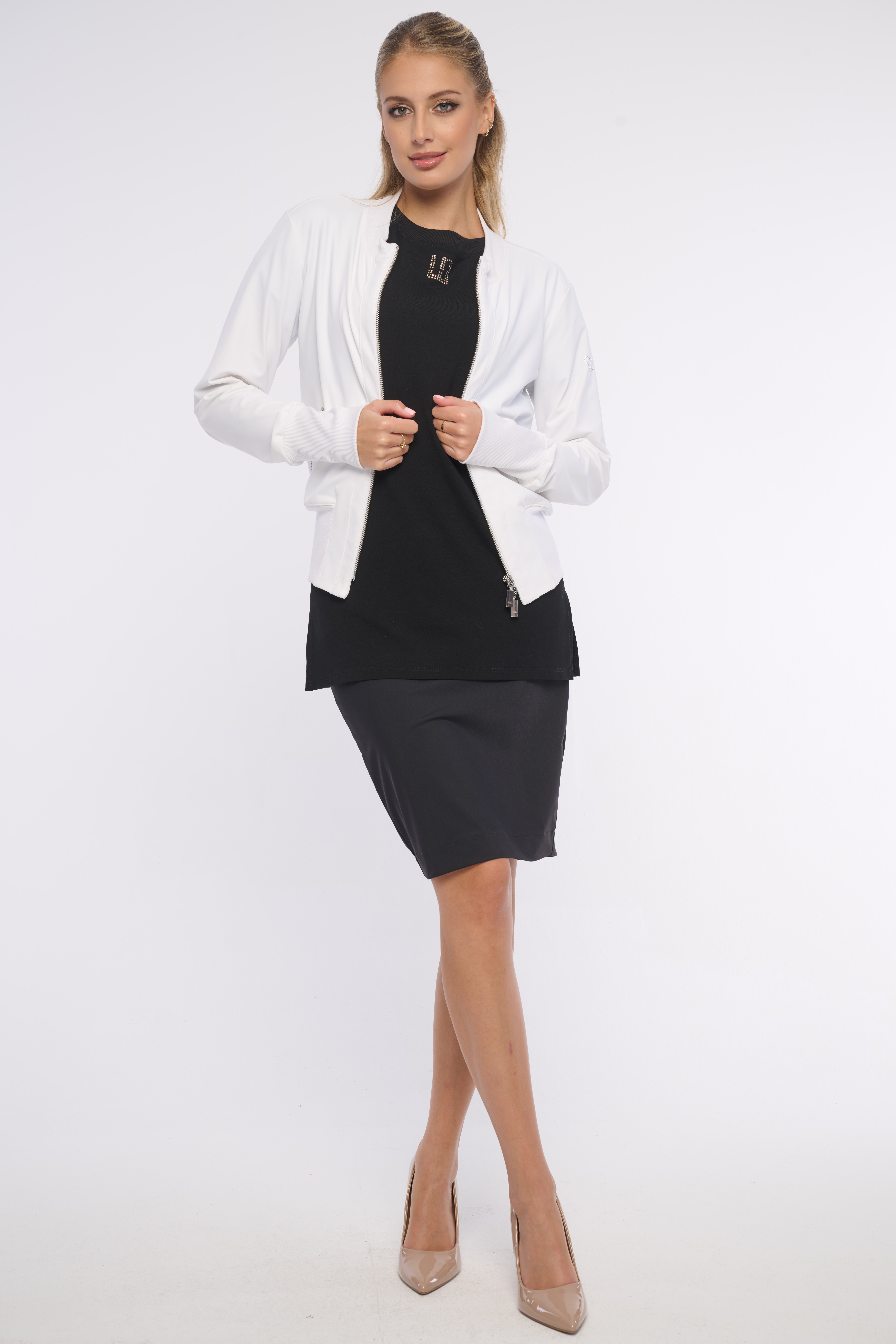 Elegantní lehký bomber, který se hodí na triko i šaty, skvěle se vrství. Detail na rameni tvoří logo z luxusních krystalů Preciosa. Dostupný ve dvou barevných variantách.