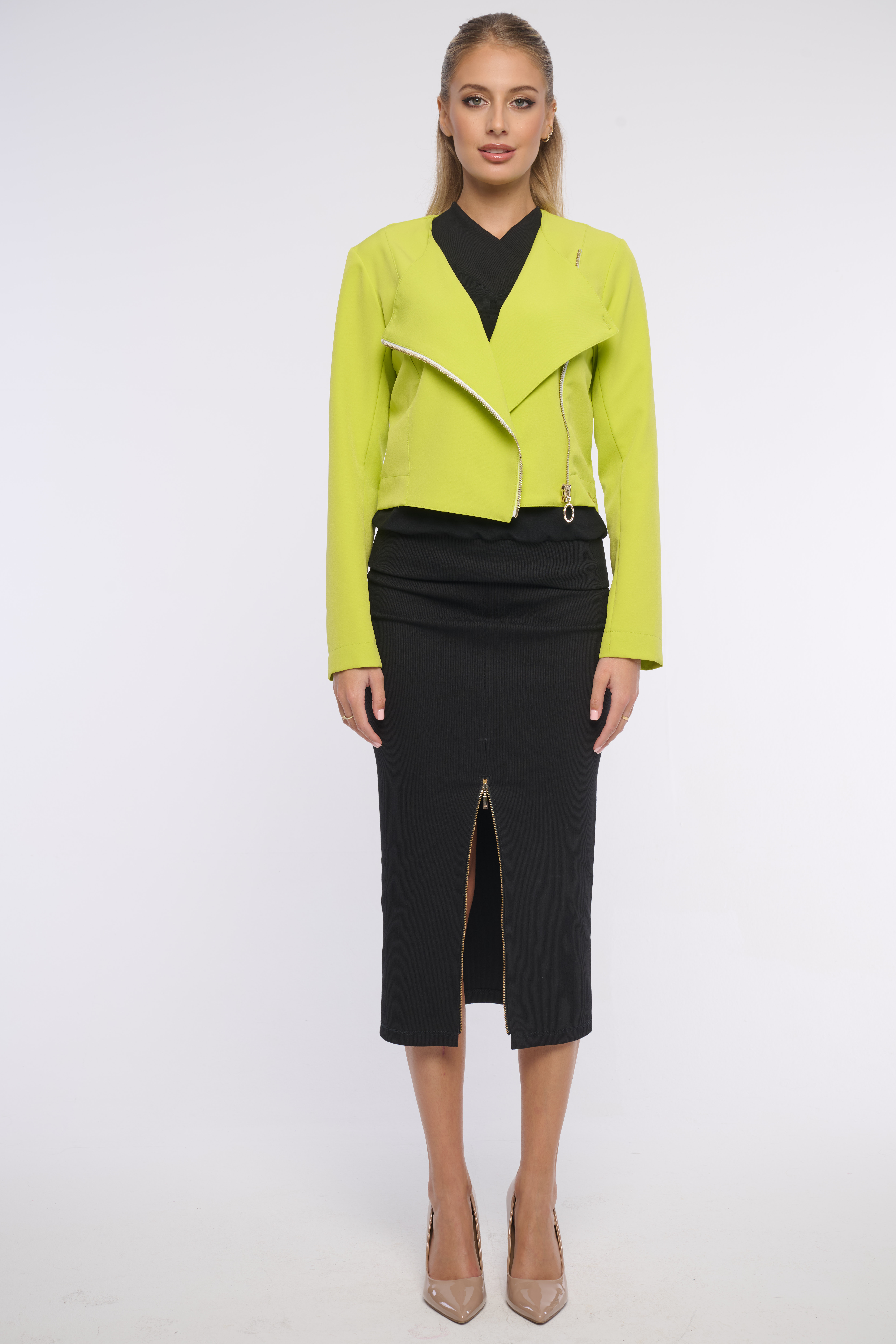 Elegantní bundička s výrazným zipem do boku. Detailem je logo z luxusních krystalů Swarovski. Dostupná ve dvou výrazných barvách, které rozzáří jakýkoliv outfit.