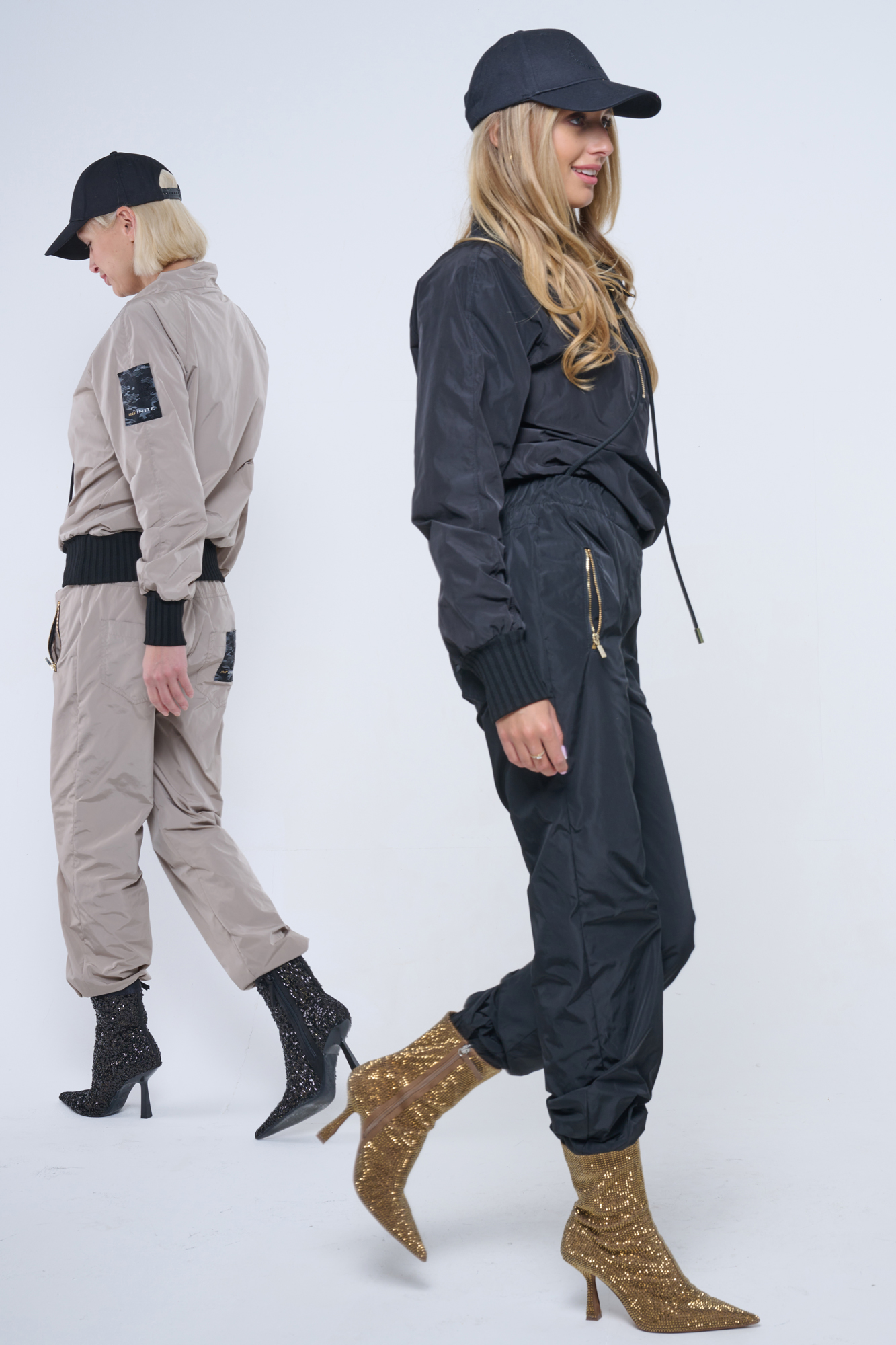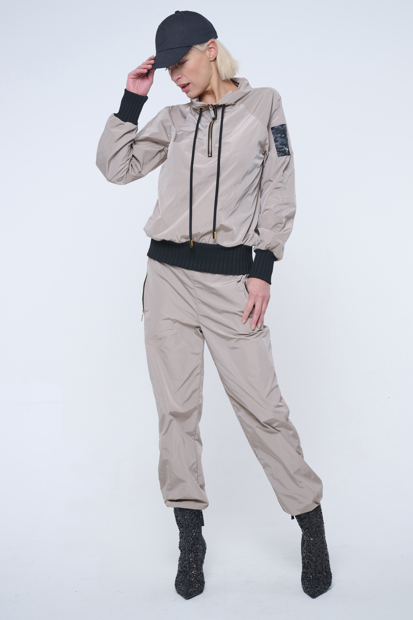 Luxusní bundička z šusťáku. Náplety s žebrovaného úpletu. Na rukávu efektní nášivka. Zlaté doplňky.