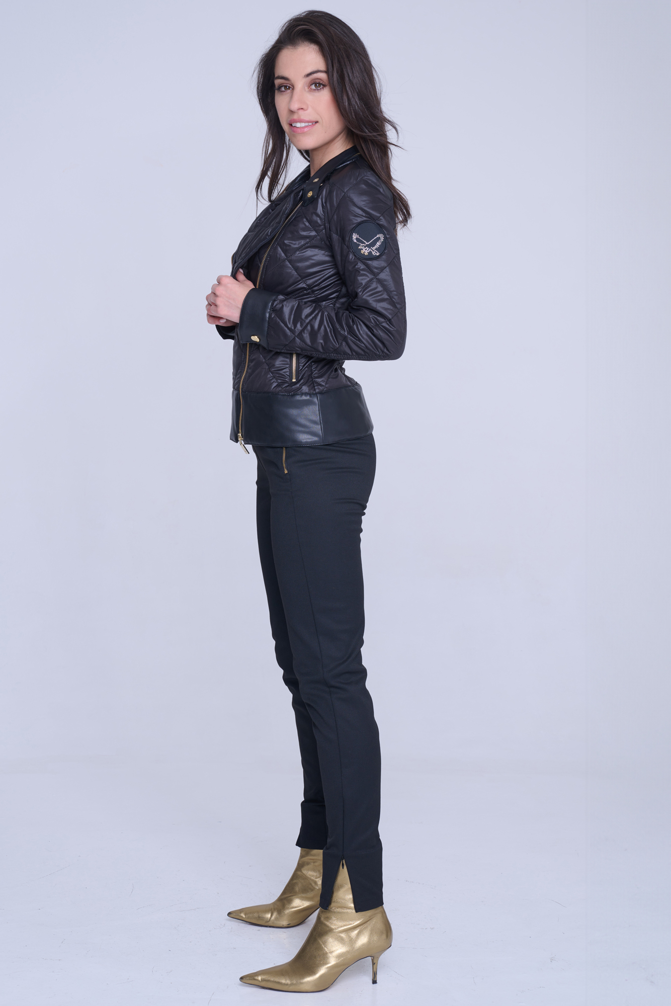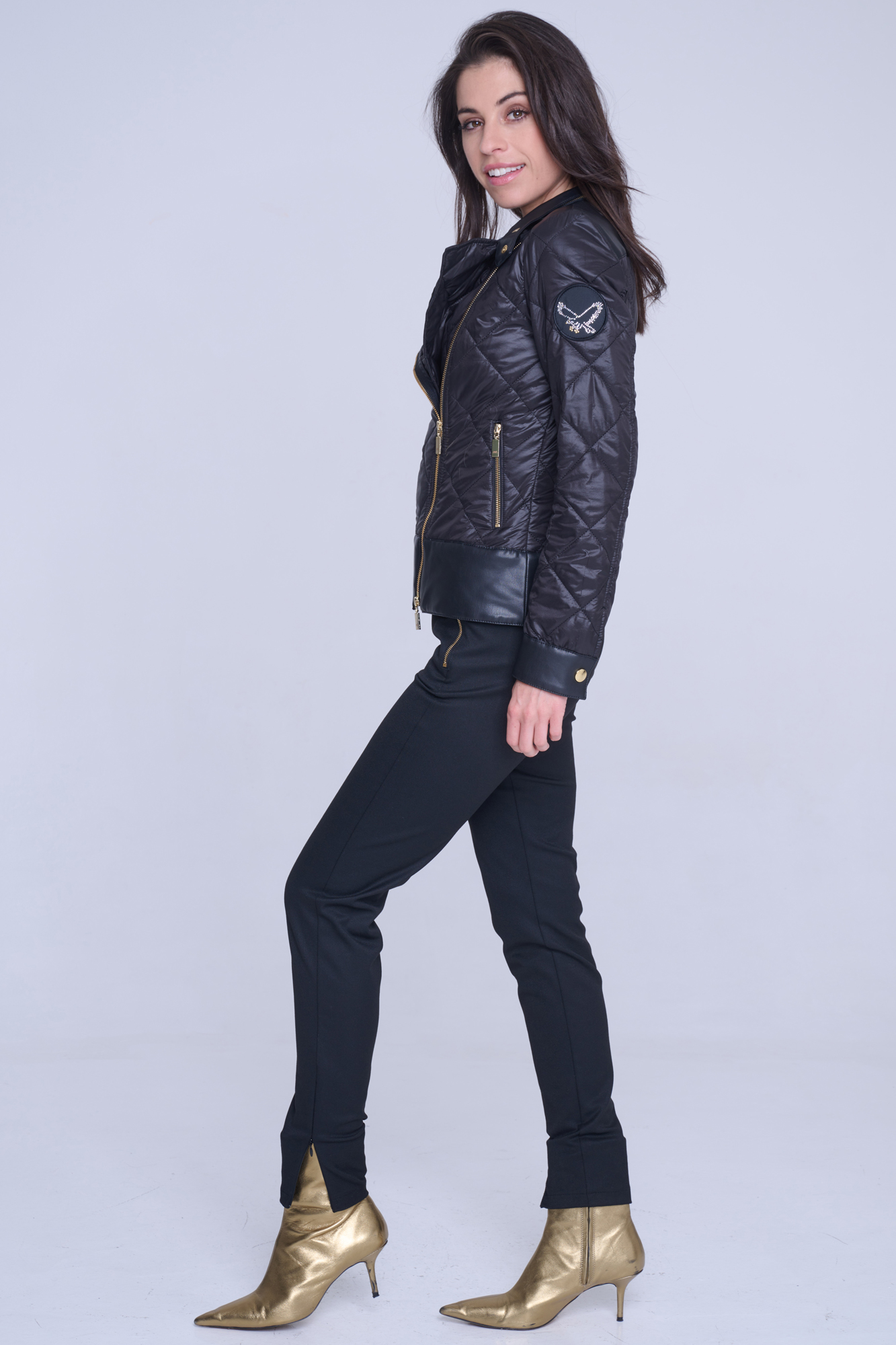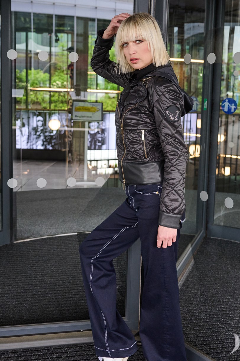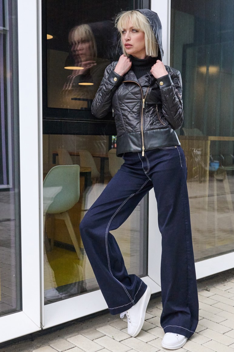 Šusťákový křivák Infinite s odpínatelnou kapucí. V kombinaci s ekokůží. Zlaté doplňky.
