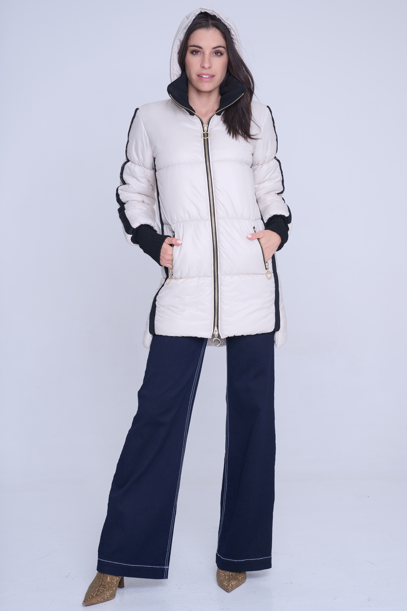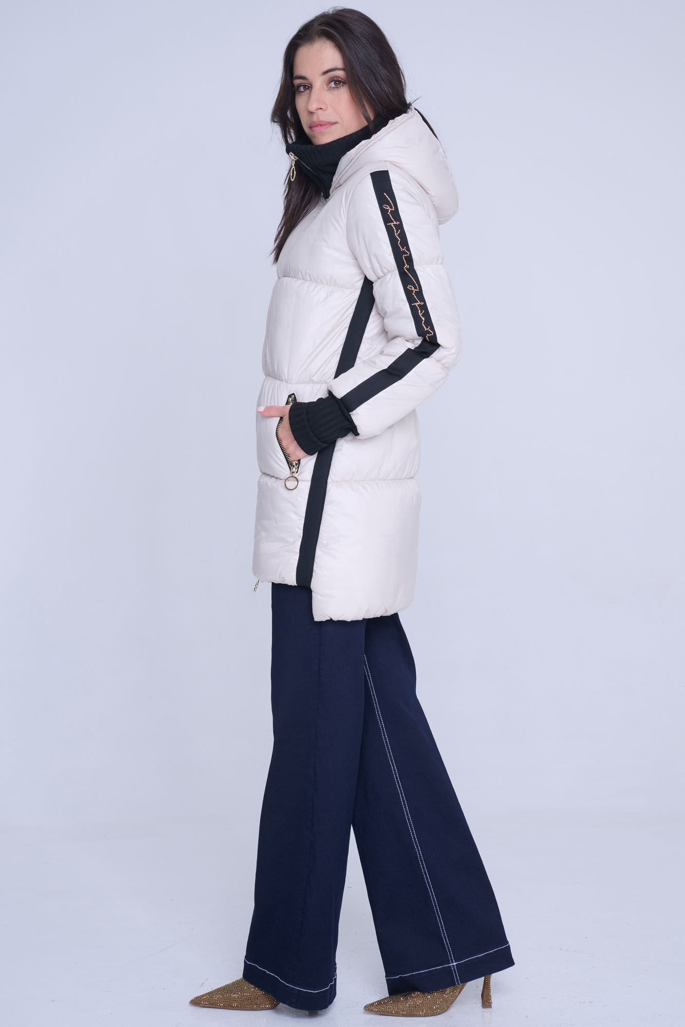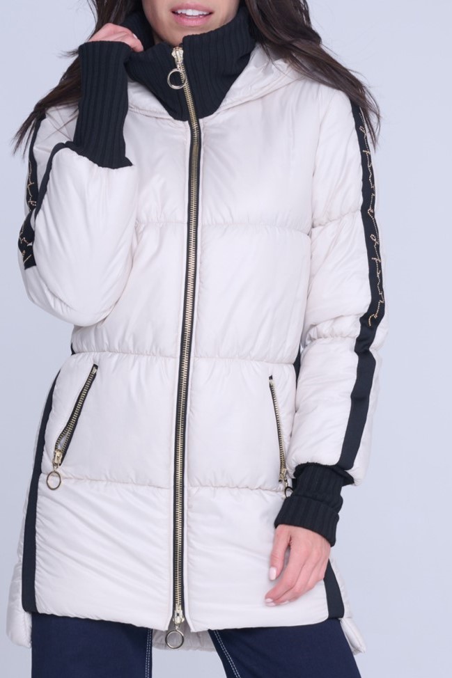 Luxusní zimní bunda v délce pod zadeček. Na rukávech efektní lampas s motivem Infinite ze zlatých krystalů Preciosa. Zlaté doplňky. Žebrové náplety ve výstřihu a v délce rukávů. Uvnitř bundy hřejivé, měkké rouno. Příjemné na nošení. Tuto bundu si obléknete a nebudete chtít sundat.