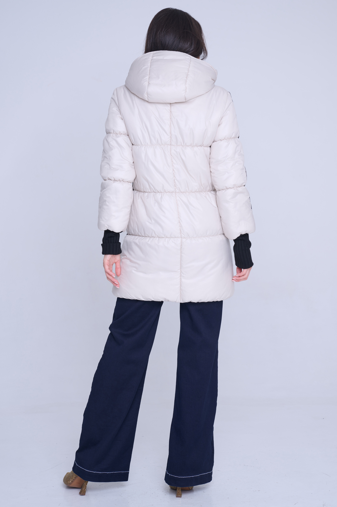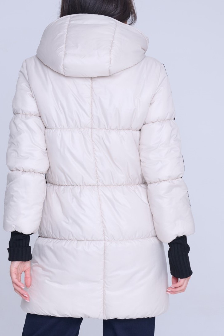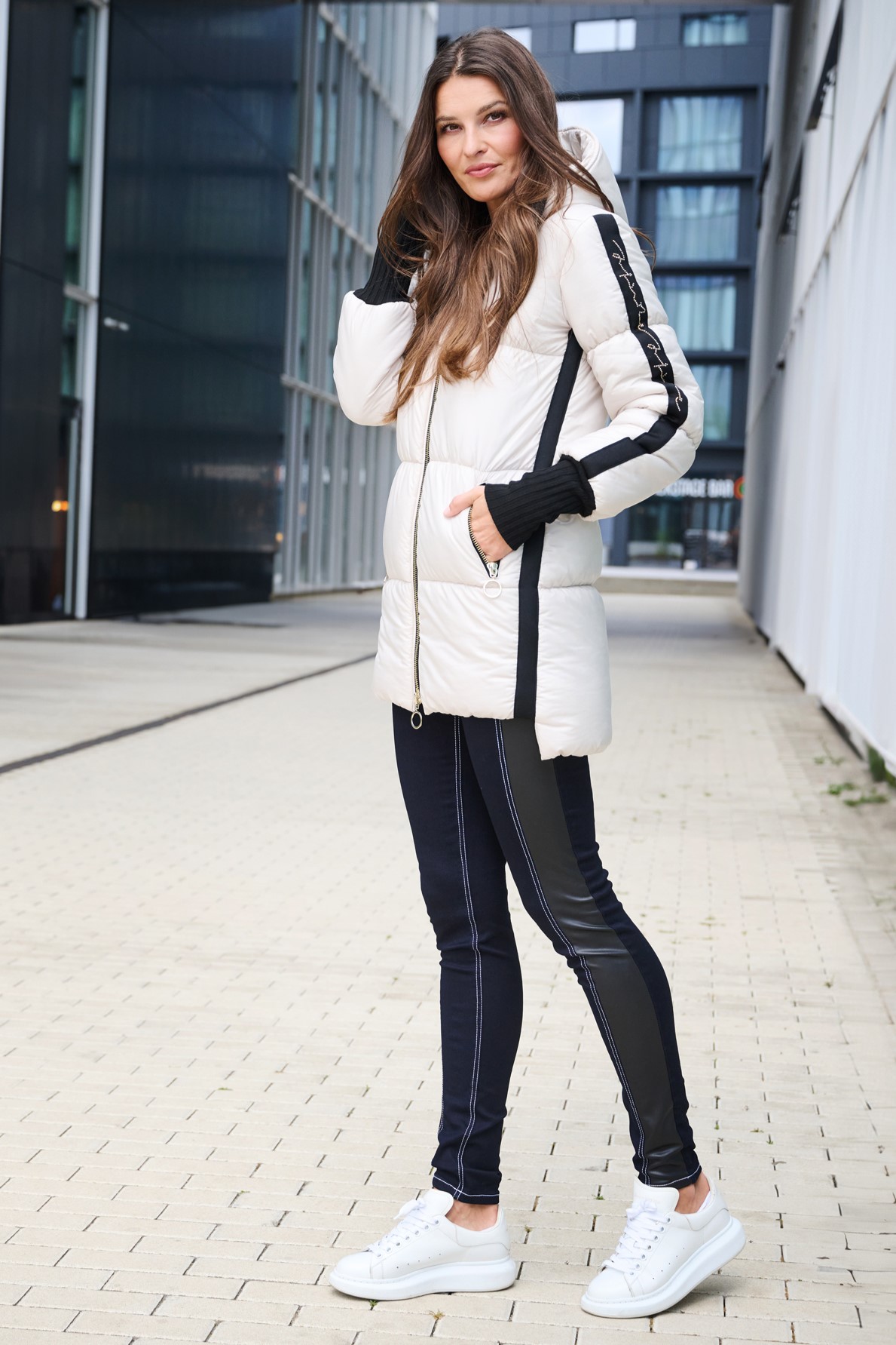 Luxusní zimní bunda v délce pod zadeček. Na rukávech efektní lampas s motivem Infinite ze zlatých krystalů Preciosa. Zlaté doplňky. Žebrové náplety ve výstřihu a v délce rukávů. Uvnitř bundy hřejivé, měkké rouno. Příjemné na nošení. Tuto bundu si obléknete a nebudete chtít sundat.