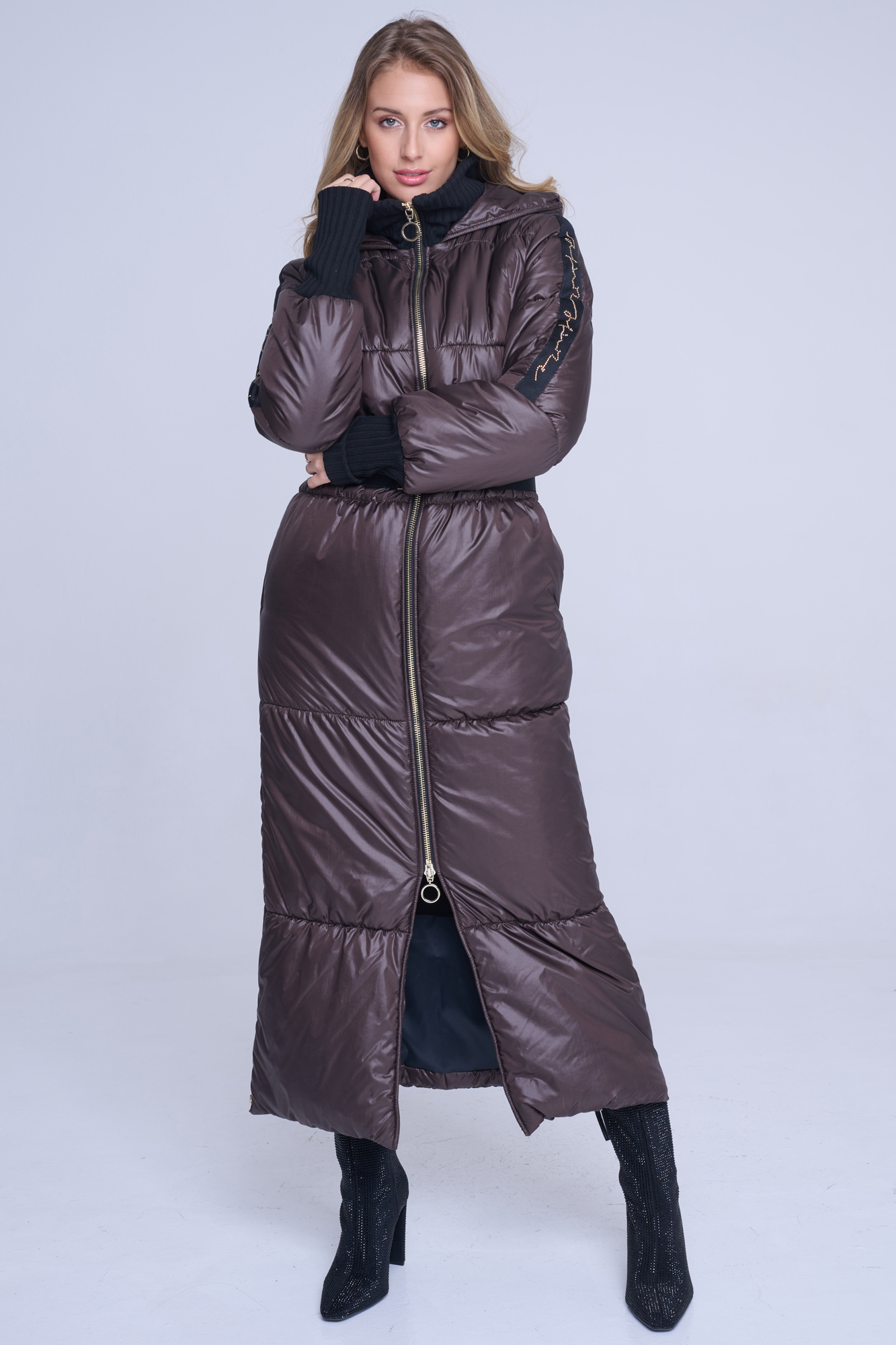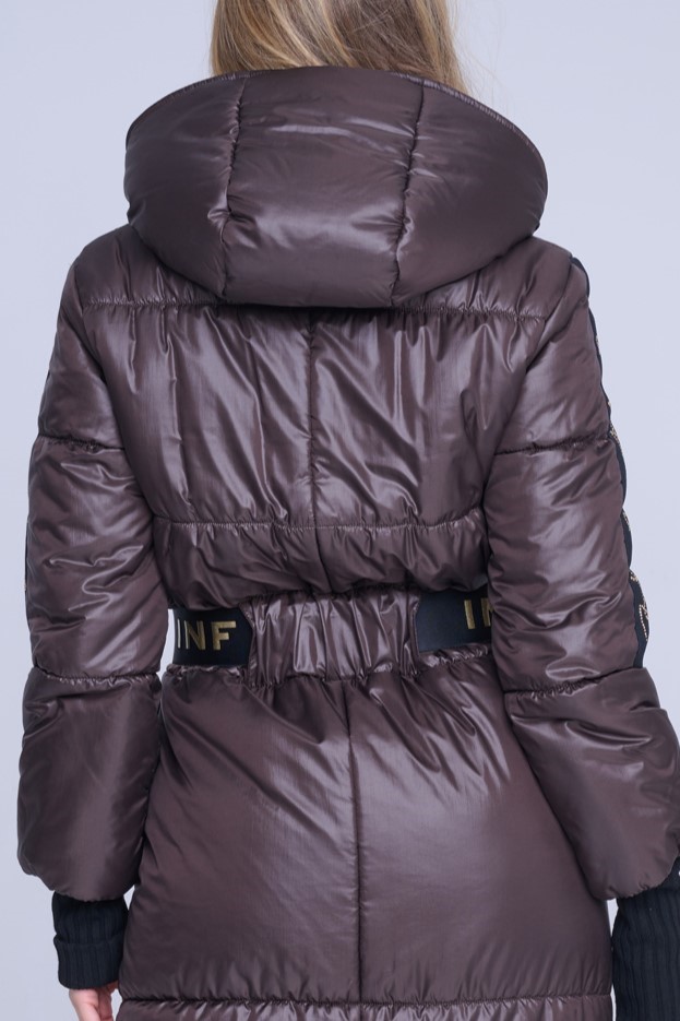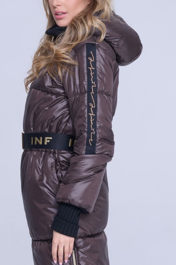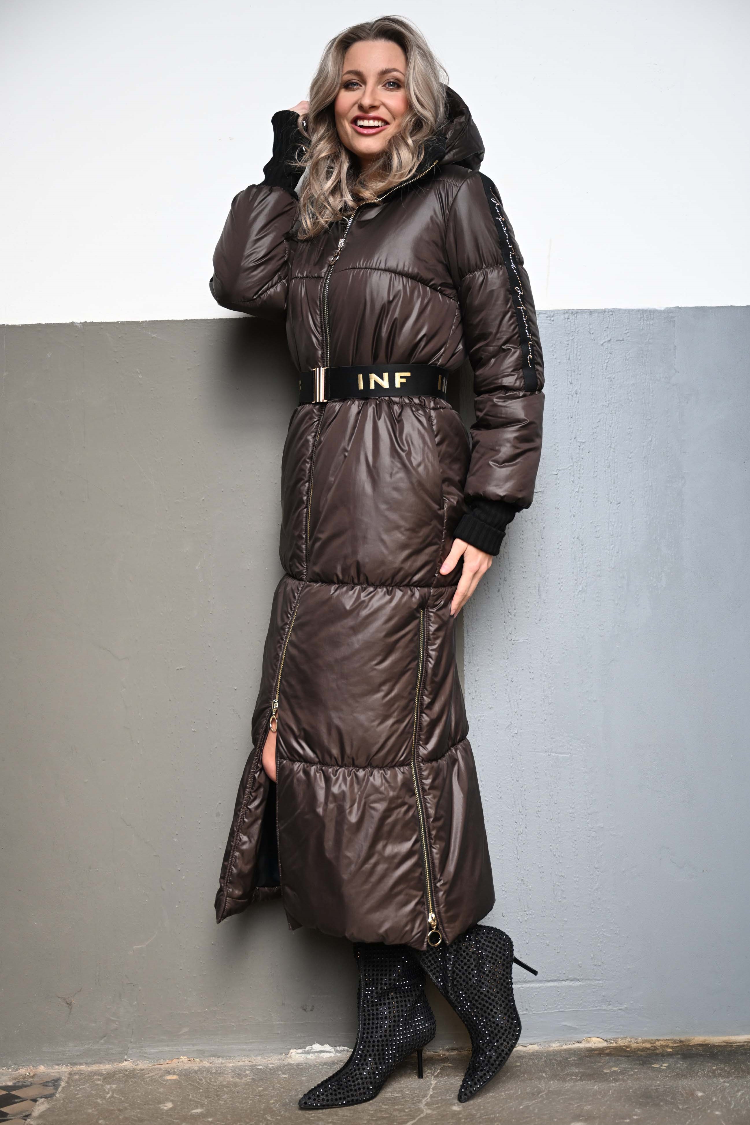 Luxusní zimní dlouhý prošívaný kabát. Na rukávech efektní lampas s motivem Infinite ze zlatých krystalů Preciosa. Zlaté doplňky. Žebrové náplety ve výstřihu a v délce rukávů. Uvnitř bundy hřejivé, měkké rouno. Příjemné na nošení. Tento kabát si obléknete a nebudete chtít sundat.