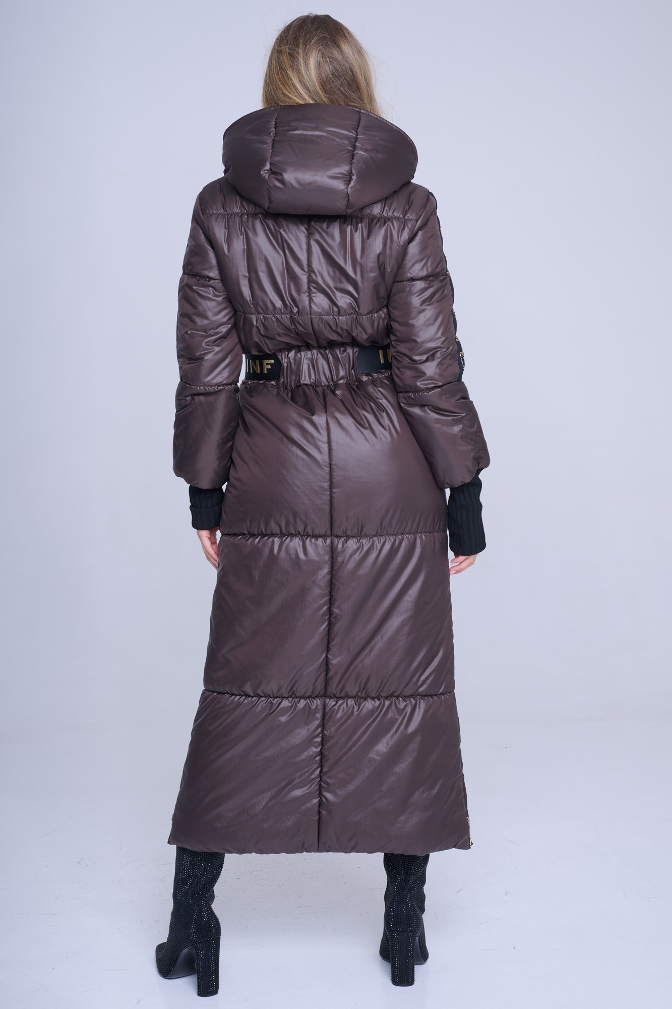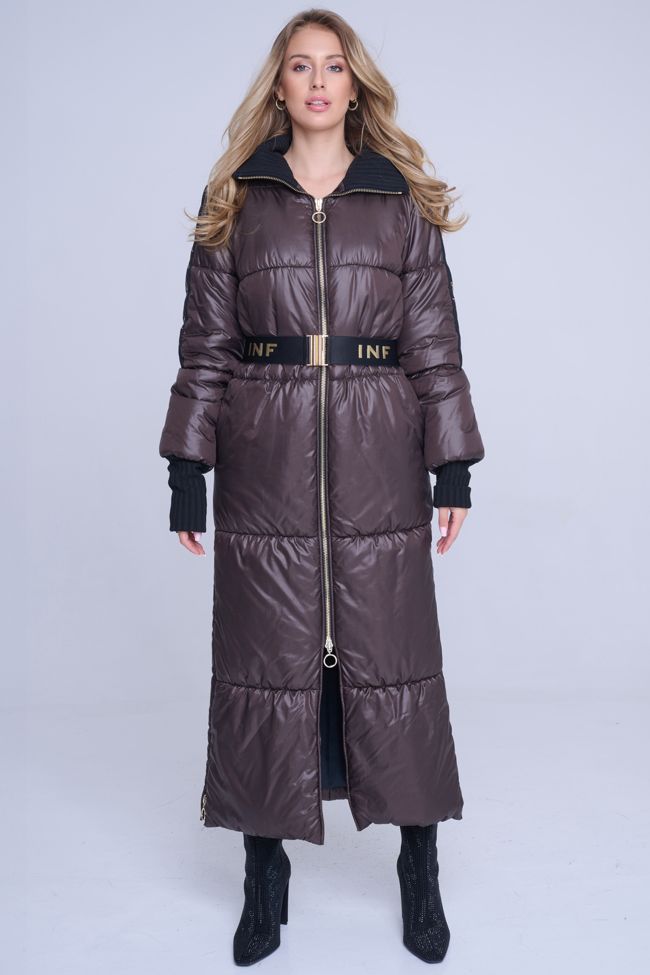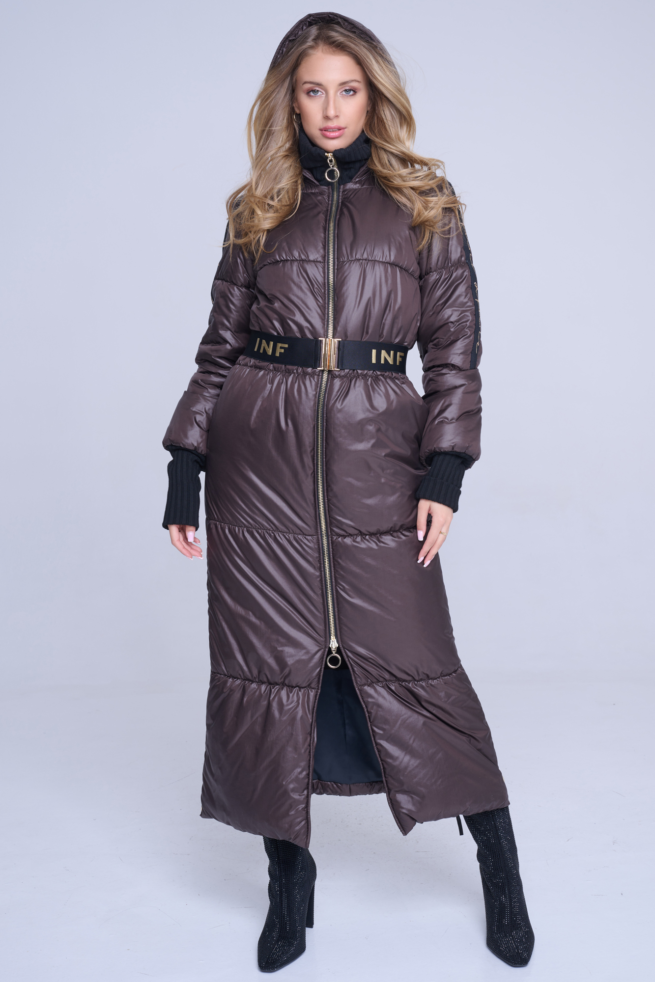 Luxusní zimní dlouhý prošívaný kabát. Na rukávech efektní lampas s motivem Infinite ze zlatých krystalů Preciosa. Zlaté doplňky. Žebrové náplety ve výstřihu a v délce rukávů. Uvnitř bundy hřejivé, měkké rouno. Příjemné na nošení. Tento kabát si obléknete a nebudete chtít sundat.