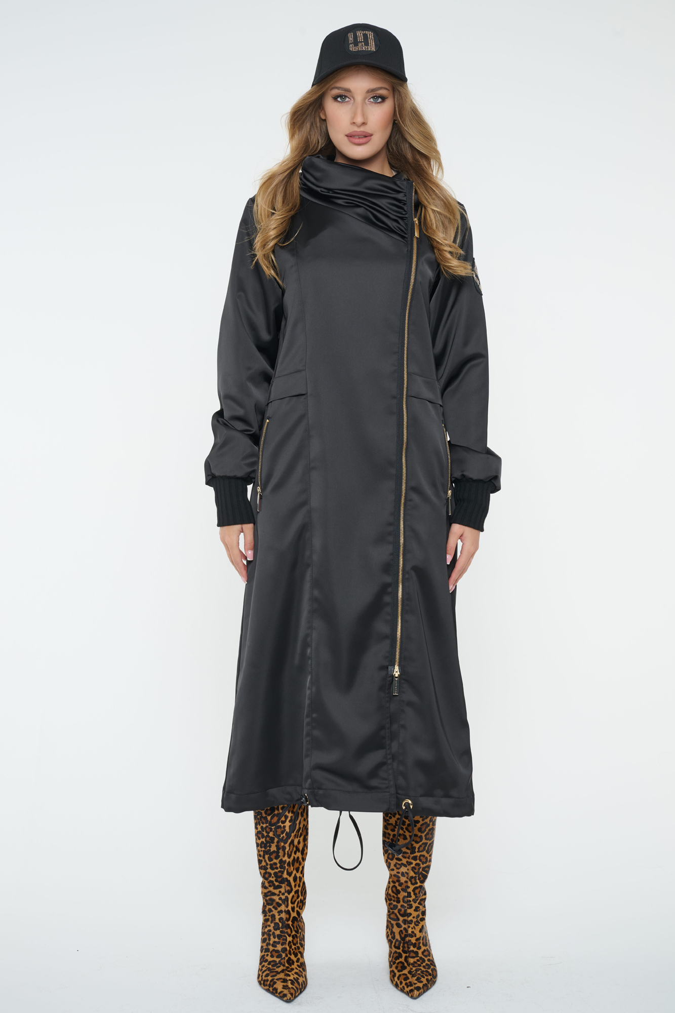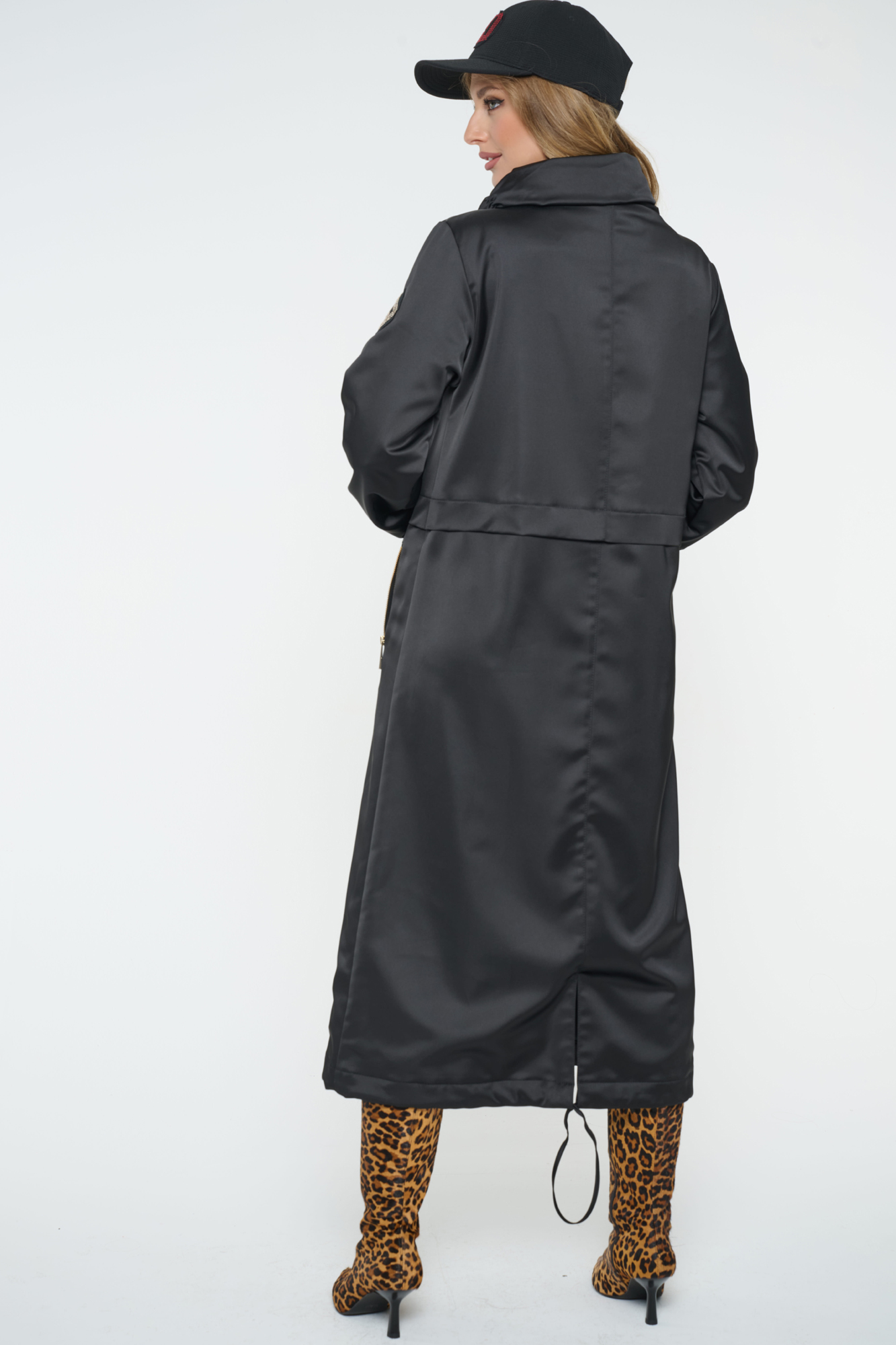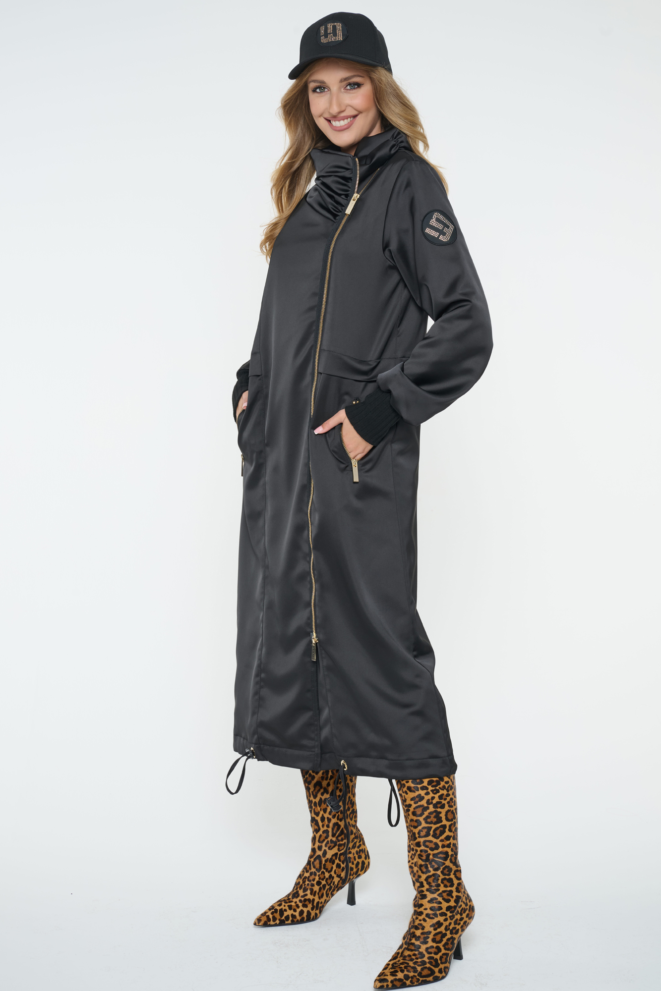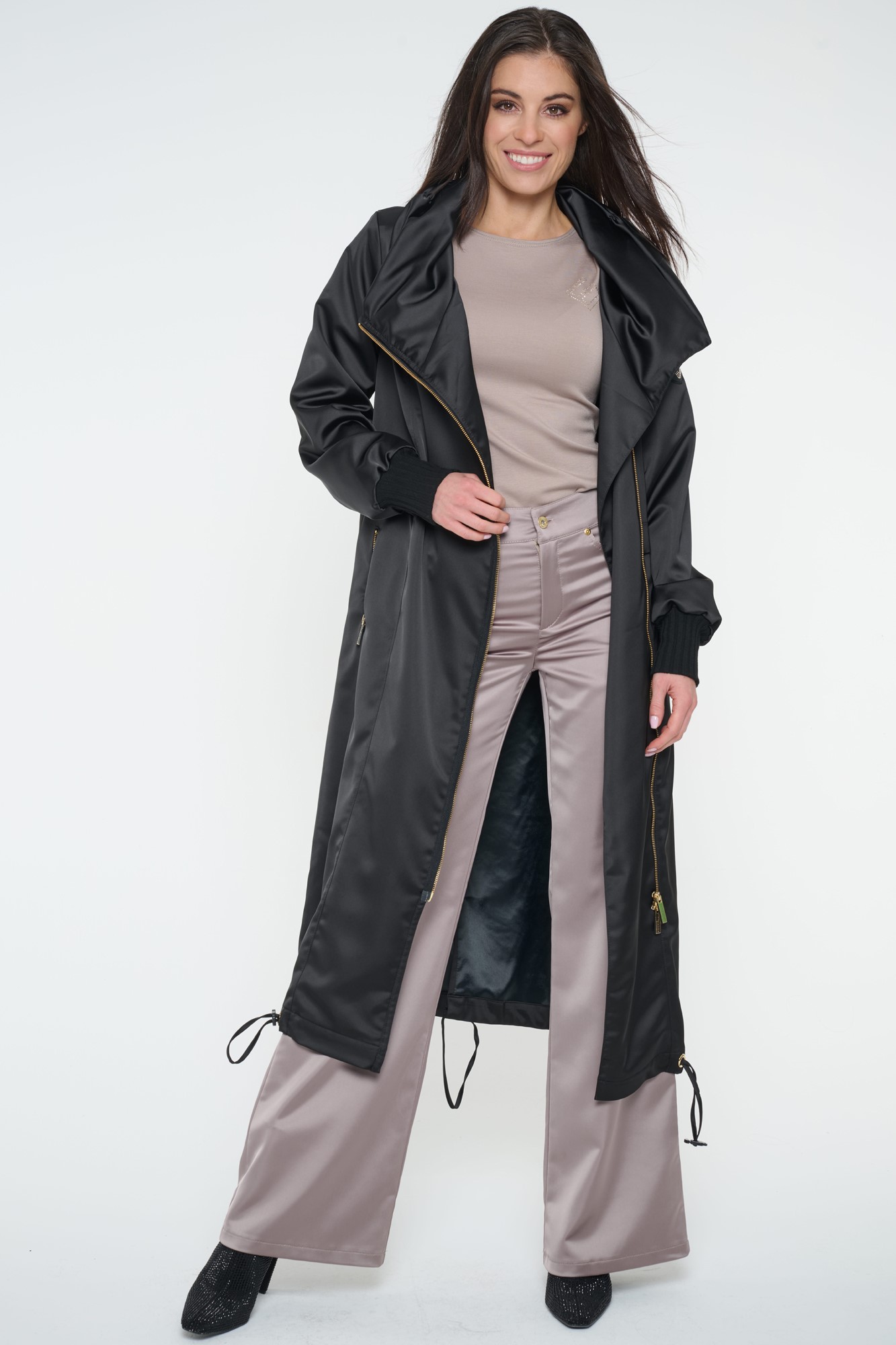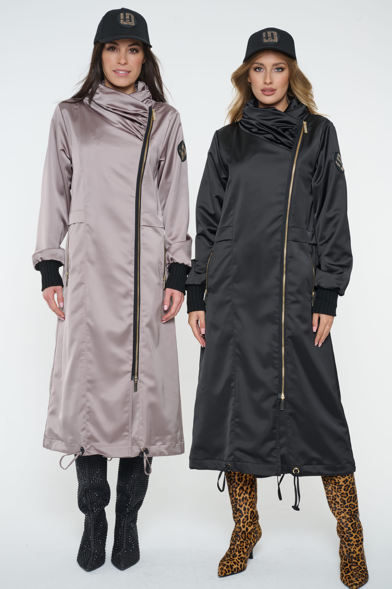 Luxusní jarní dlouhý kabát Infinite. Nášivka s logem INF ze zlatých krystalů Preciosa. Zlaté zipy. Manžety z úpletu "rib".