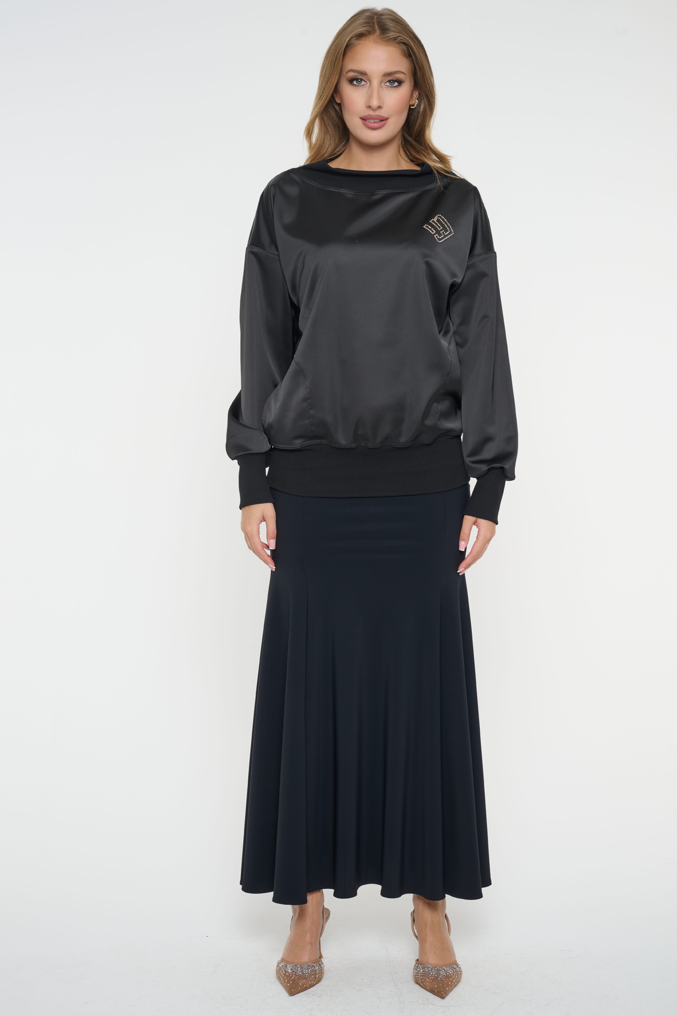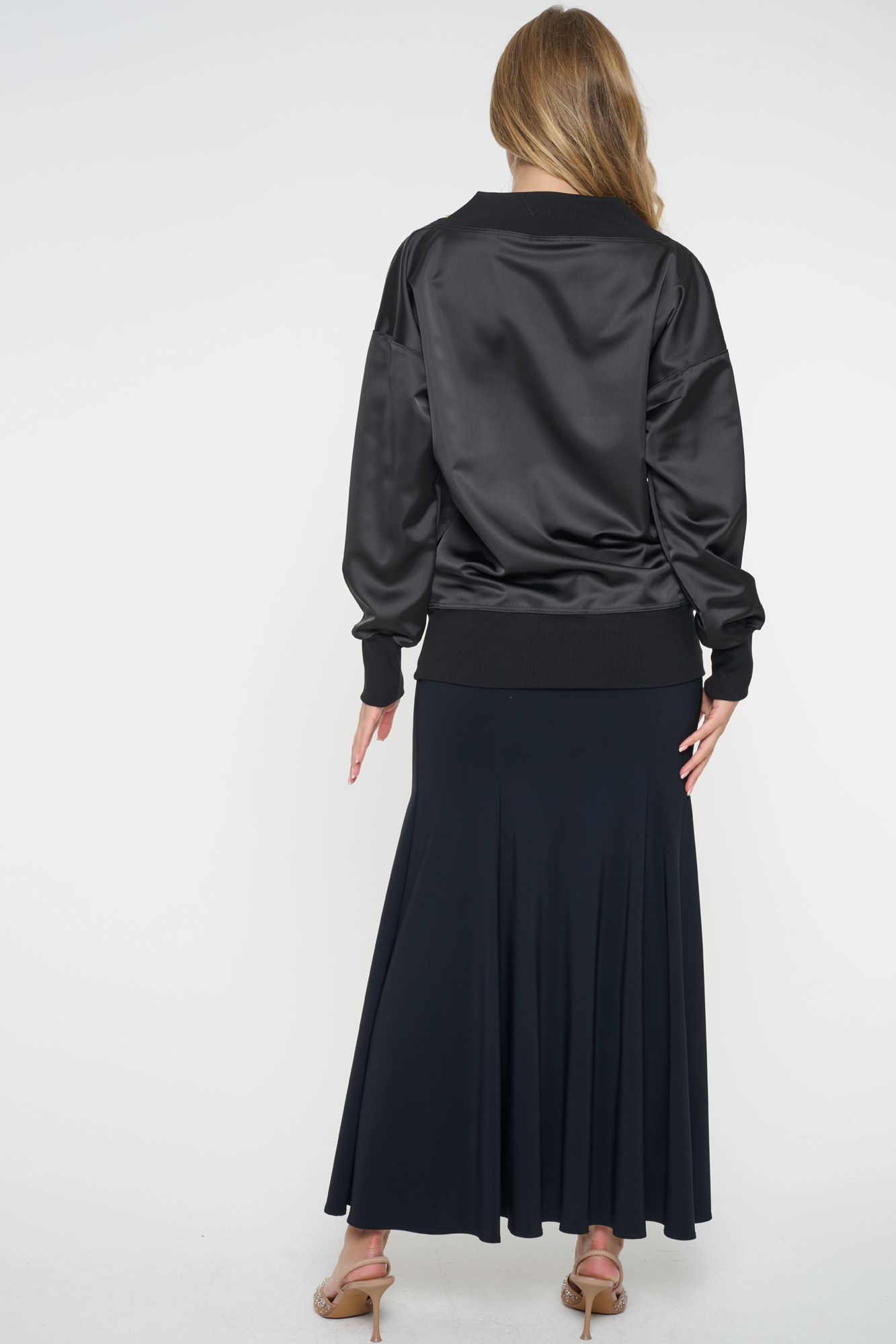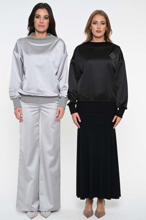 Luxusní mikina Infinite ze saténu v kombinaci s "rib" úpletem ve výstřihu a na manžetách. Na předním díle logo INf ze zlatých krystalů Preciosa. Na ramenech zlaté otevíratelné zipy.