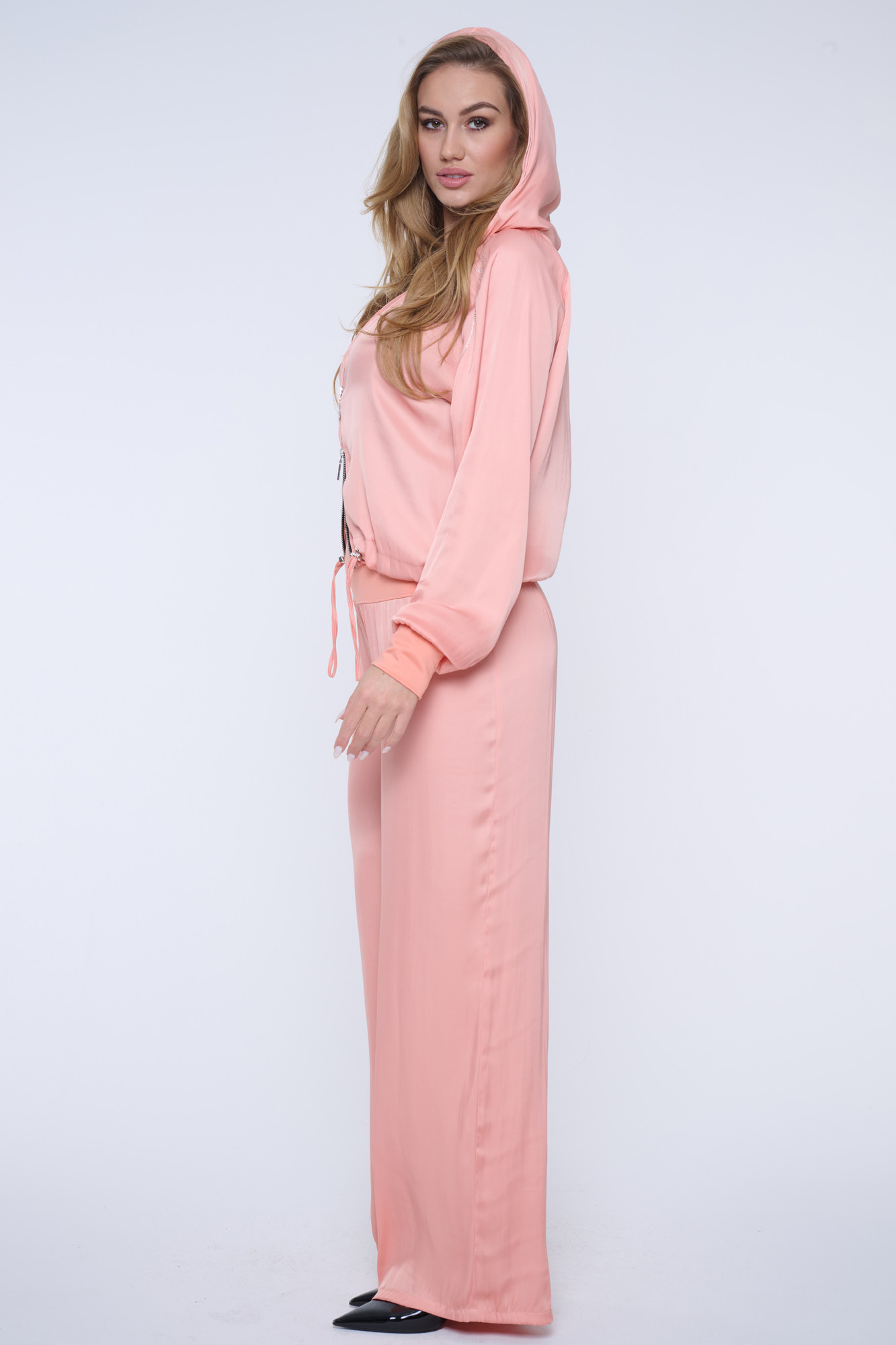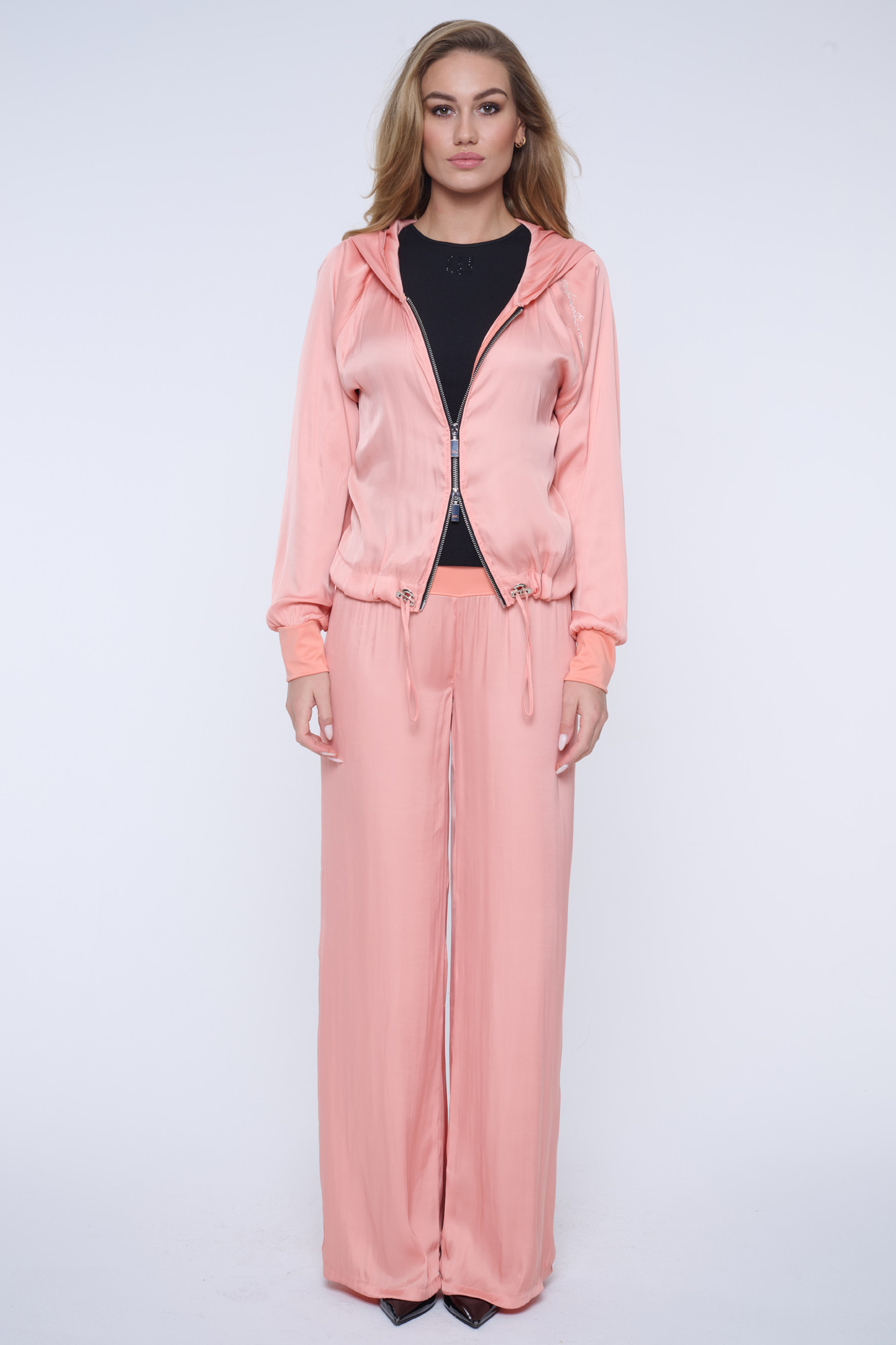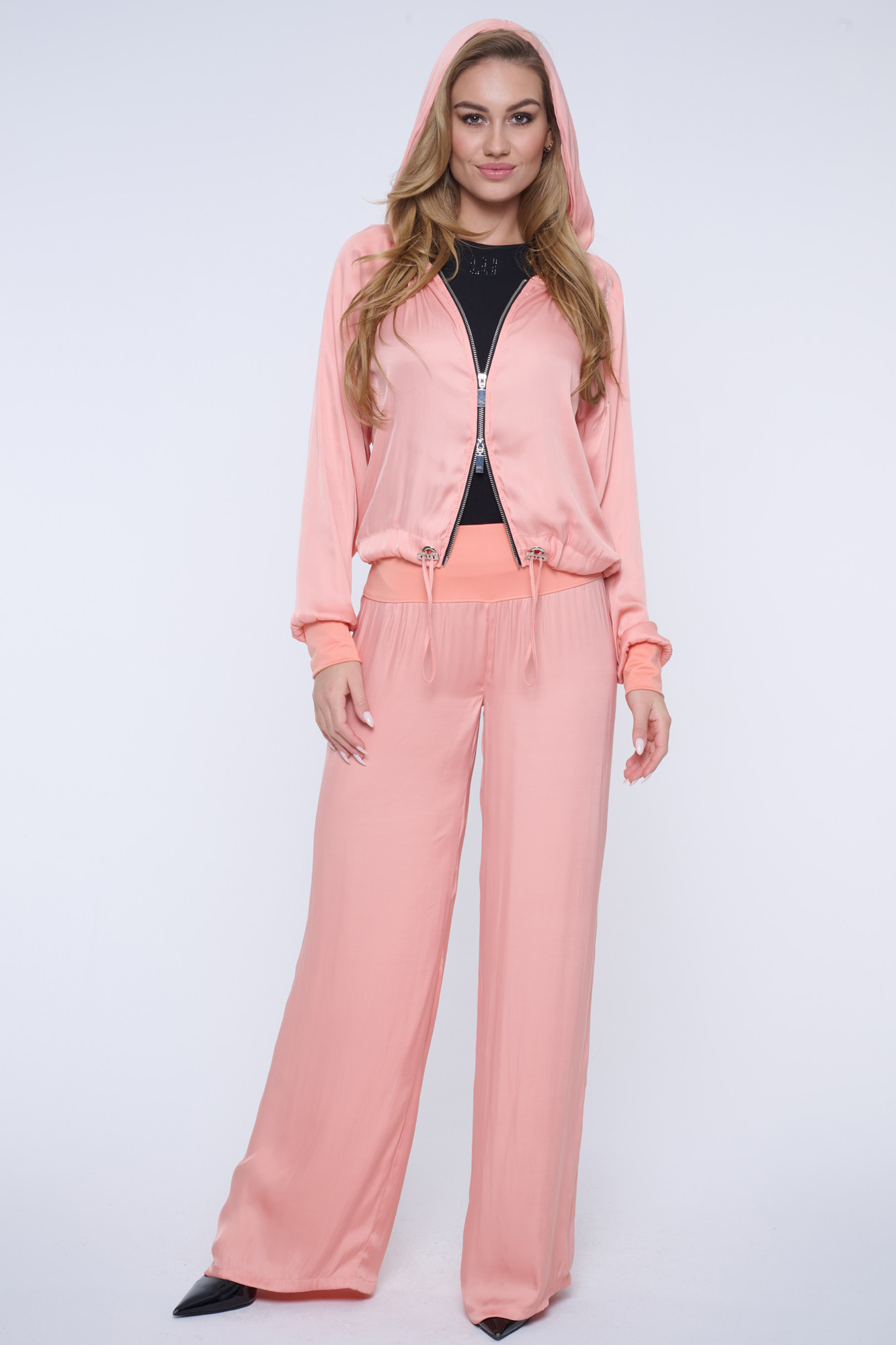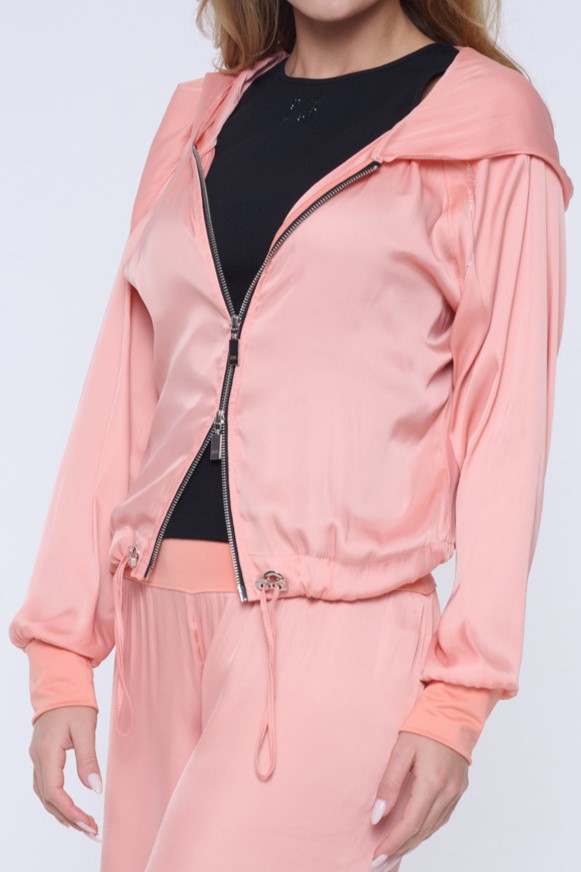 Černý letní "bomber" s kapucí z nového typu materiálu - odlehčeného saténu s memory efektem. Oboustranně dělitelný stříbrný zip. Na kapuci nápis Infinite ze stříbrných krystalů Preciosa.