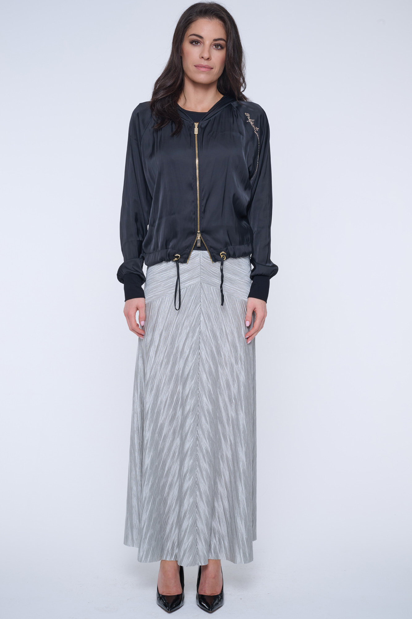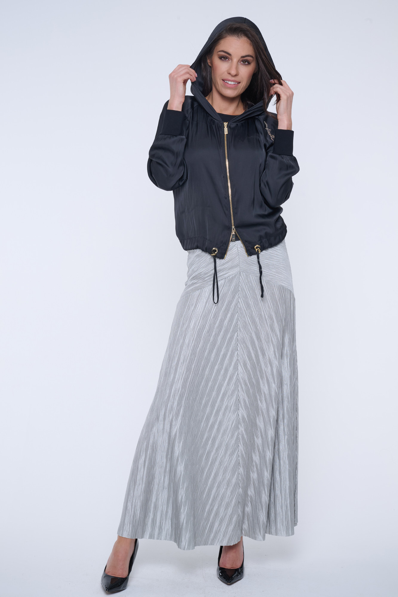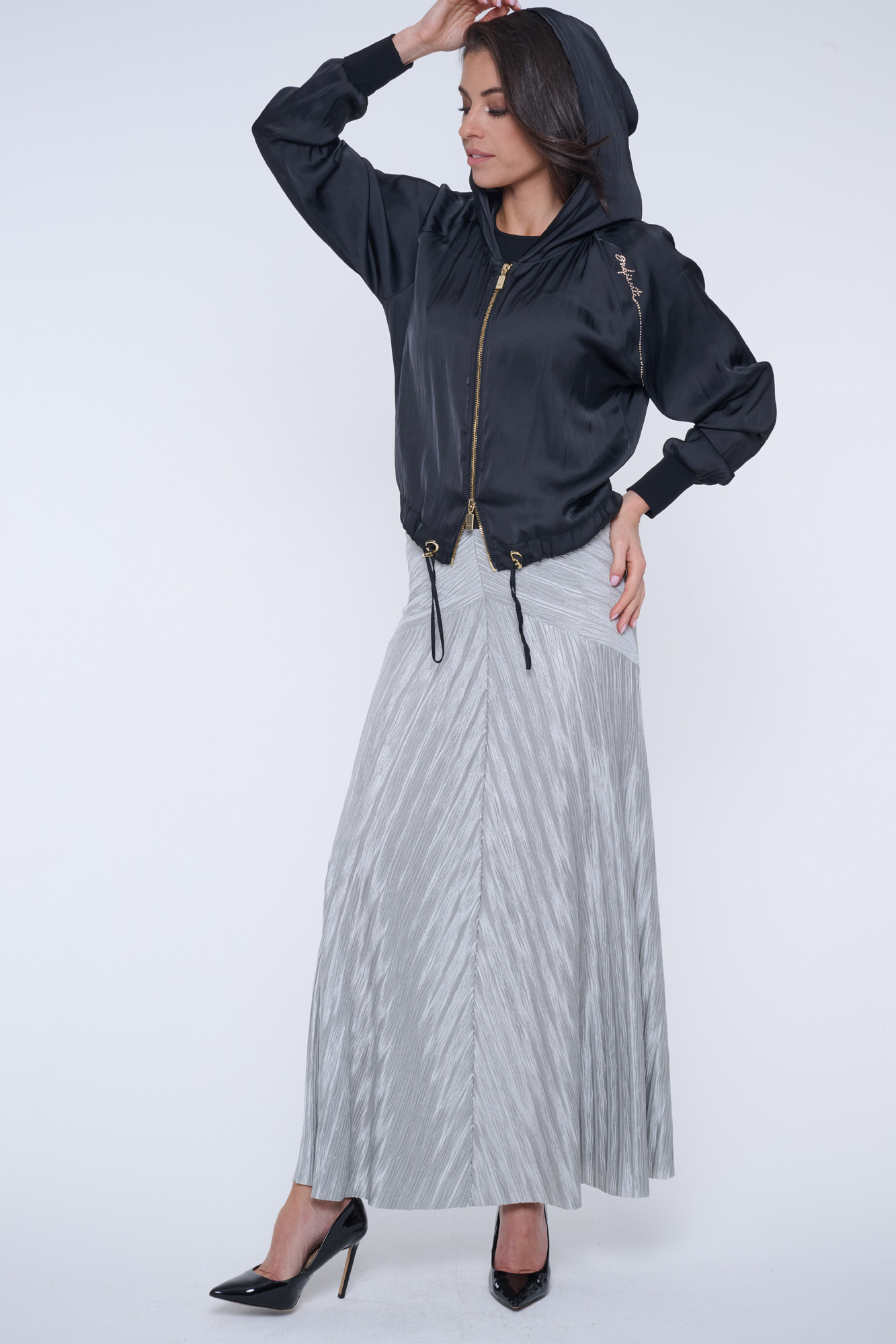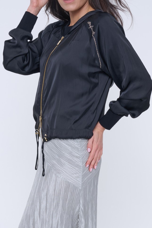 Černý letní "bomber" s kapucí z nového typu materiálu - odlehčeného saténu s memory efektem. Na kapuci nápis Infinite ze zlatých krystalů Preciosa.